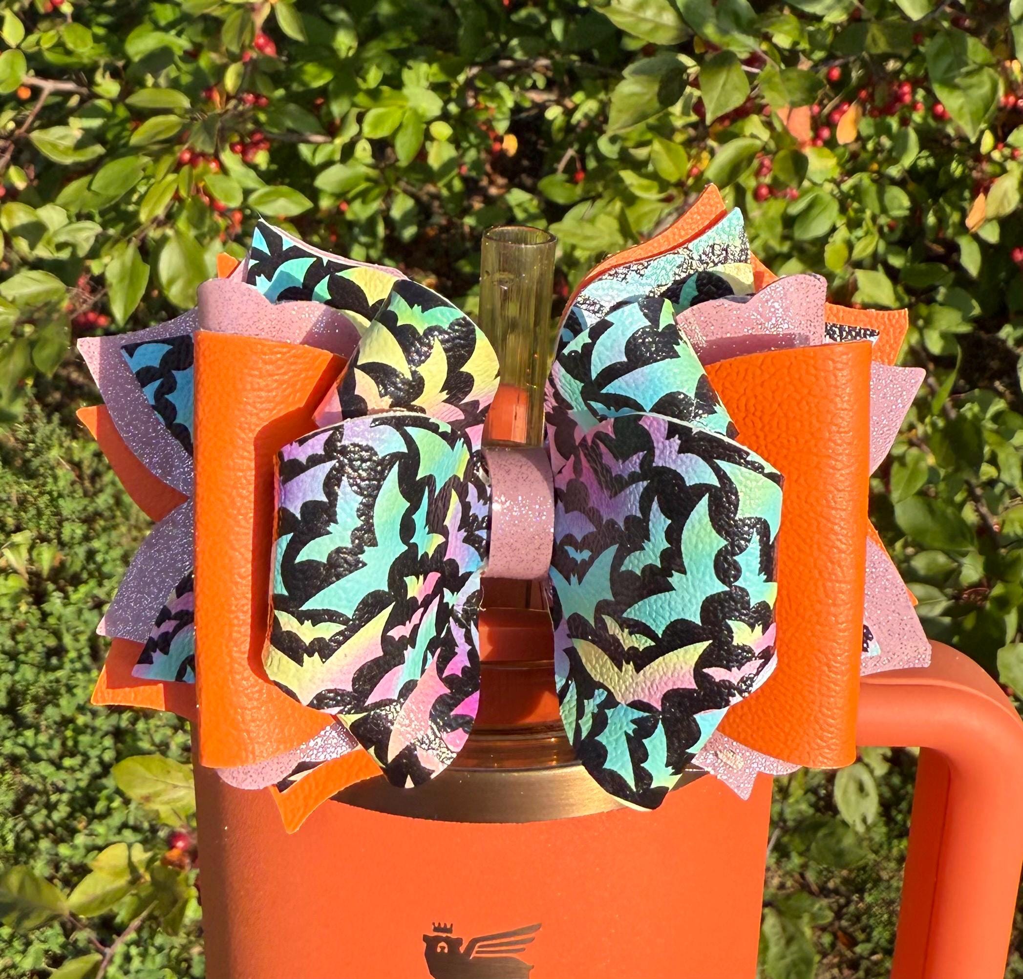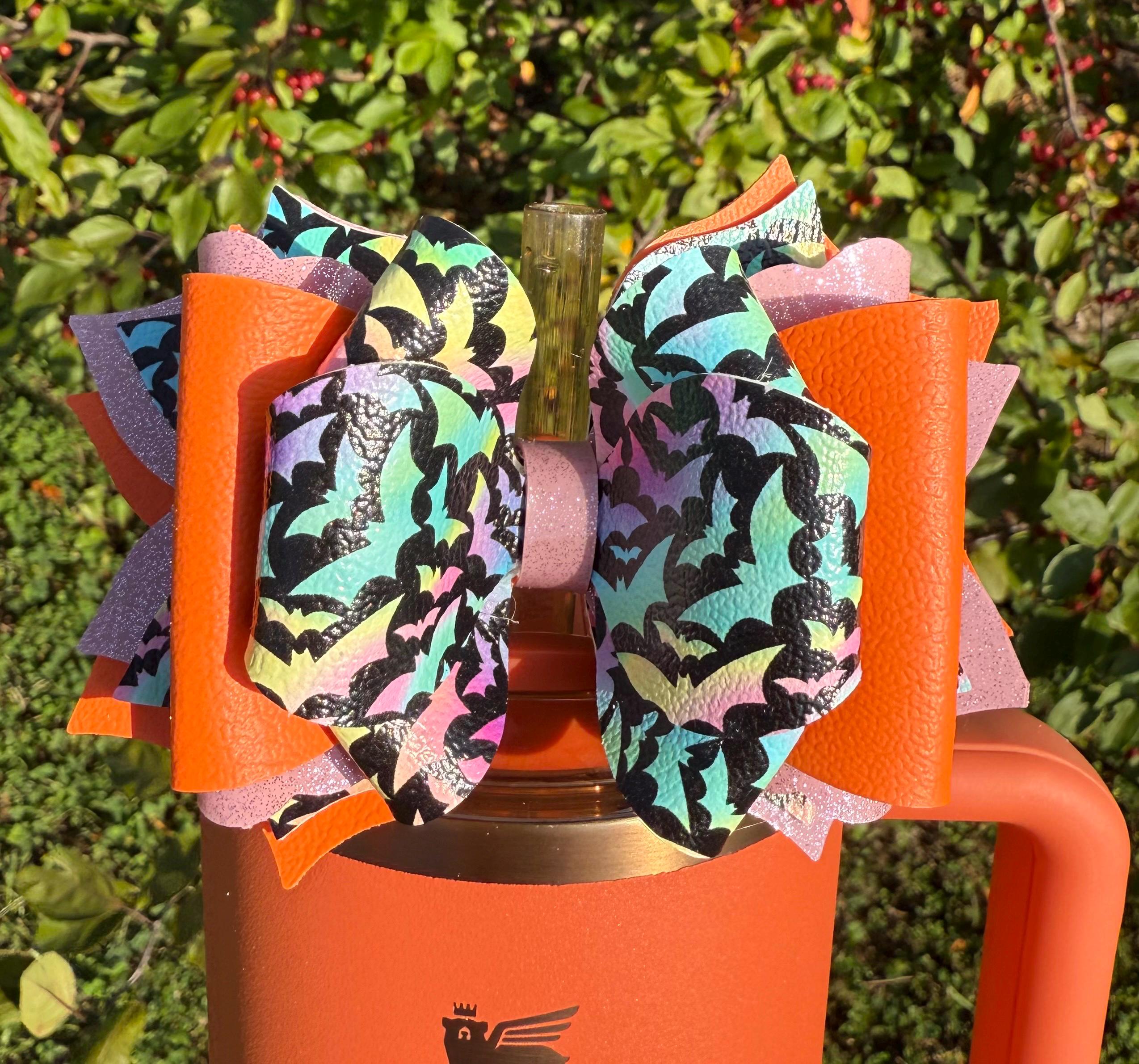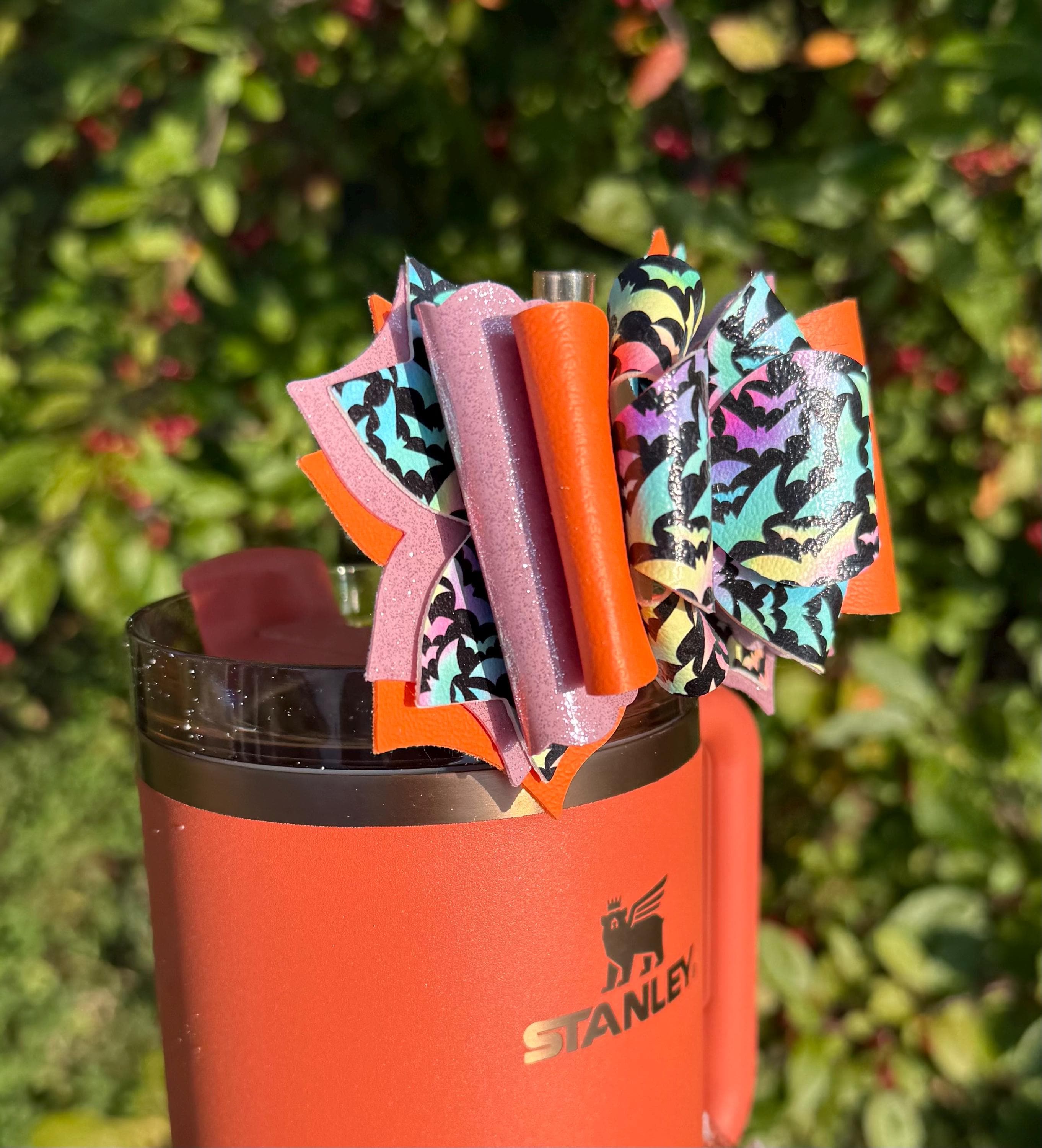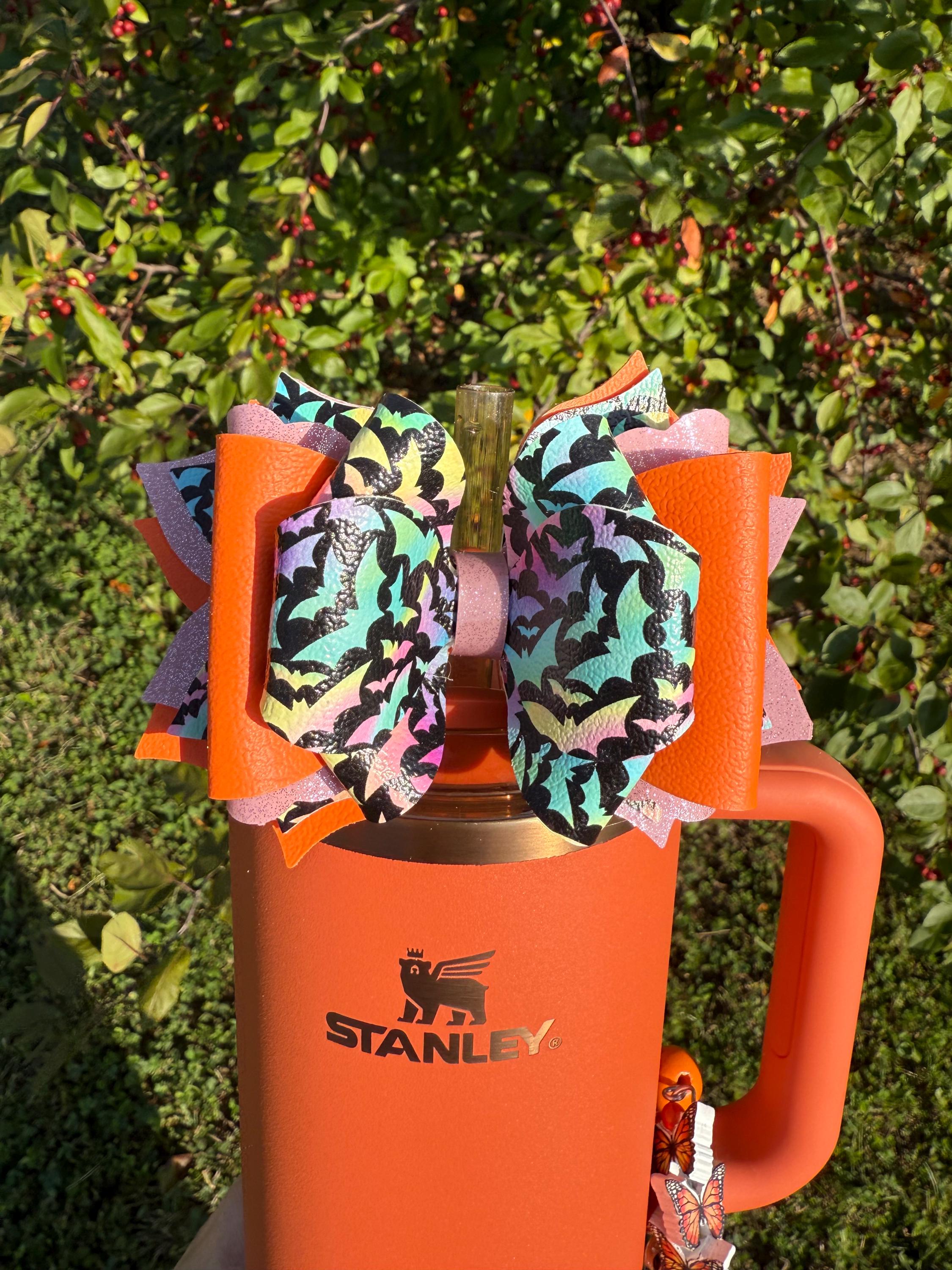 Handmade, 6 layer, fall / Halloween themed tumbler bow. Acrylic ring attachment fits 10mm straws.