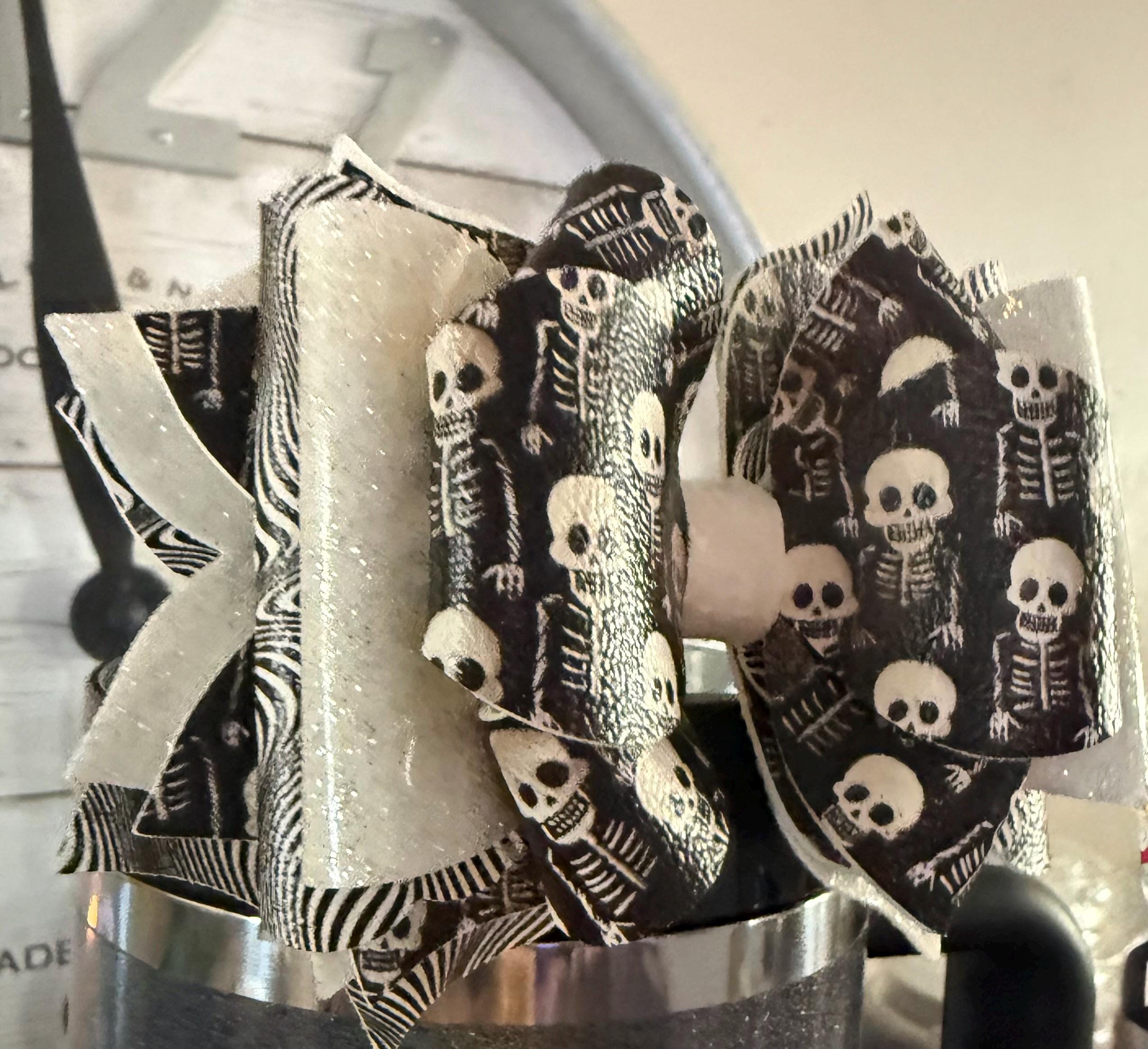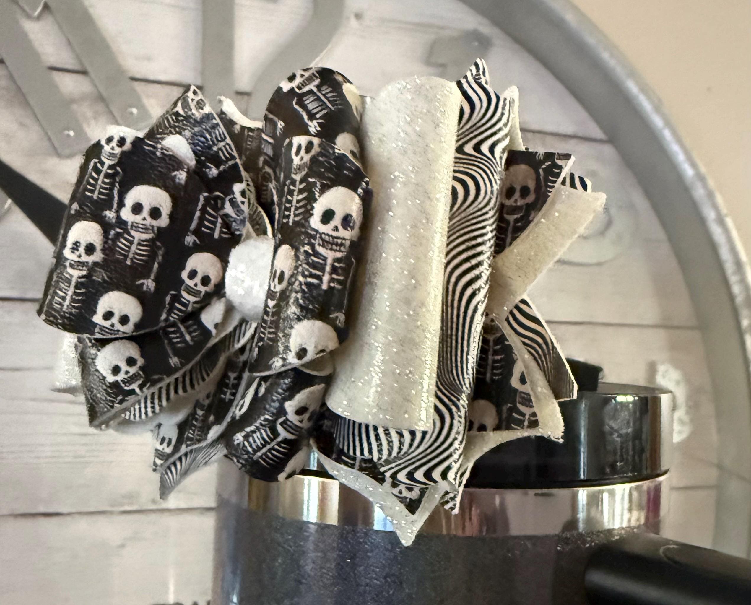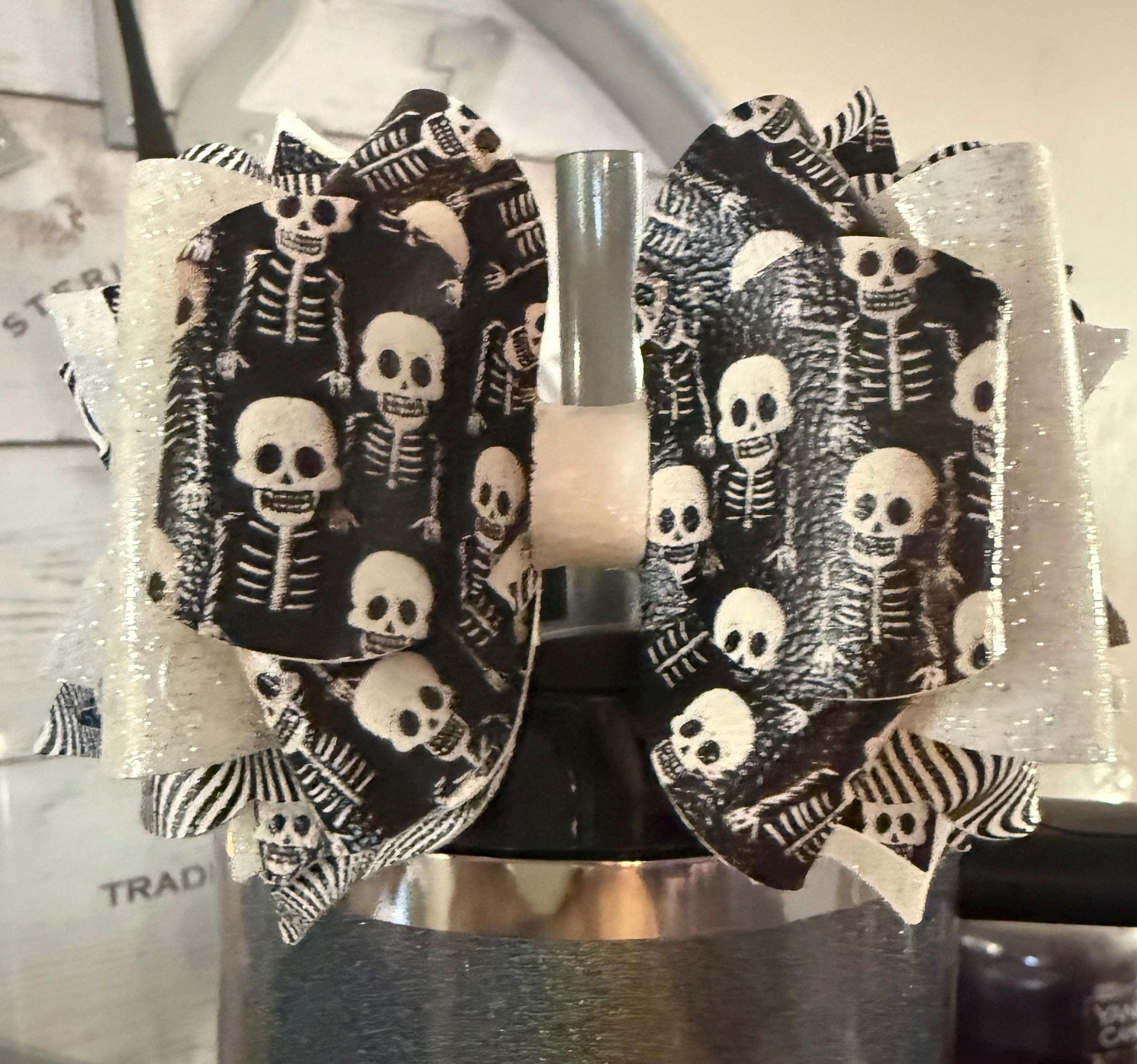 ✨ Details: • Handmade with premium faux leather and glitter vinyl • Features black skeleton print with glitter white layers • Lightweight and durable for daily use • Fits most tumbler straws (Stanley, Simple Modern, Hydrojug, etc.) • Approx. 4.5” wide • Each bow is handcrafted and one of a kind