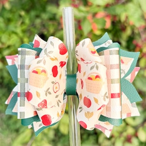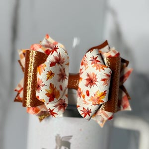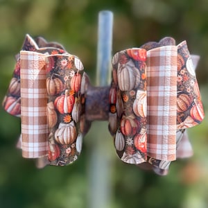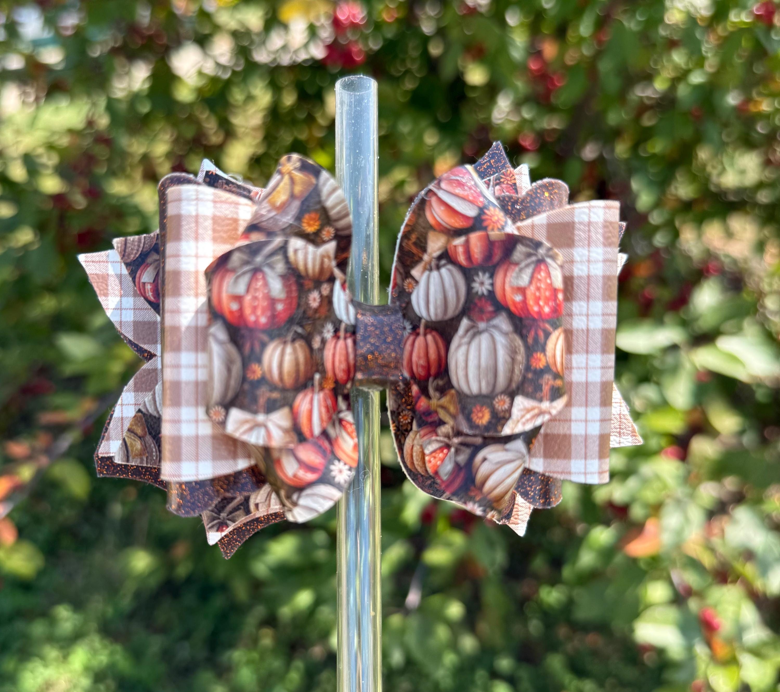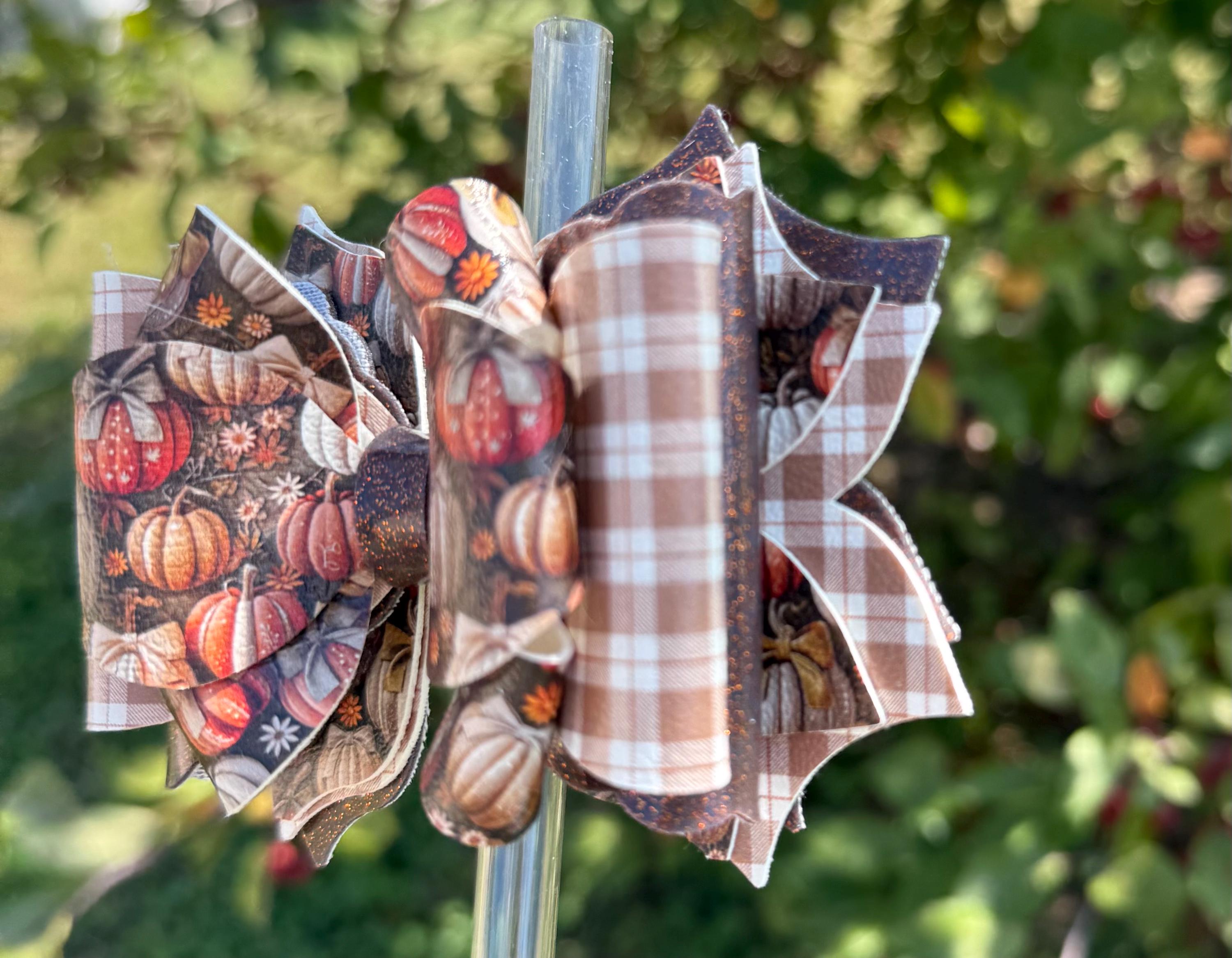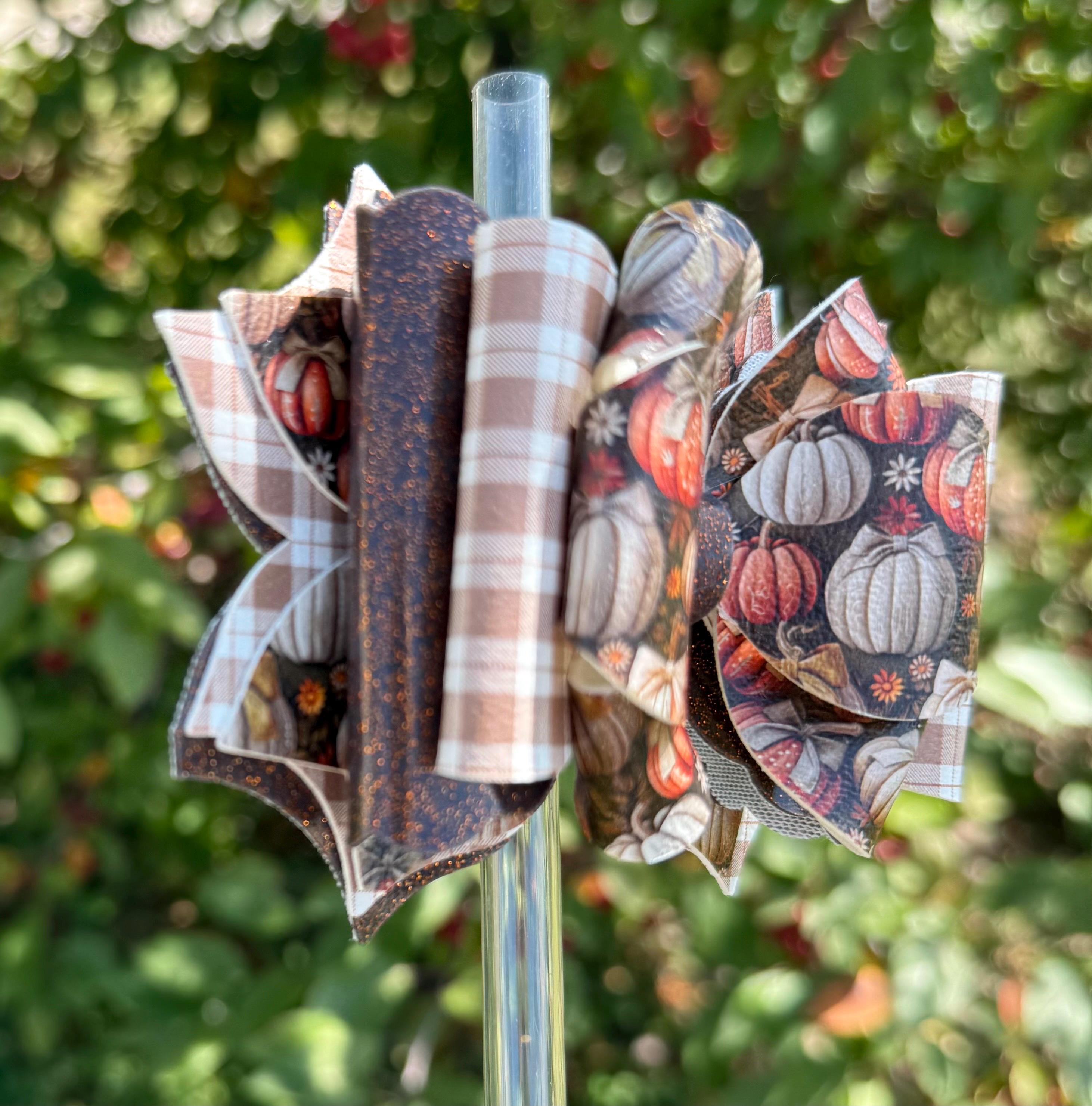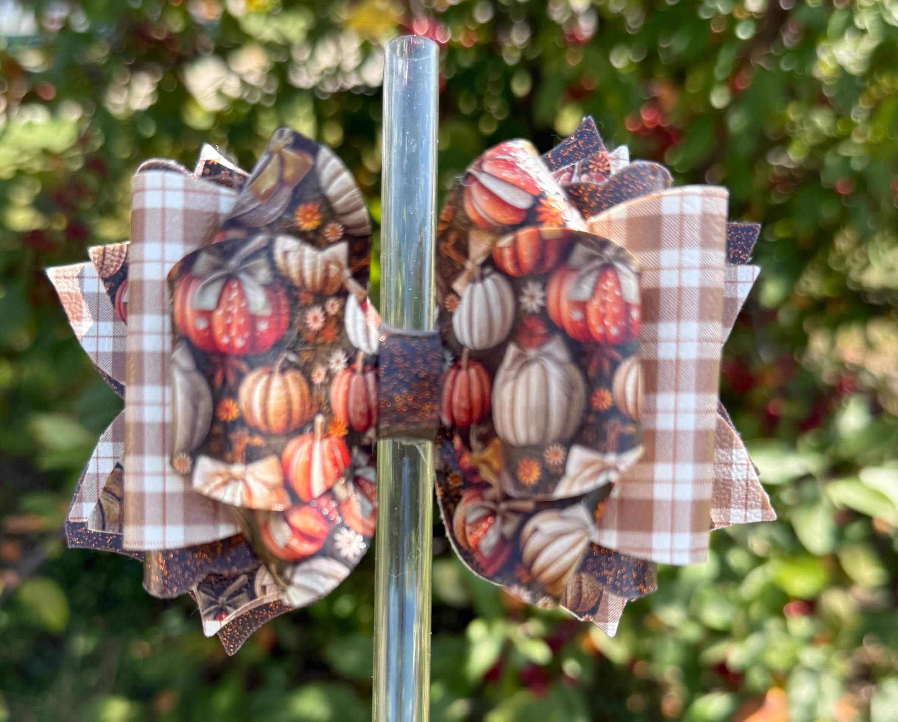 Handmade, 6 layer, fall / Halloween themed tumbler bow. Acrylic ring attachment fits 10mm straws.