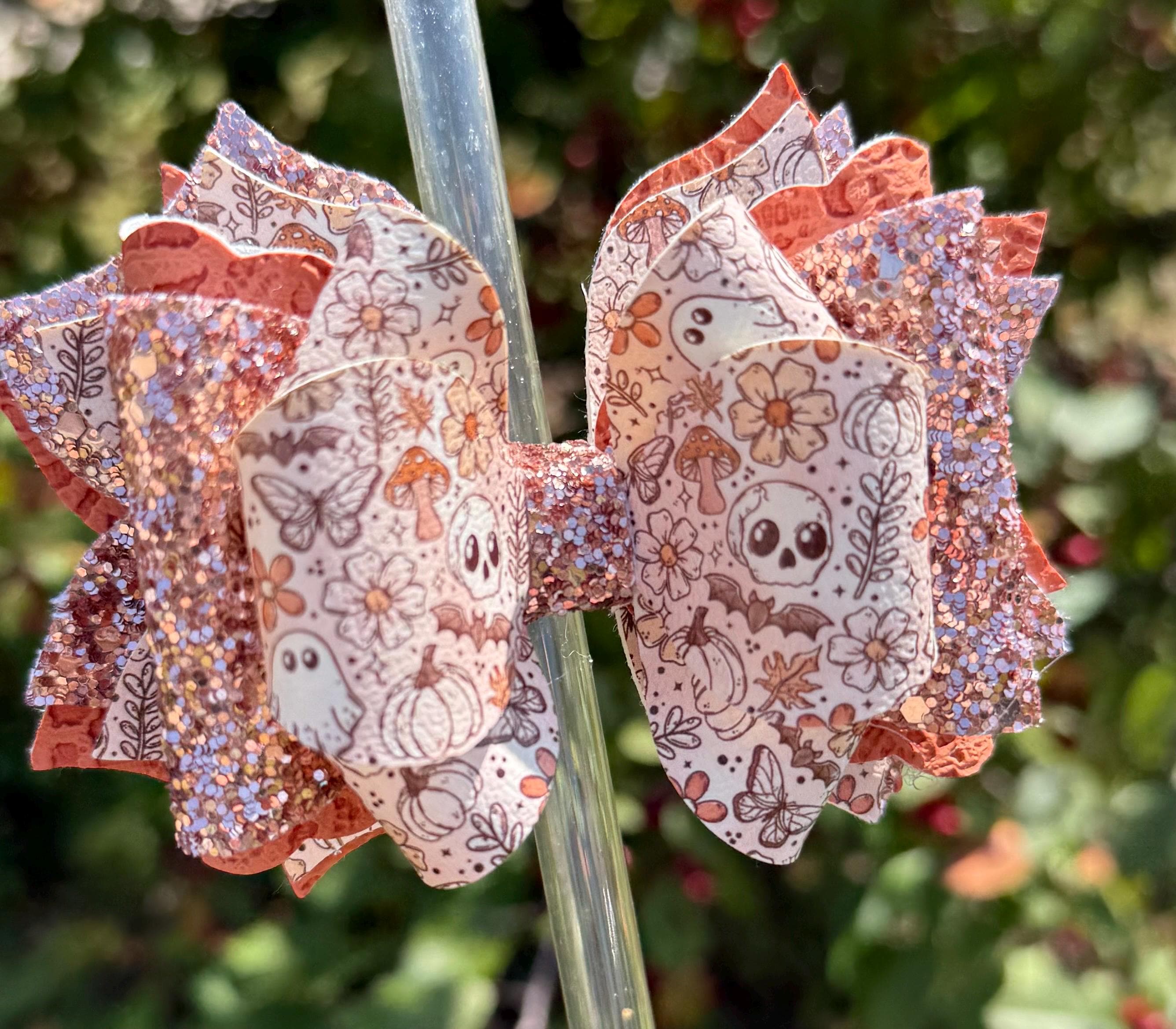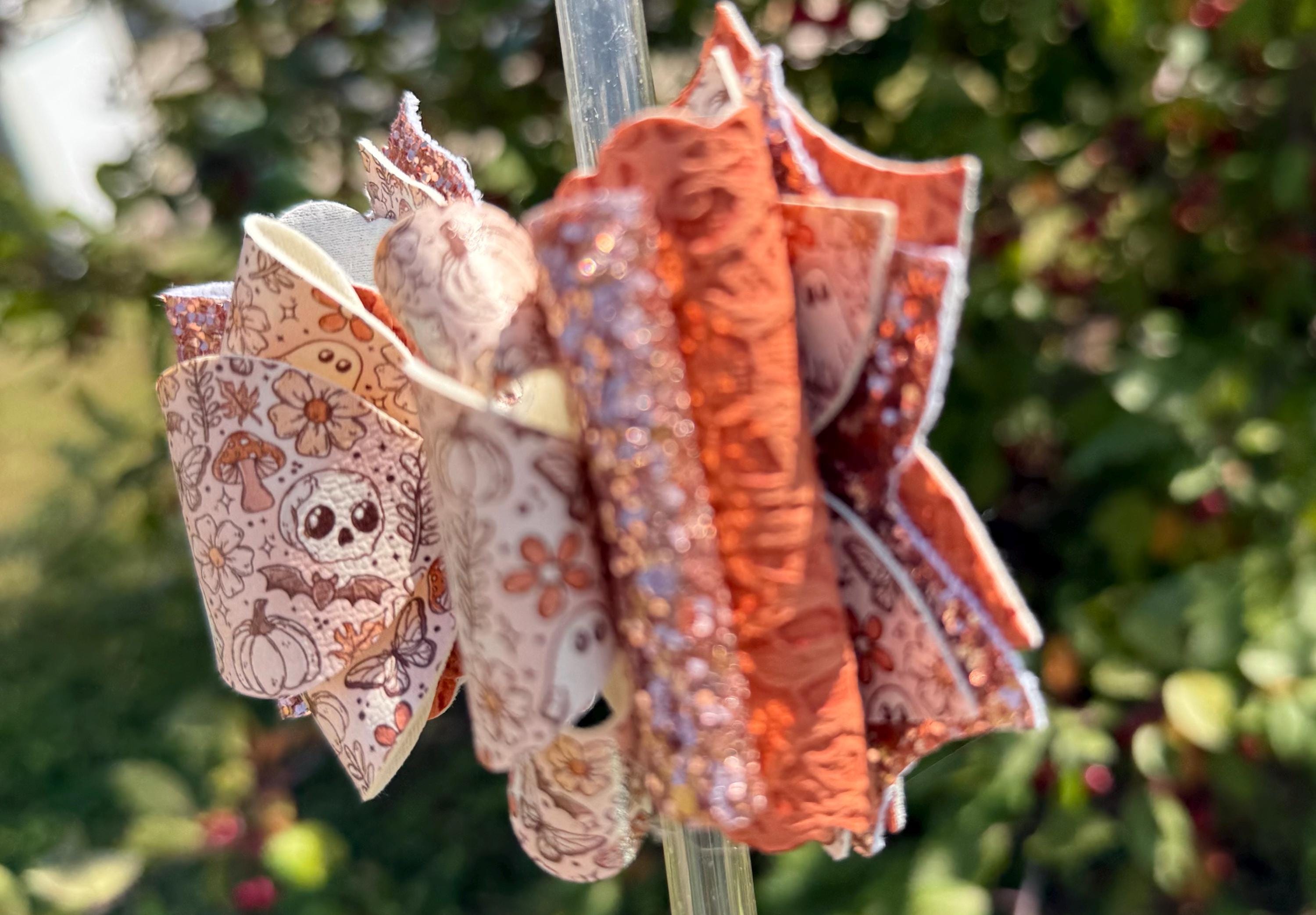 Handmade, 6 layer, fall / Halloween themed tumbler bow. Acrylic ring attachment fits 10mm straws.
