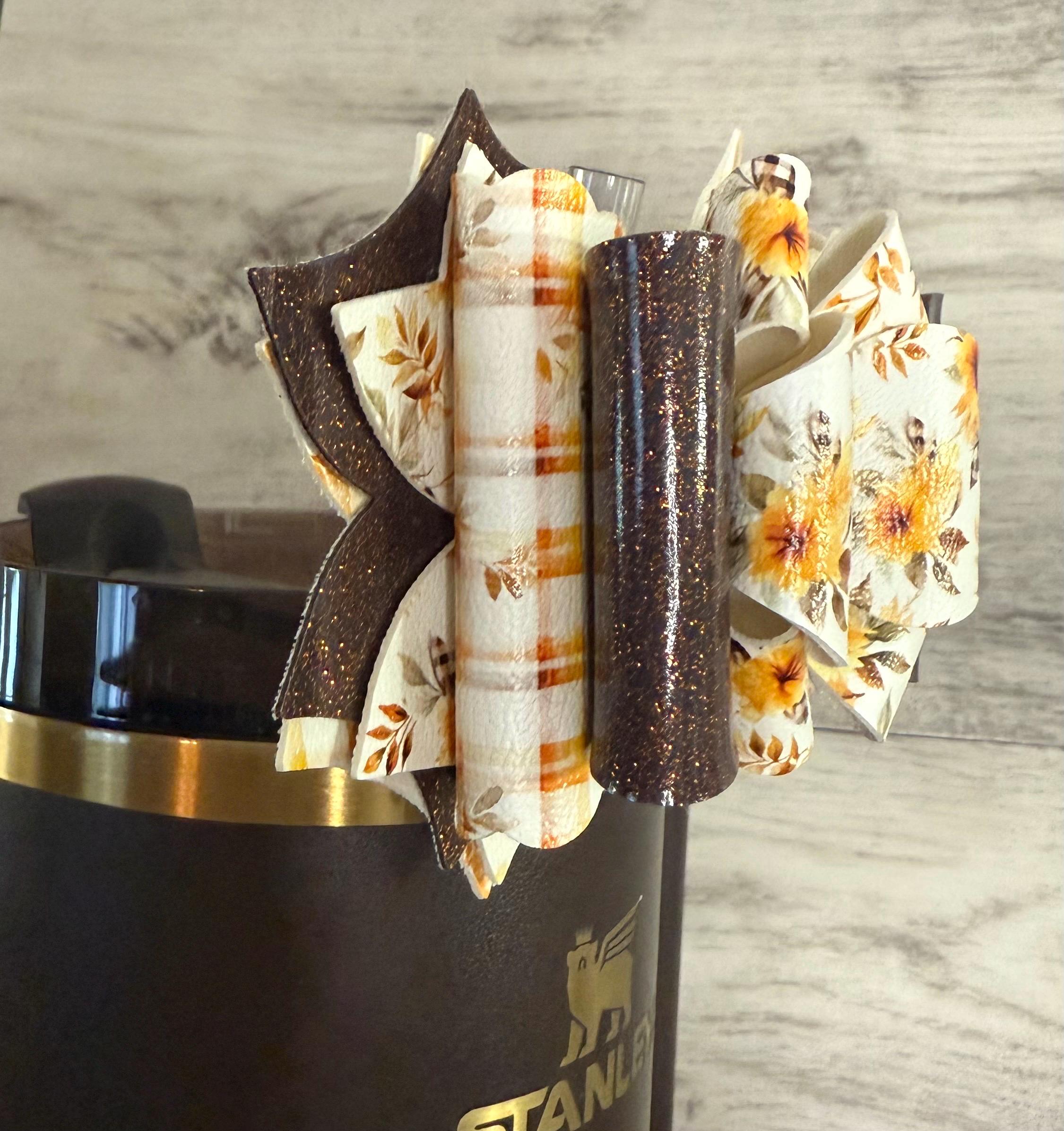 Handmade, 6 layer, fall / Halloween themed tumbler bow. Acrylic ring attachment fits 10mm straws.