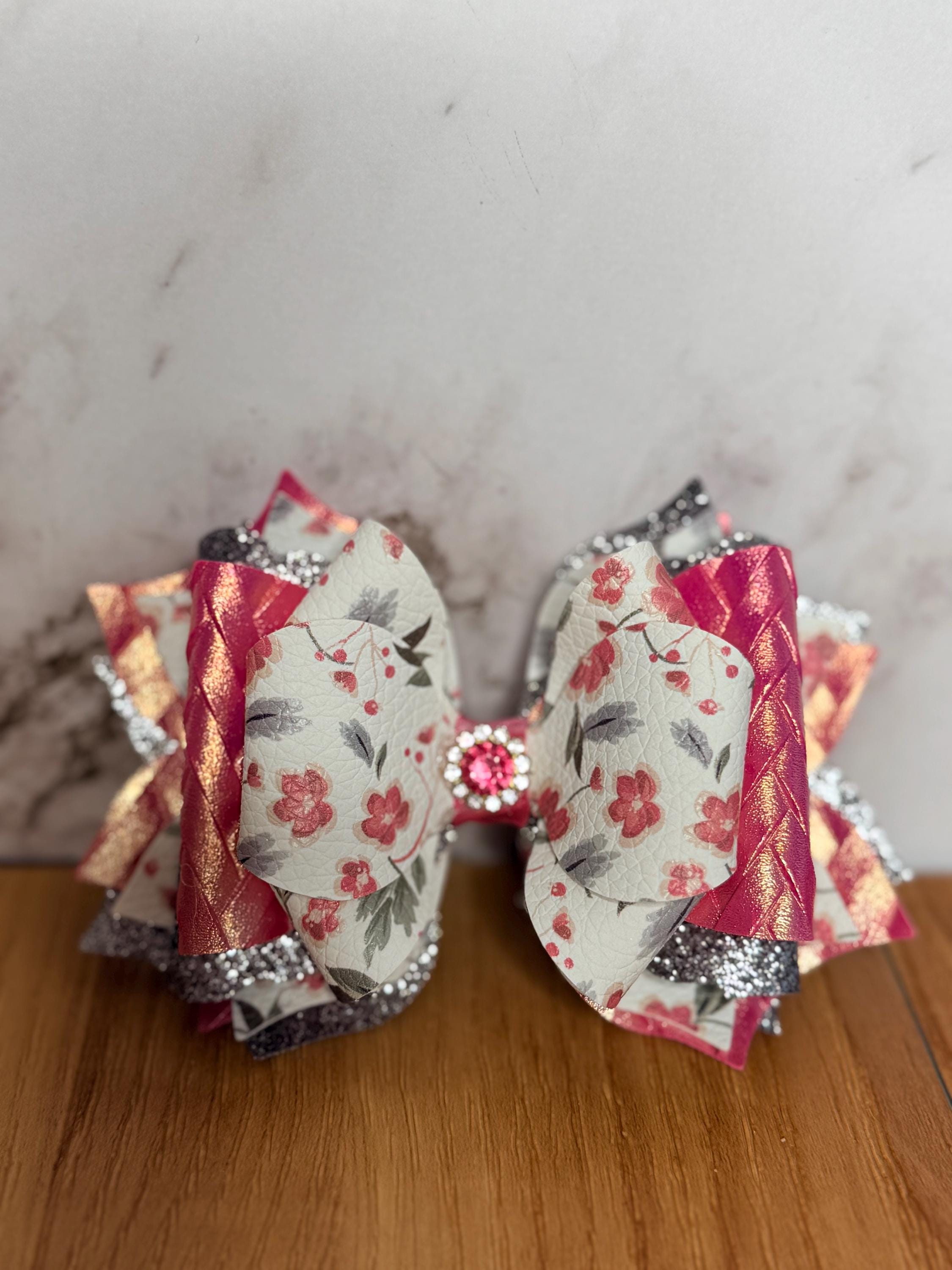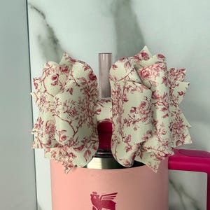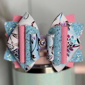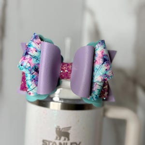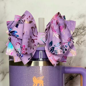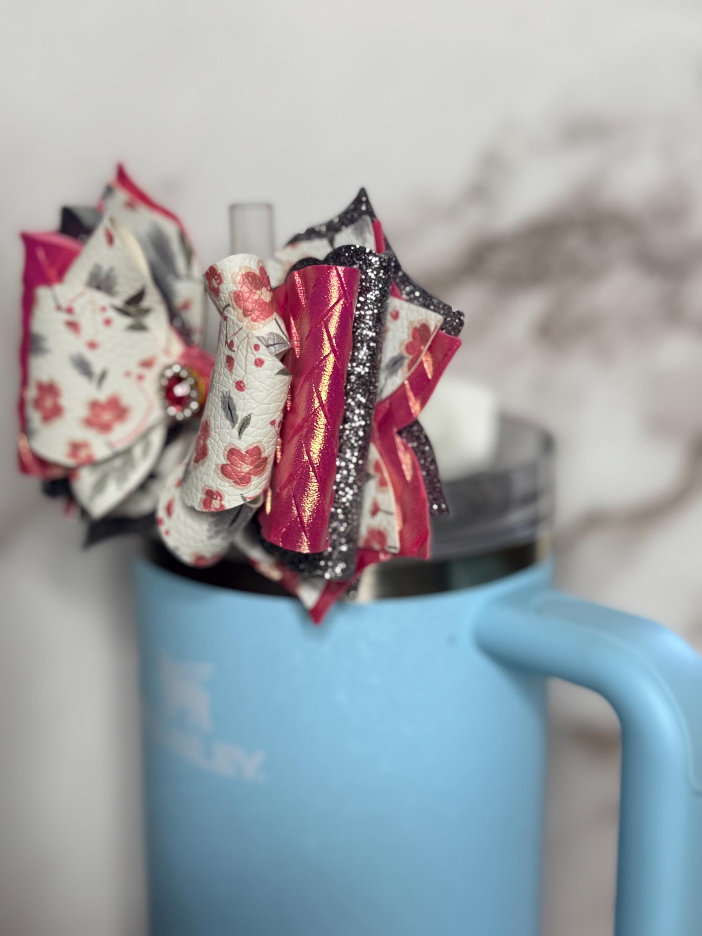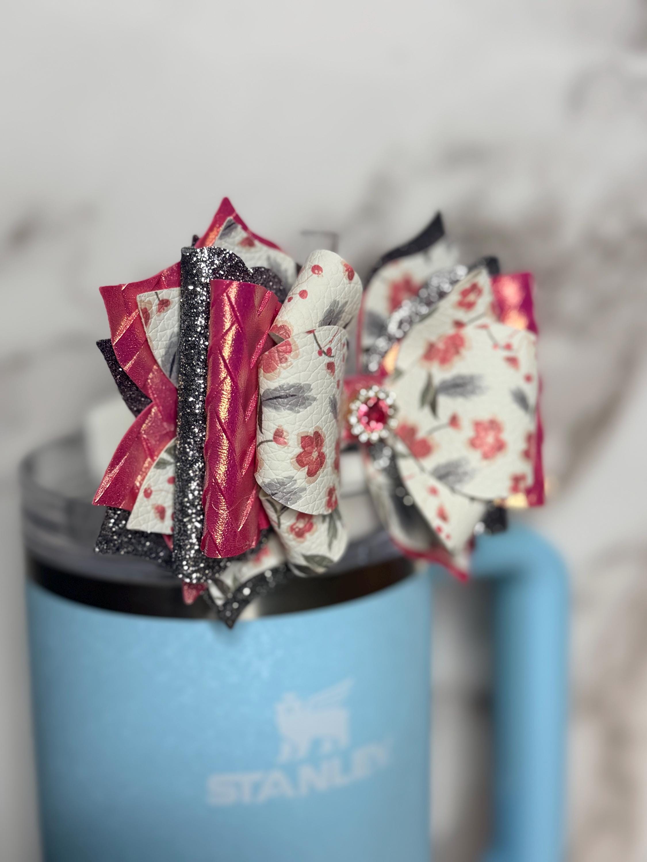 Handmade, 6 layer, 4.5 inch floral themed tumbler bow. Acrylic ring attachment fits 10mm straws.