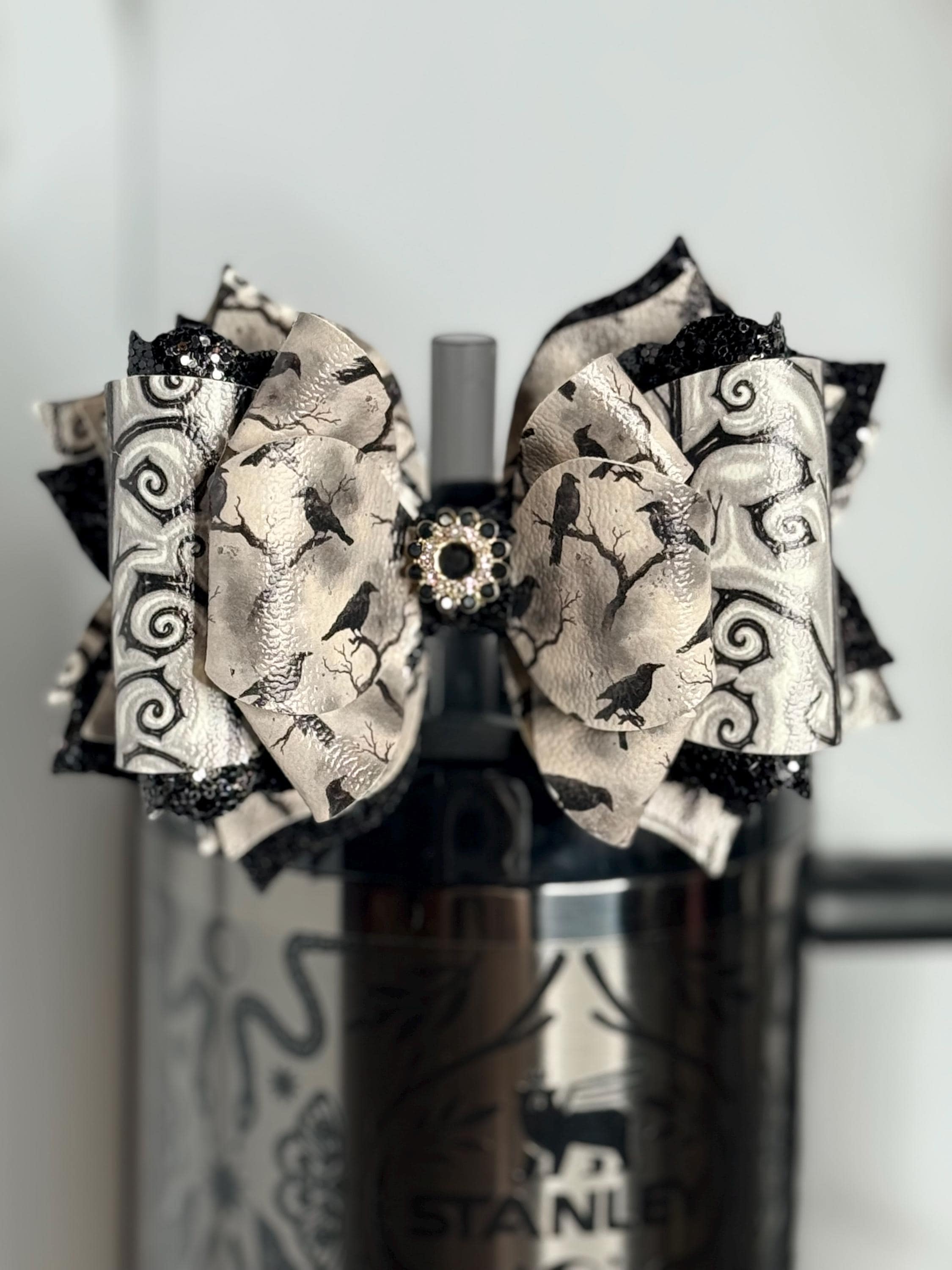 🎃 Add spooky charm to your tumbler with this 4.5” bow featuring ravens and eerie trees — the perfect Halloween cup accessory, gothic gift, or ready-to-ship party accent! 🖤