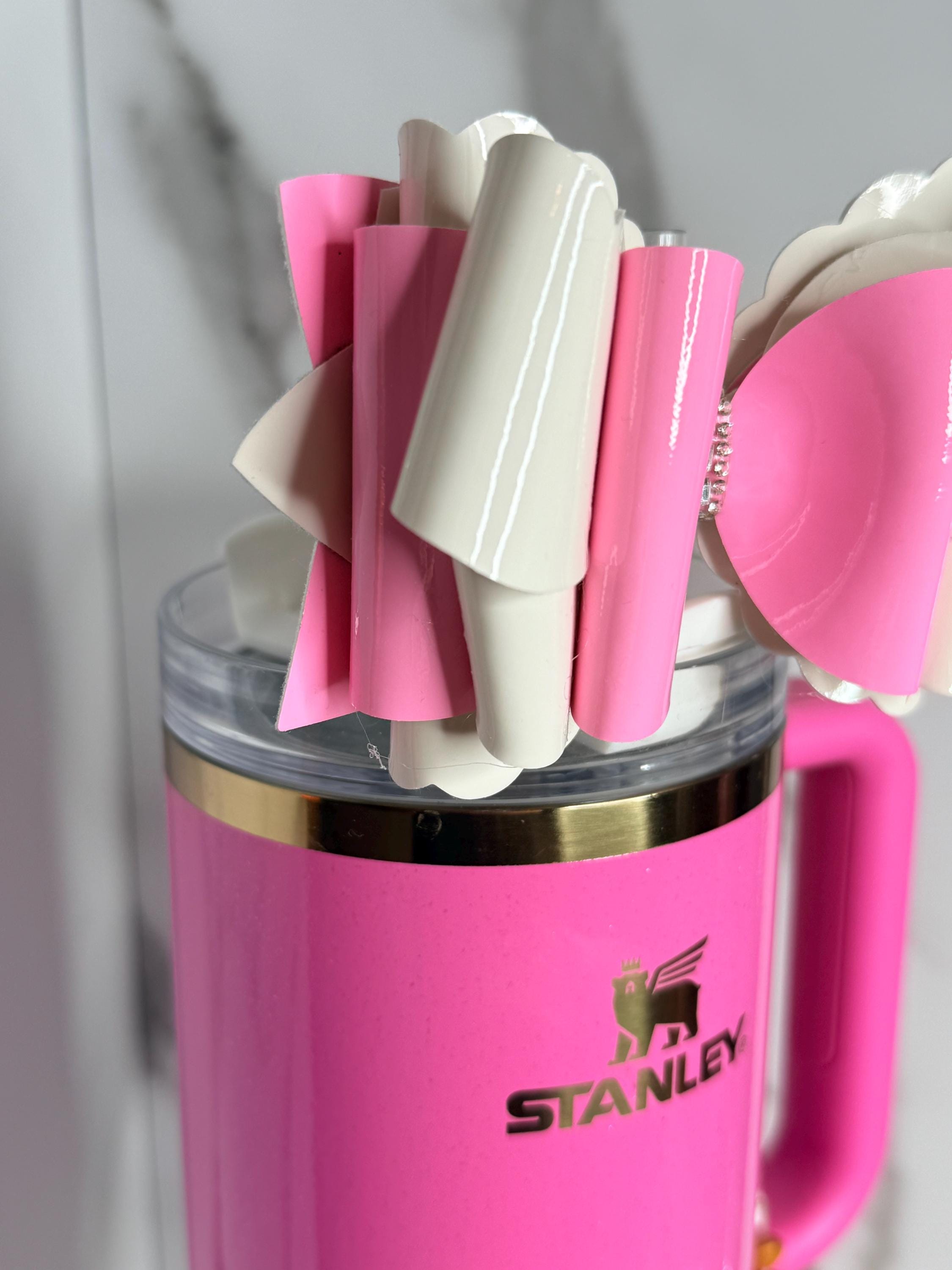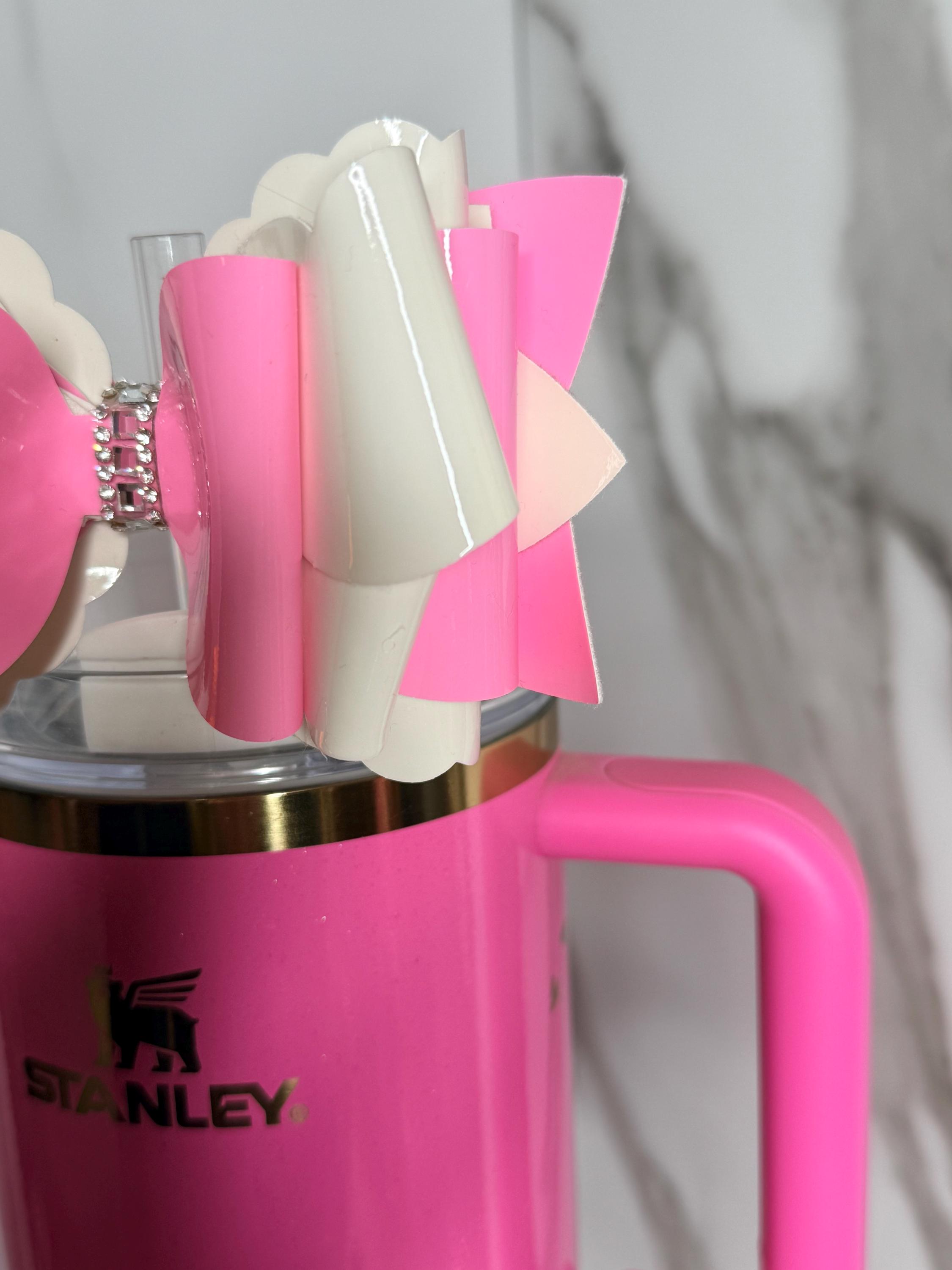 Make your tumbler stand out with this handmade 5” pink and white tumbler bow. Designed with glossy pink and white faux leather and a sparkling rhinestone centerpiece, this bow brings a touch of glam to any cup. Whether you’re sipping at home, at work, or on the go, this bow is sure to turn heads.