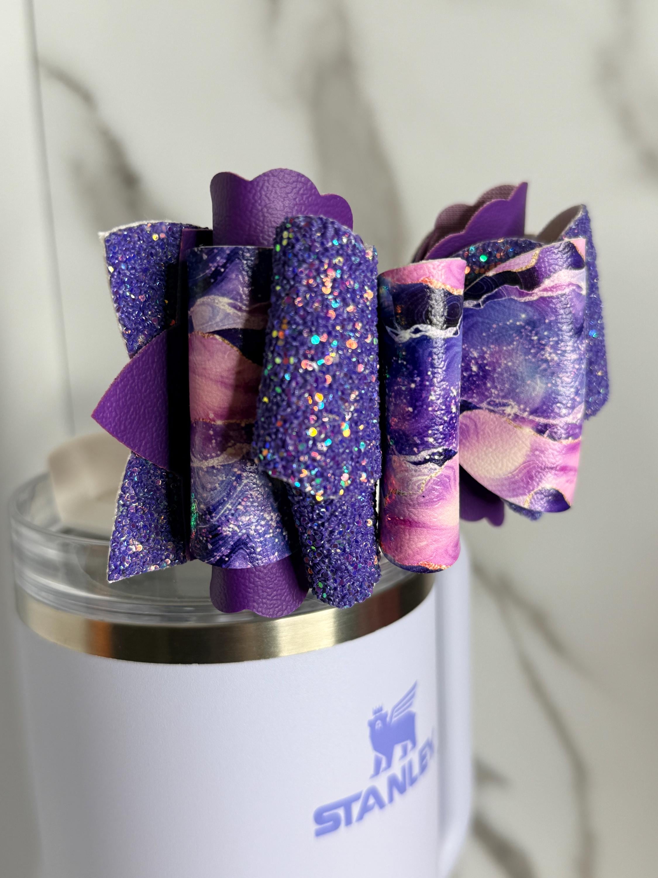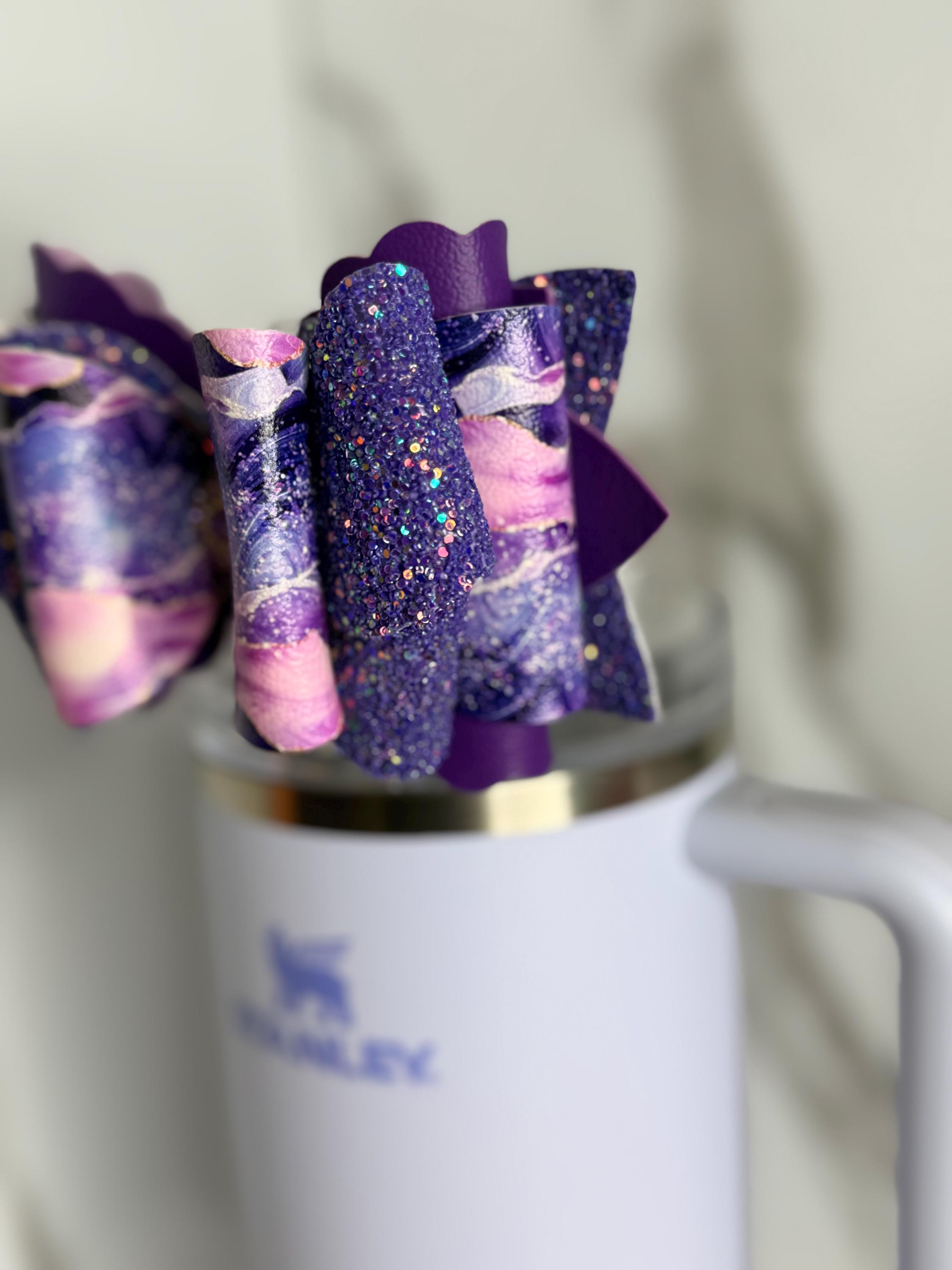 Add cosmic sparkle to your favorite tumbler with this stunning Purple Galaxy Tumbler Bow! Handcrafted with layers of purple and lilac marbled faux leather, deep glitter fabric, and finished with a dazzling rhinestone center, this bow brings a touch of magic and luxury to your everyday cup.
