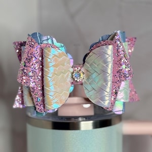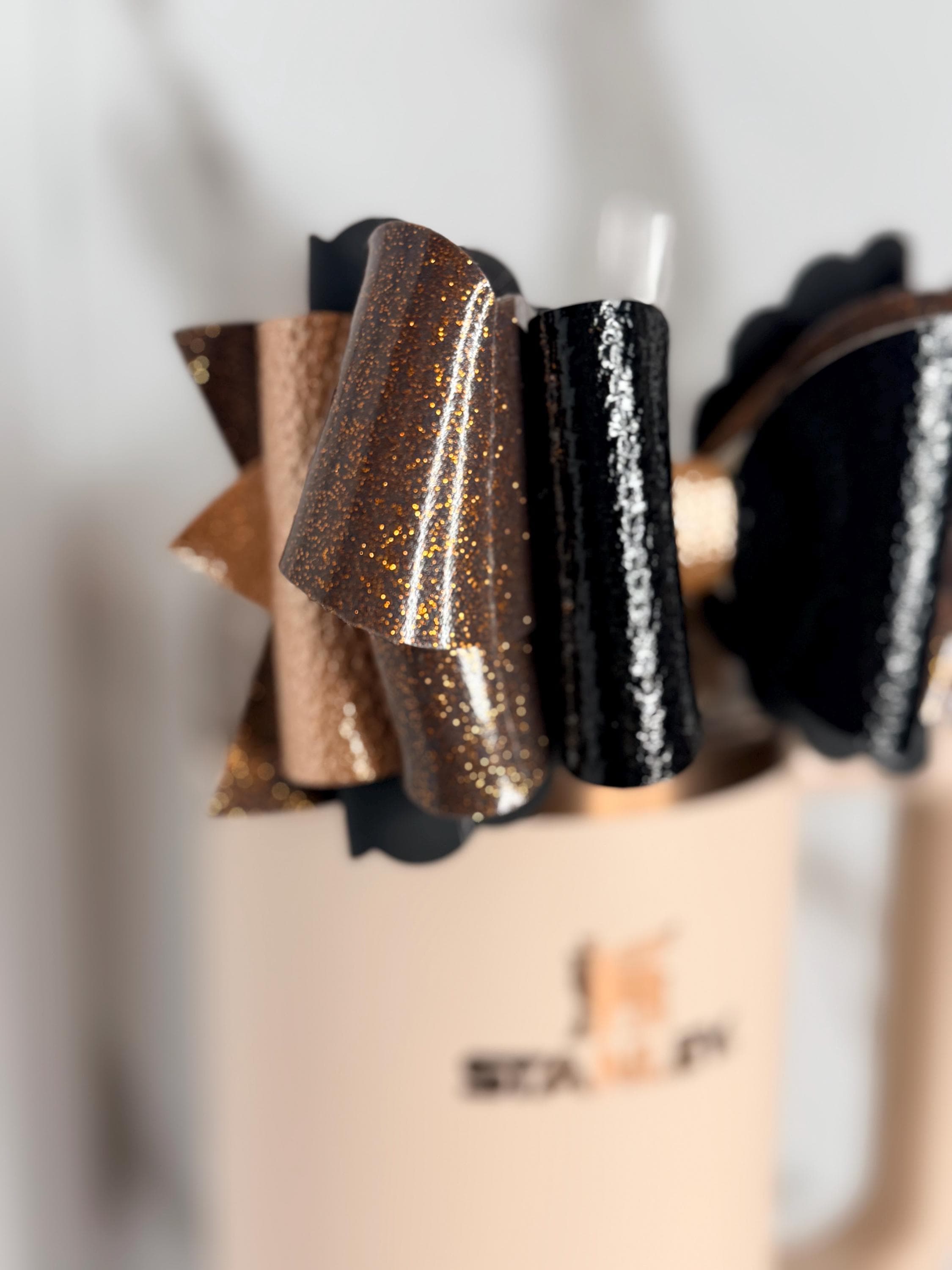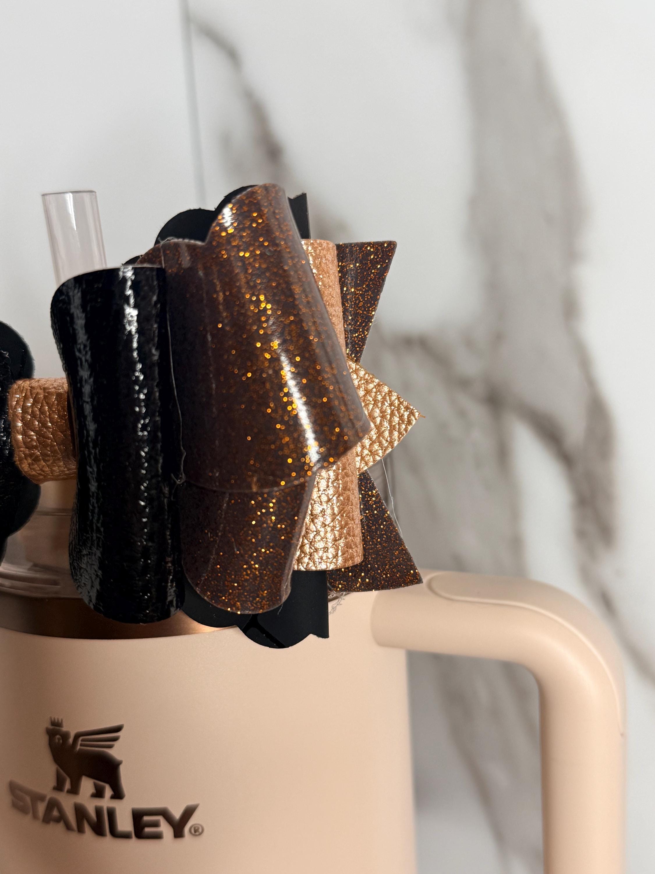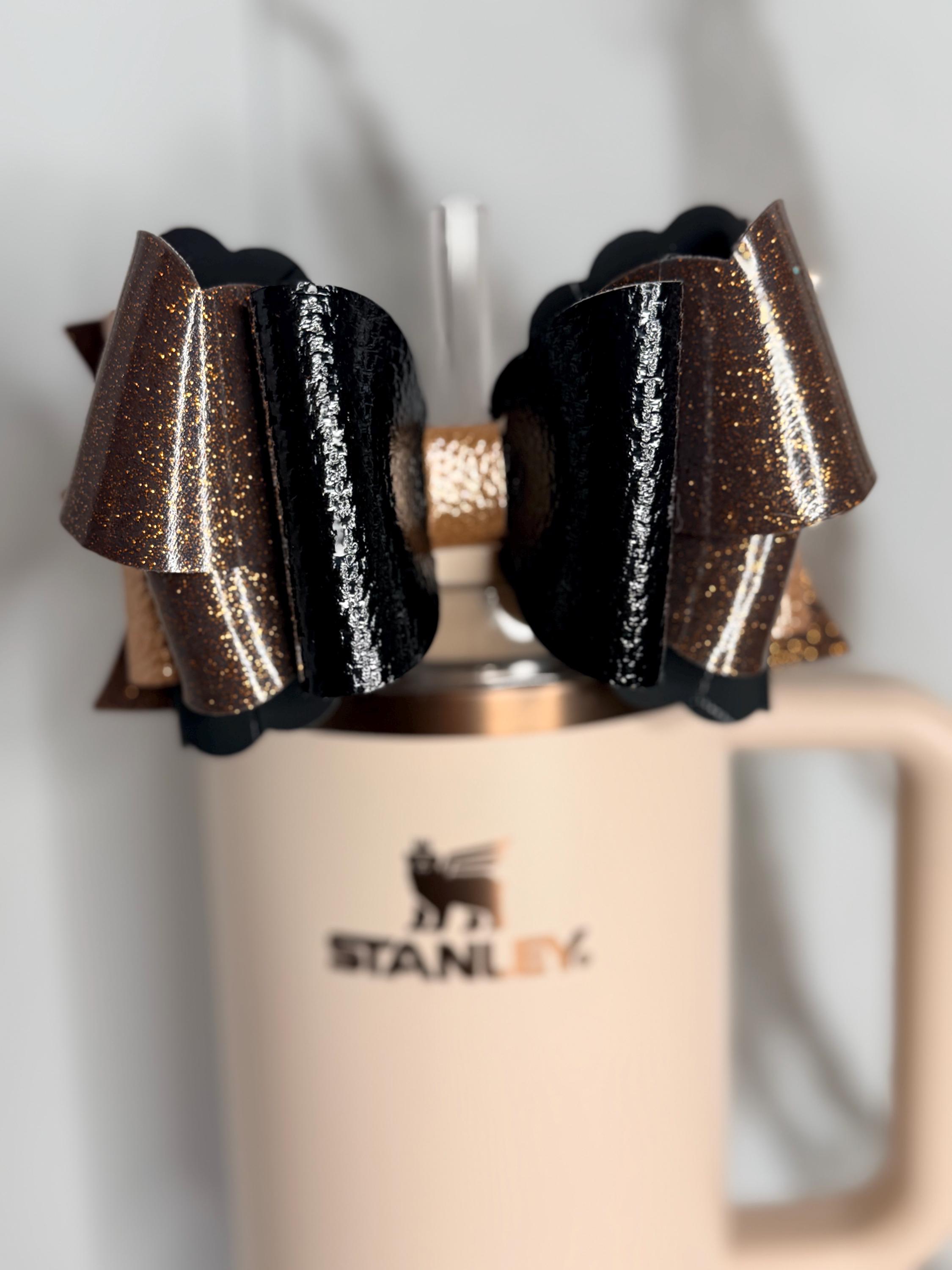 ✨ Details: • Colors: Glossy black and bronze glitter layers • Centerpiece: Metallic gold faux leather wrap • Material: Premium faux leather and glitter vinyl • Size: Approx. 4.5 inches wide • Attachment: Fits most tumbler straws securely • Listing is for bow only – cup and straw not included • Ready to ship!