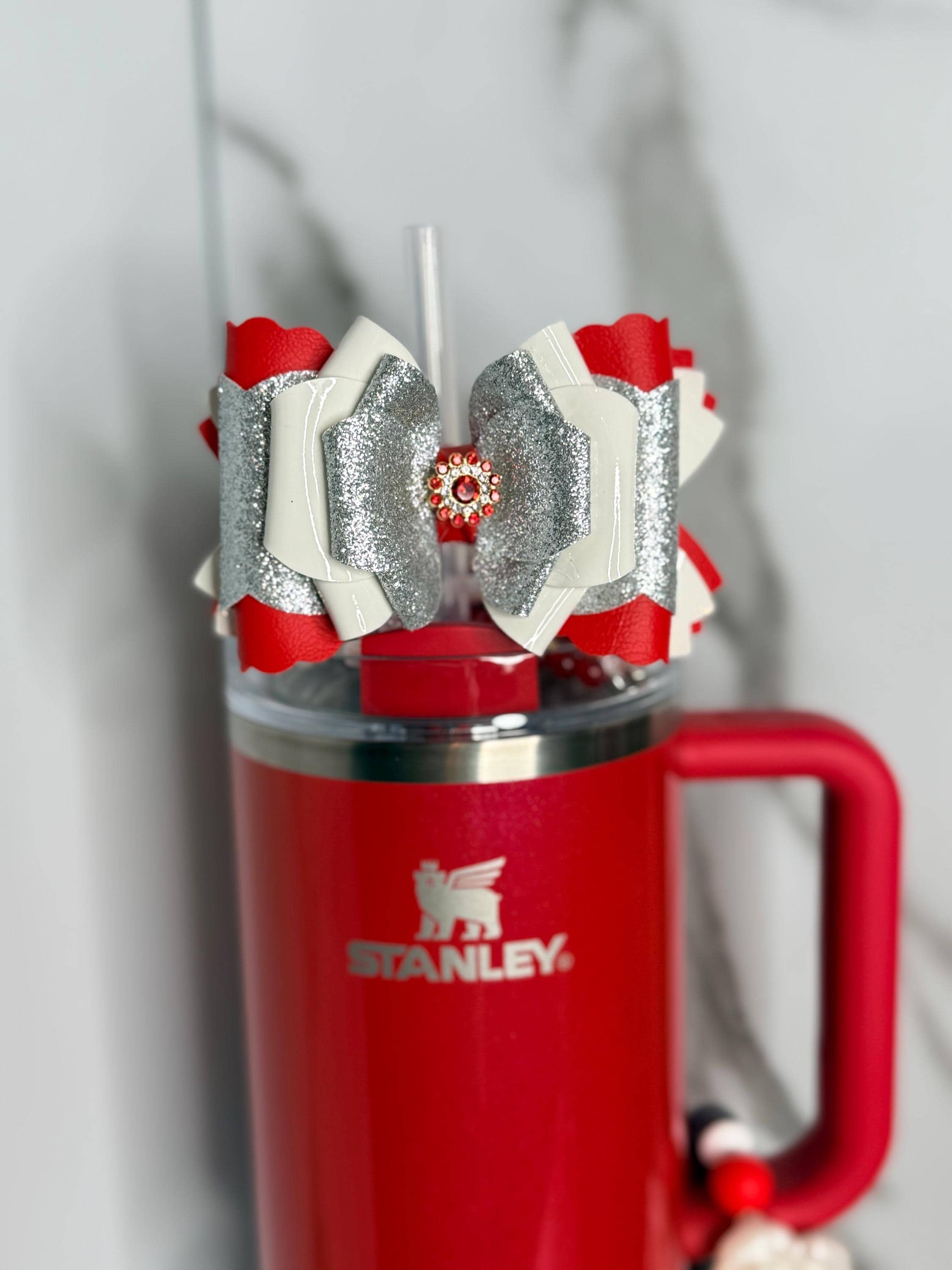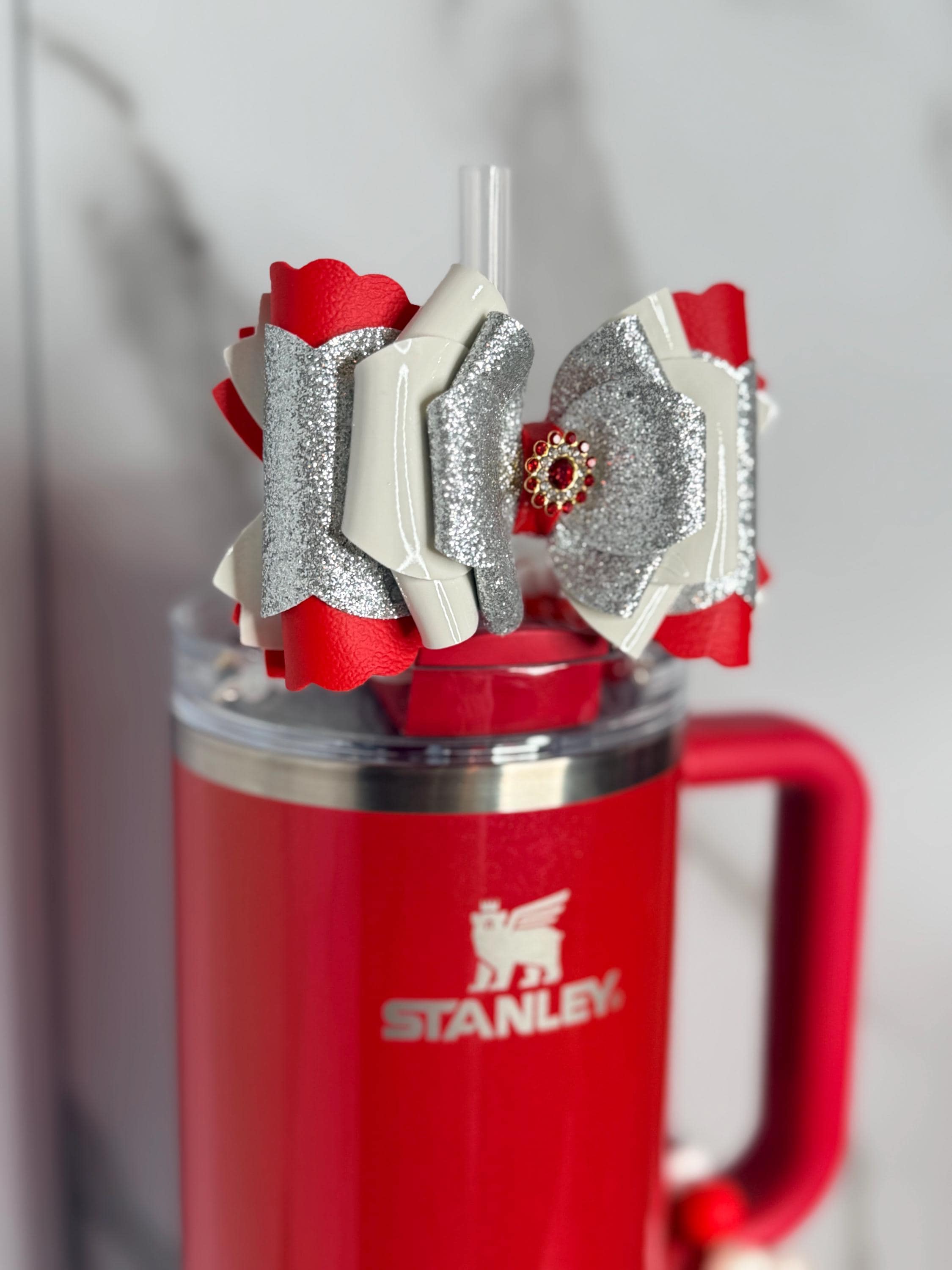 ✨ Details: • Colors: Red, white, & silver glitter • Centerpiece: Red gemstone rhinestone • Materials: Premium faux leather & chunky glitter vinyl • Size: Approx. 4.5 inches wide • Attachment: Fits most tumbler straws securely • Listing is for bow only, cup and straw not included. Ready to ship