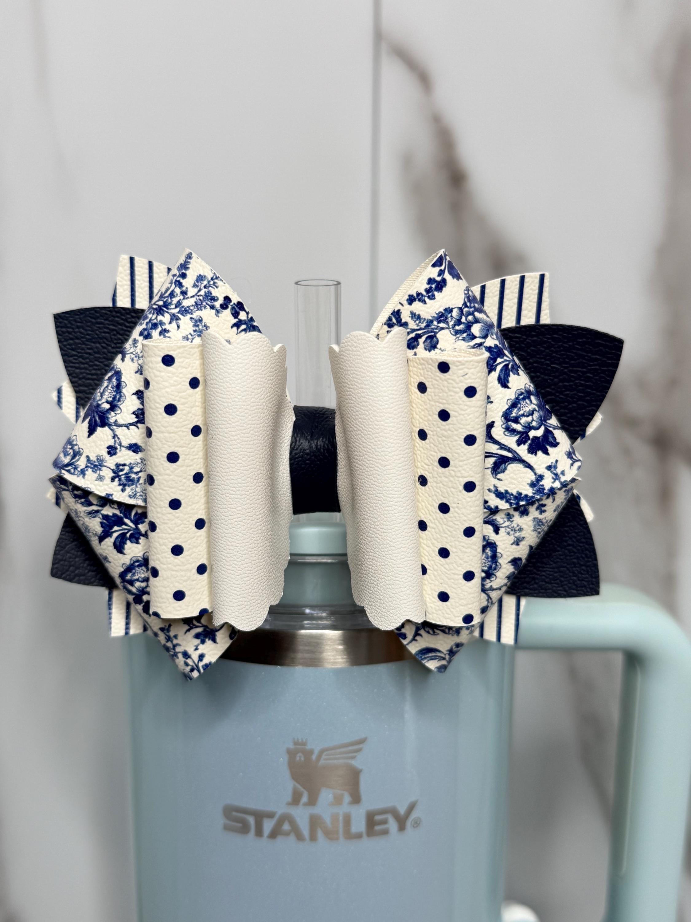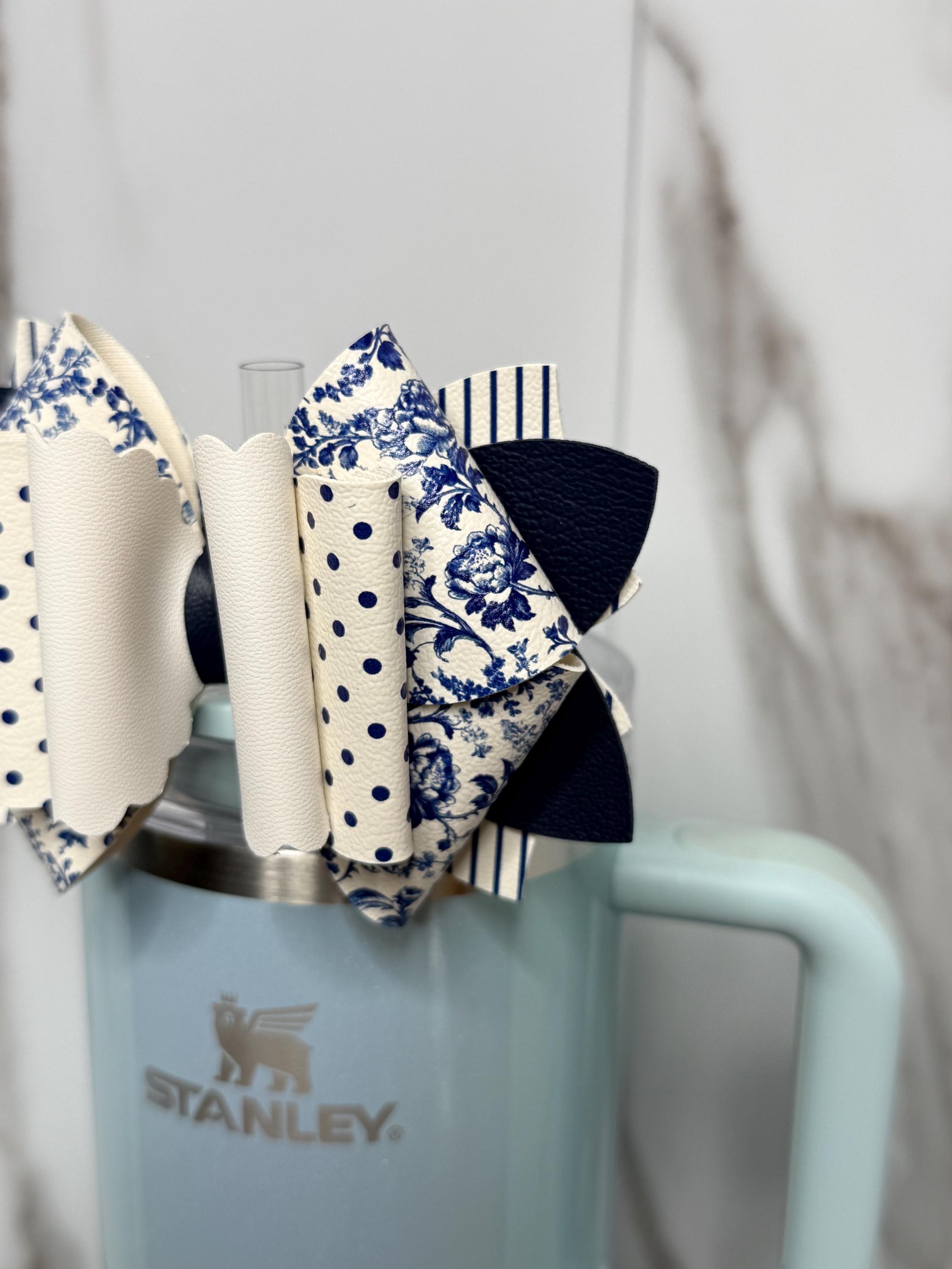 ✨ Details: • Handmade from high-quality faux leather • Colors: Navy blue, white, cream • Patterns: Floral, stripes, and polka dots • Size: Approx. 4.5–5 inches wide • Fits most tumbler straws securely • Listing is for bow only, cup and straw not included. Ready to ship.