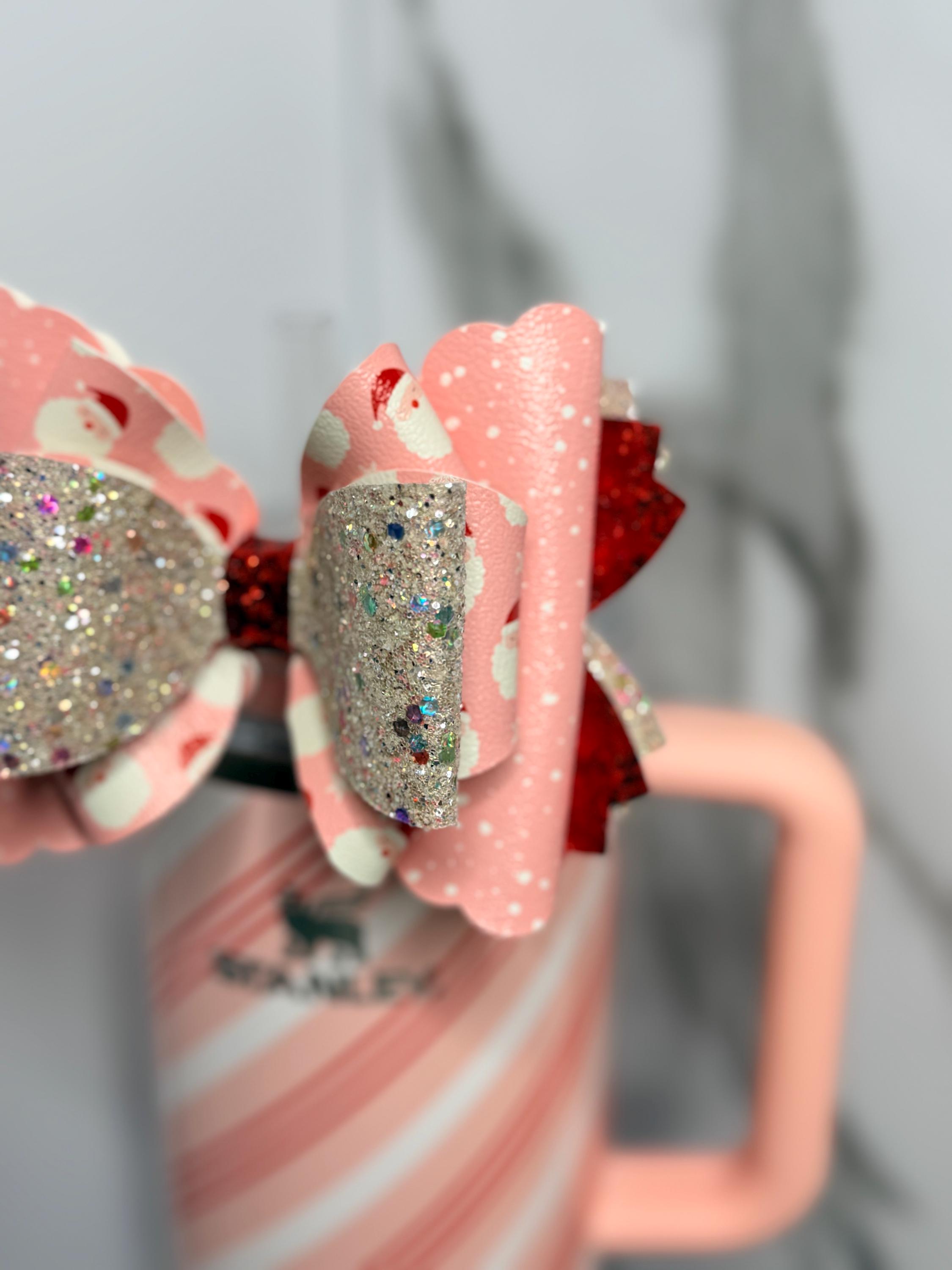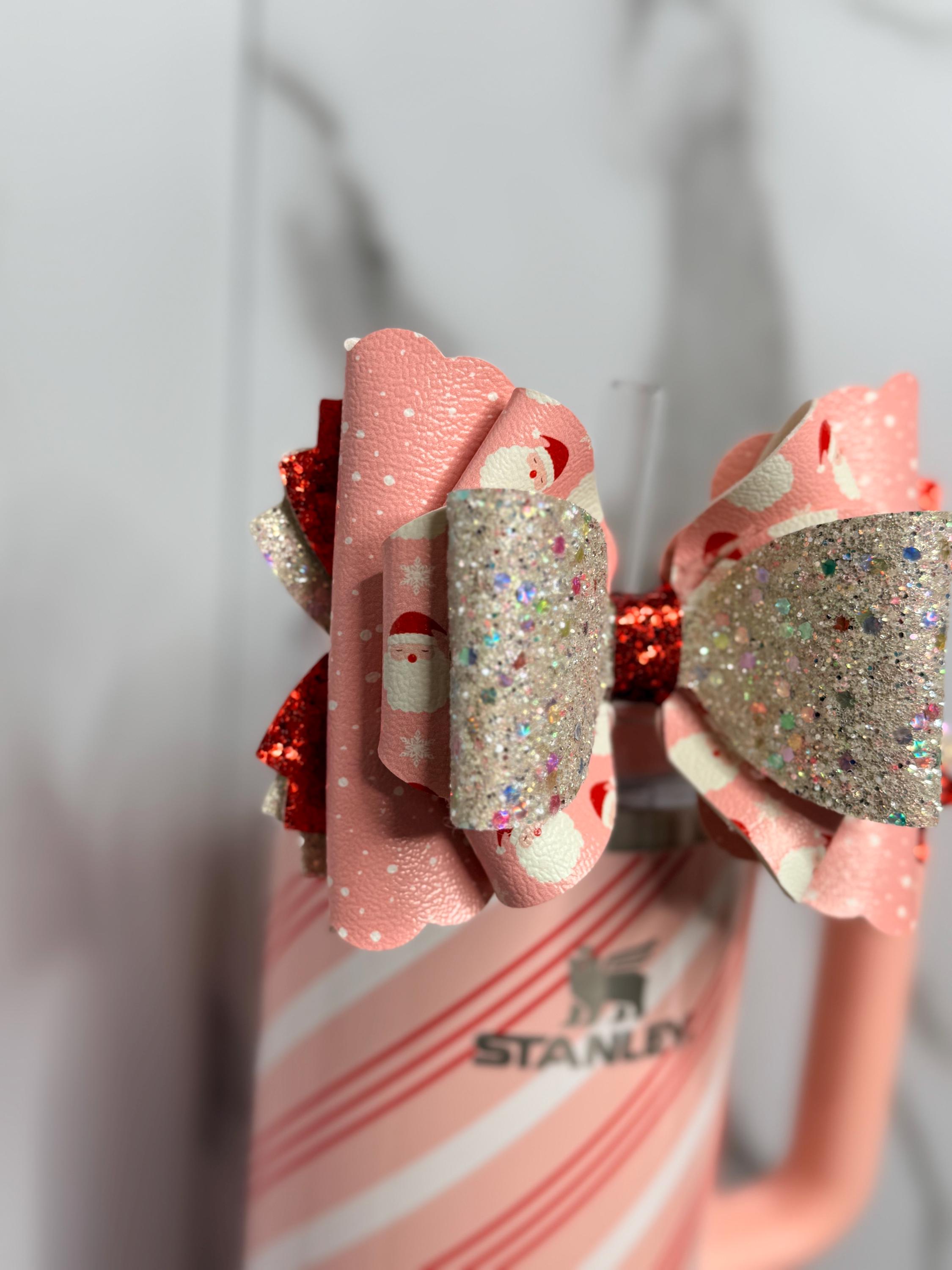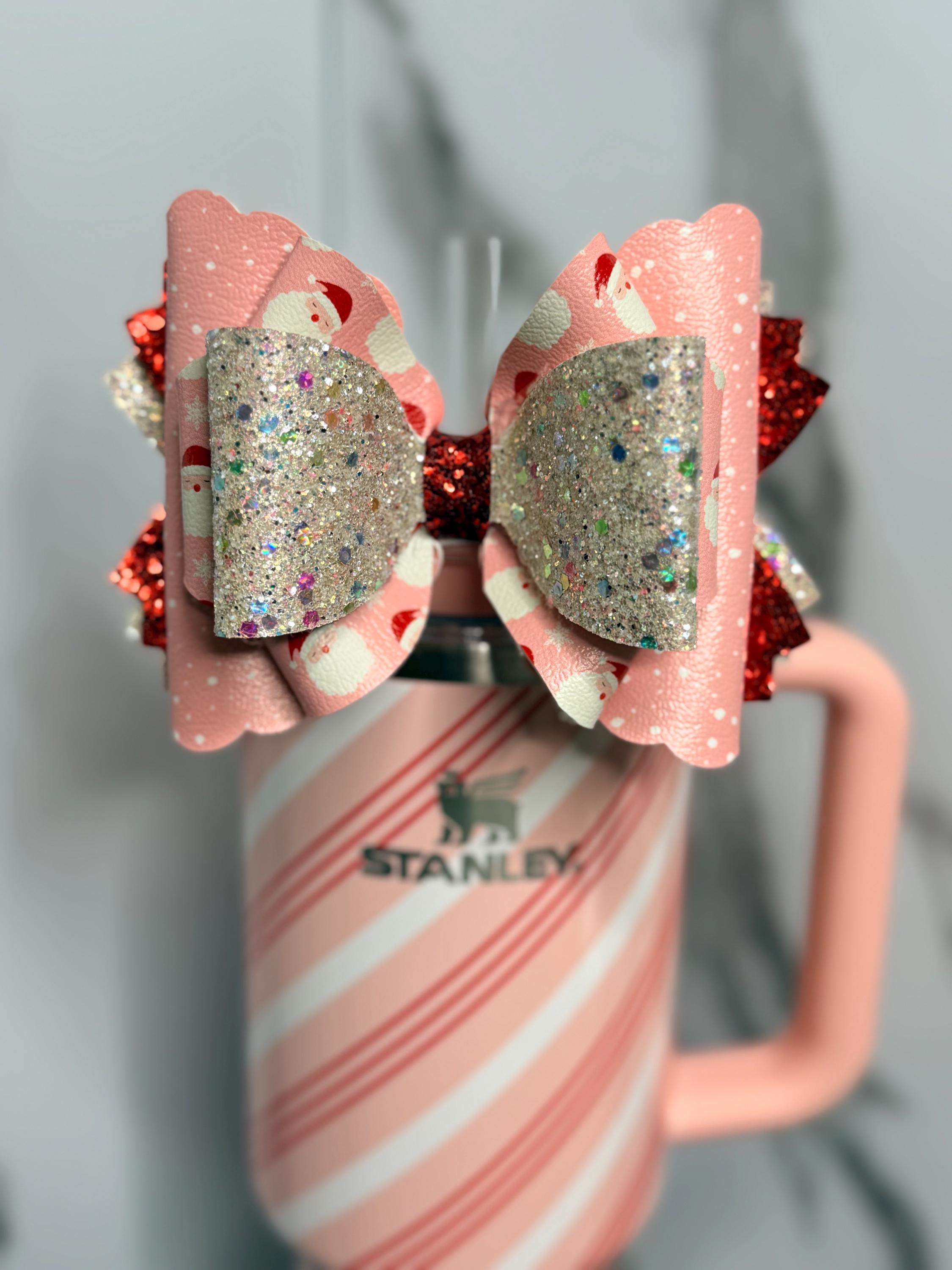 Add some Christmas sparkle to your tumbler with this Pink Santa & Glitter Tumbler Bow! This festive faux leather bow combines cheerful pink Santa print with layers of multi-color glitter and bold red sparkle — perfect for dressing up your Stanley or favorite cup for the holiday season.