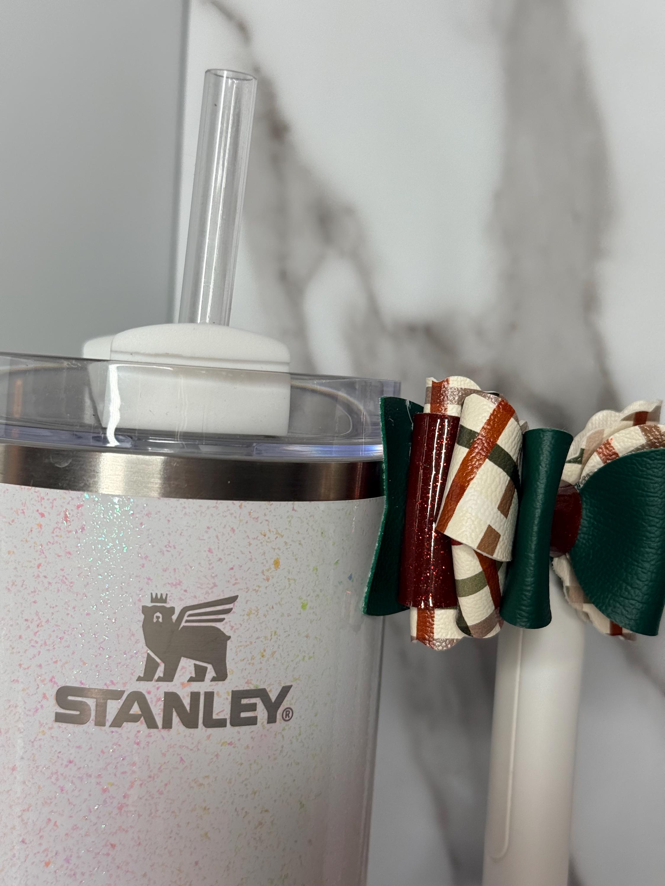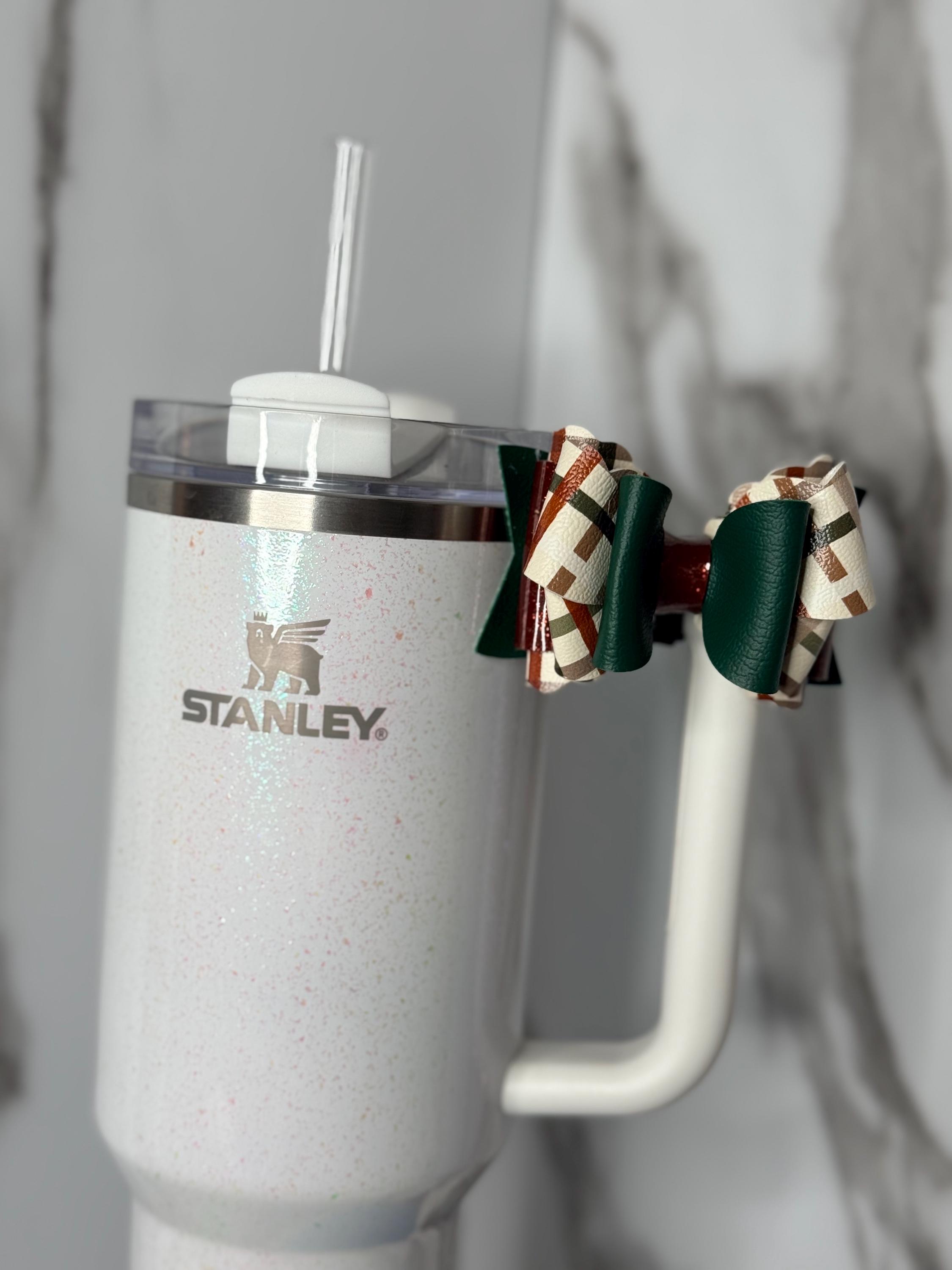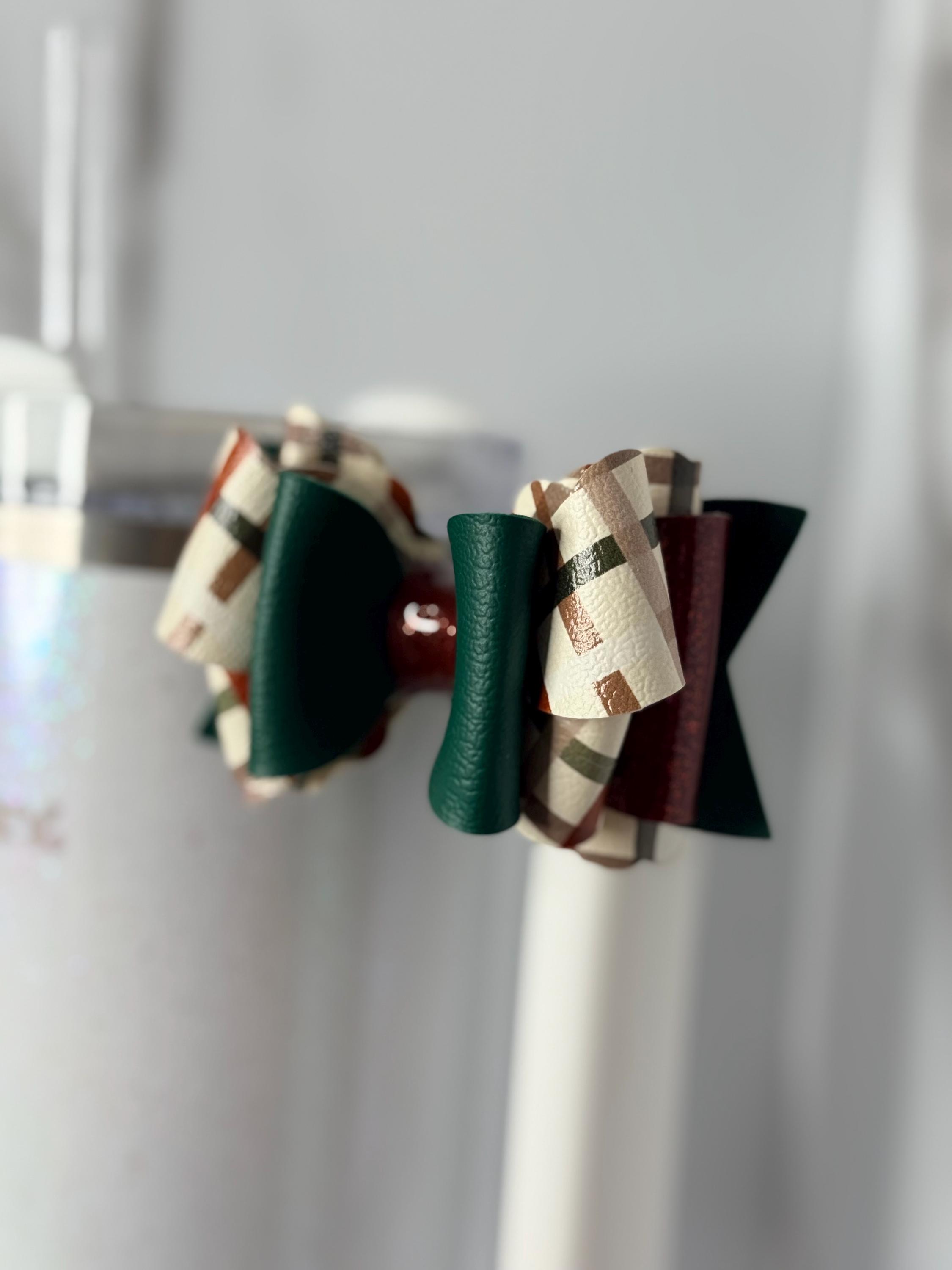 ✨ DETAILS: • Handmade tumbler handle bow • Green faux leather + neutral holiday plaid pattern • Layers designed for fullness and durability • Fits most Stanley-style tumbler handles • Approx. 3–3.5 inches wide • Listing is for bow only, cup and straw not included. Ready to ship