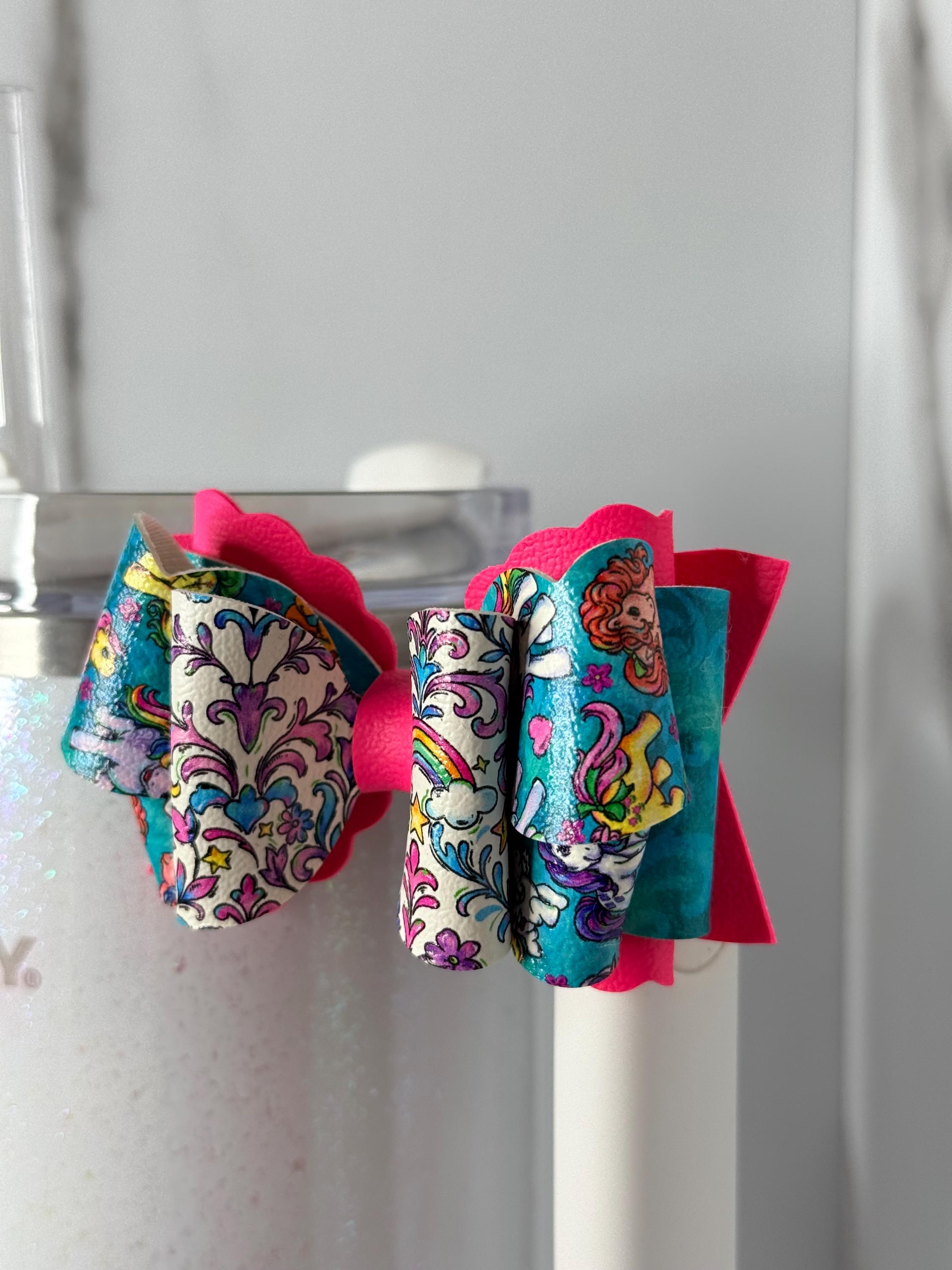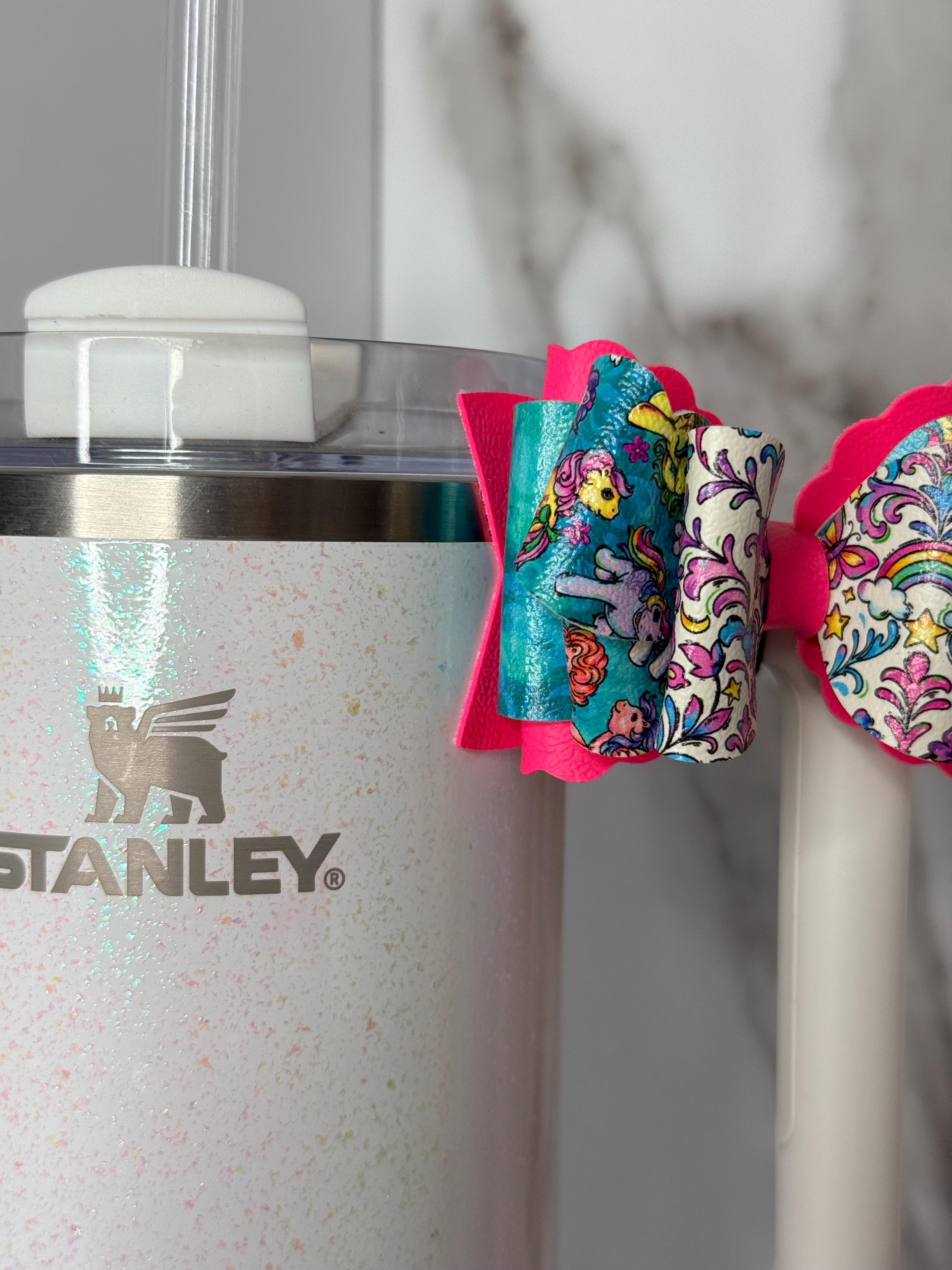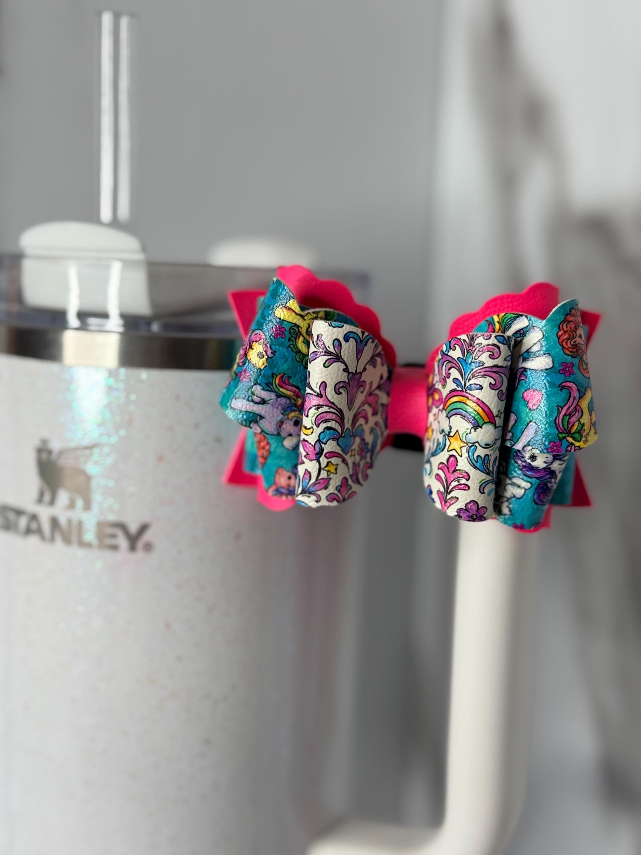 ✨ DETAILS: • Handmade tumbler handle bow • Rainbow, unicorn, and pastel-inspired faux leather pattern • Hot pink base adds the perfect pop of color • Fits most Stanley-style and similar handles • Lightweight, durable, and eye-catching • Listing is for bow only, cup and straw not included. Ready to ship