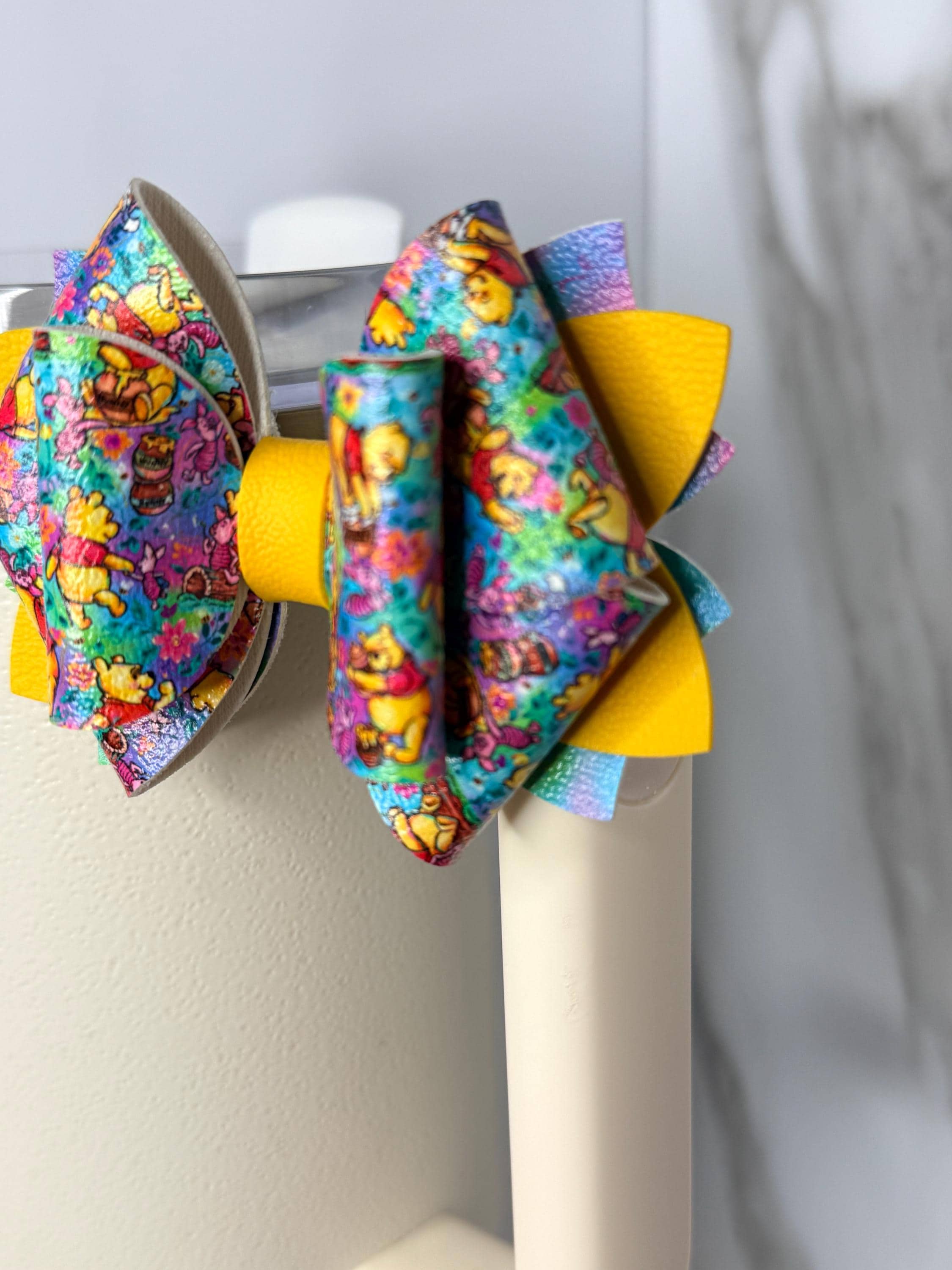 Add a sweet touch of nostalgia to your tumbler with this charming Yellow Bear Tumbler Handle Bow! Featuring vibrant faux leather printed with Pooh, Piglet, honey pots, and pastel rainbow accents, this bow is the perfect way to brighten up your daily cup and make it uniquely YOU.