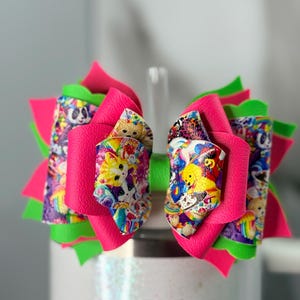 Each bow is handcrafted with multiple layers of high-quality faux leather in pink, yellow, red, and pastel tones, featuring a whimsical cartoon character pattern that’s guaranteed to stand out.