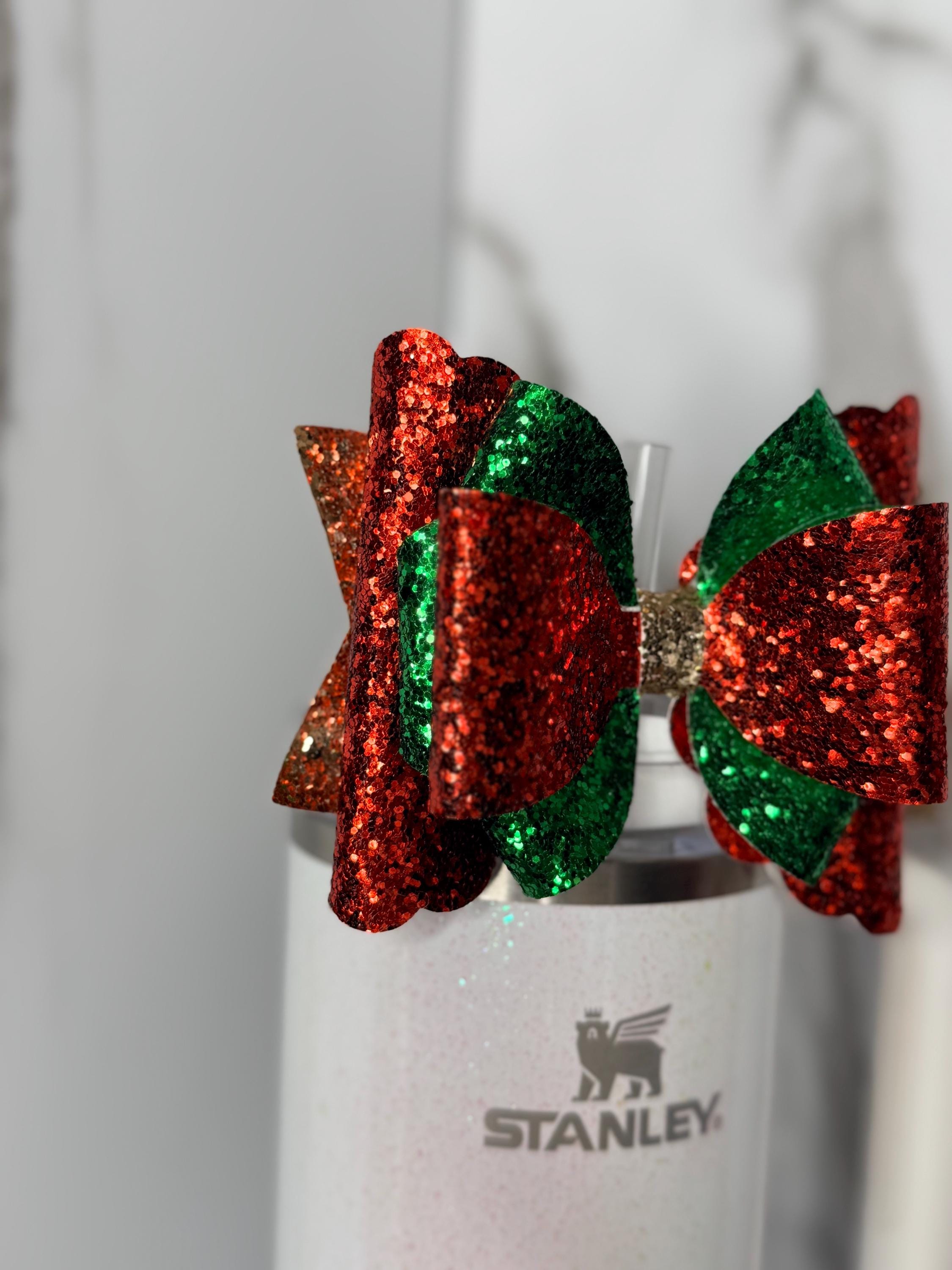 ⭐ DETAILS • Handmade red, green & gold glitter tumbler bow • Fits most 30–40 oz tumblers including Stanley styles • Secure, lightweight, and easy to attach • Perfect holiday accessory for your everyday cup • Great for Christmas gifts, stocking stuffers & holiday décor