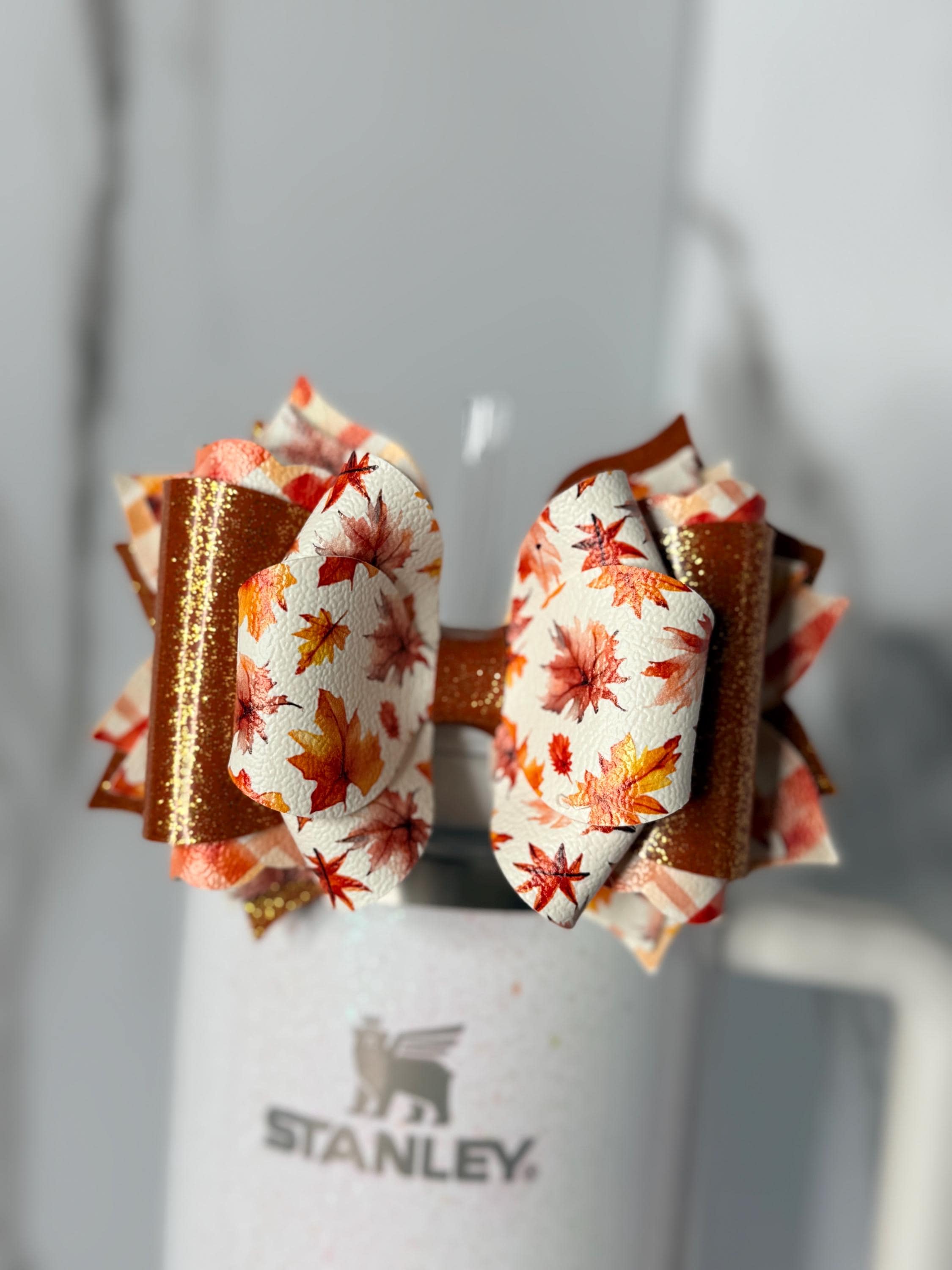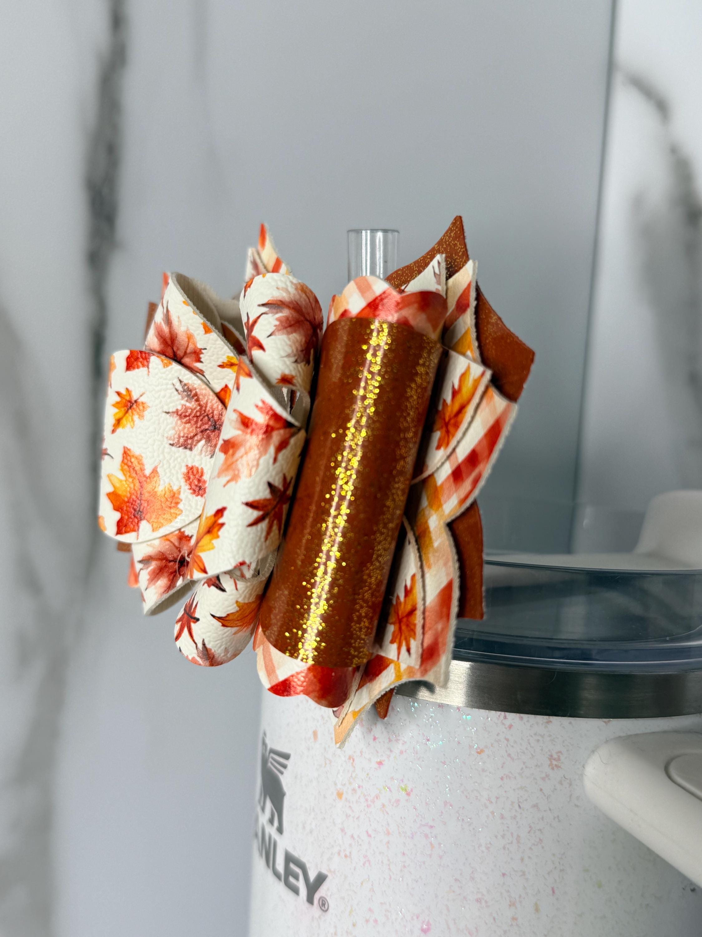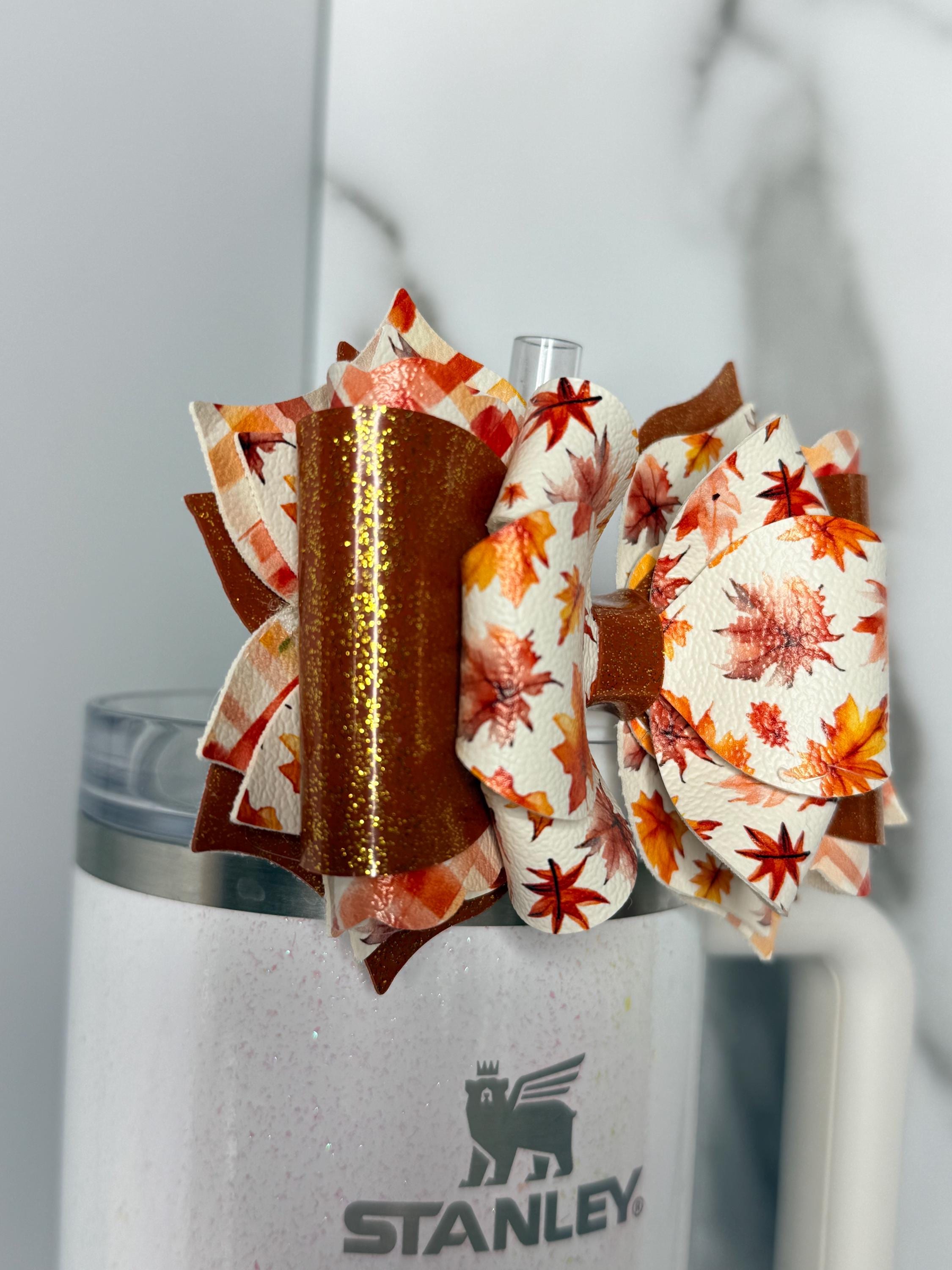 Celebrate the cozy season with this gorgeous fall leaves tumbler handle bow! Designed in warm oranges, browns, and glittery accents, this bow adds the perfect autumn touch to your daily tumbler.