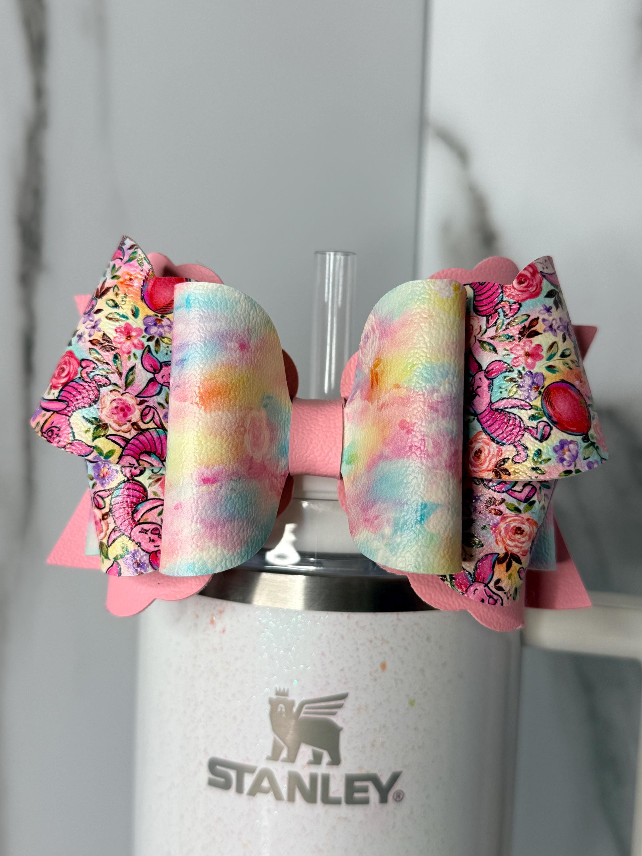 This pastel floral tumbler bow adds soft elegance to any cup. Featuring dreamy rainbow watercolor textures and floral faux leather, this bow brings a gentle pops of color perfect for spring, birthdays, or everyday cheer.