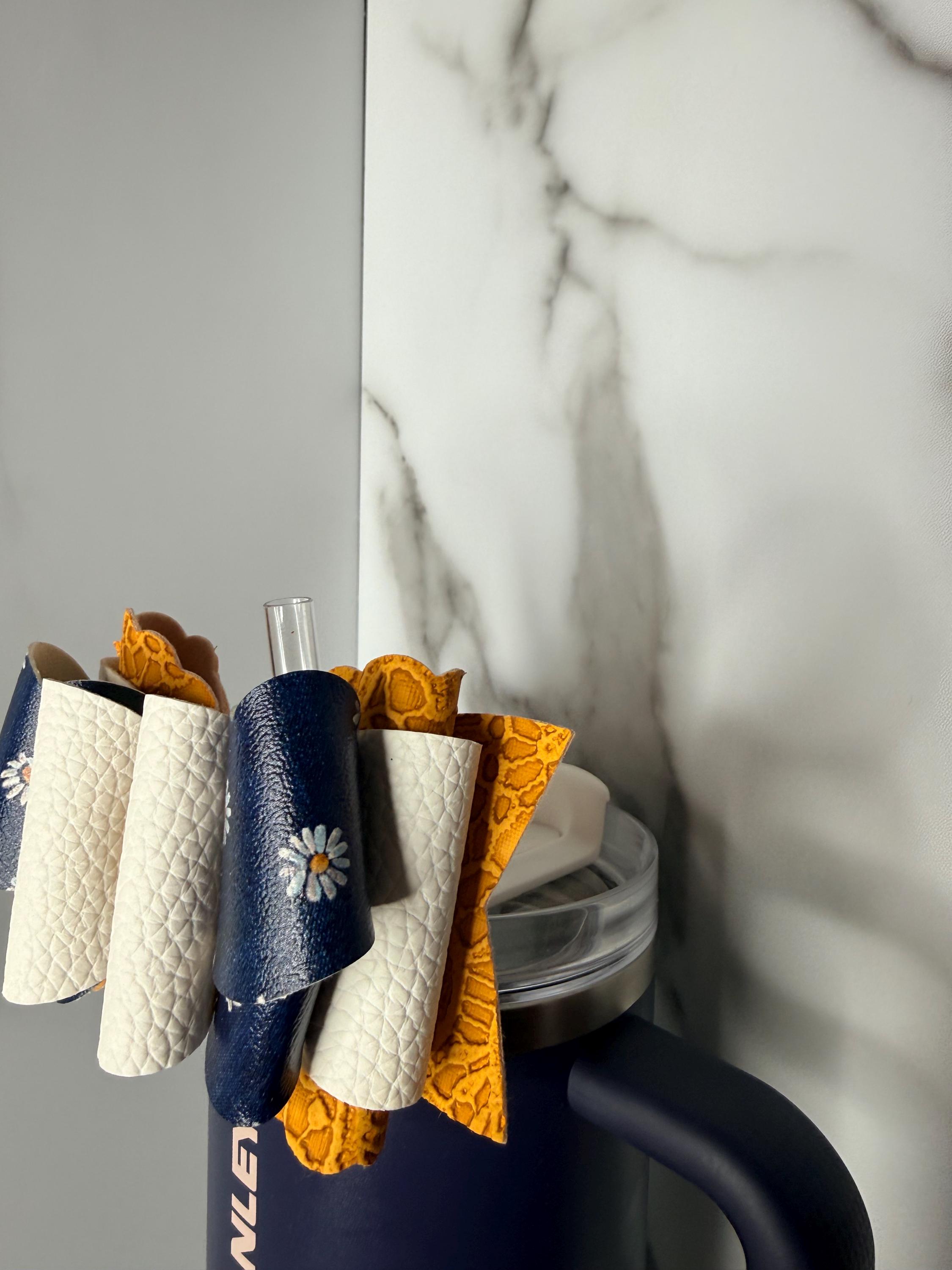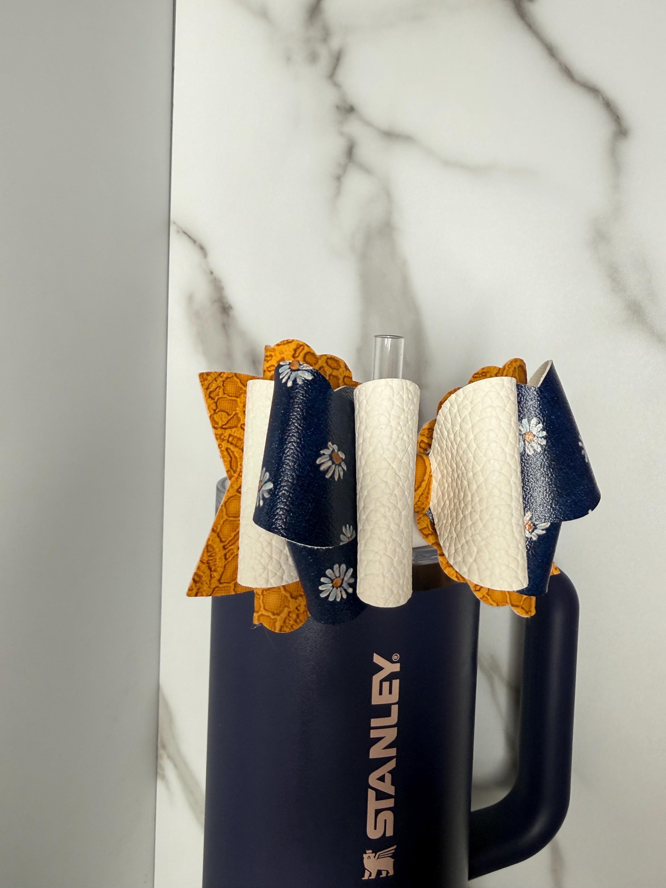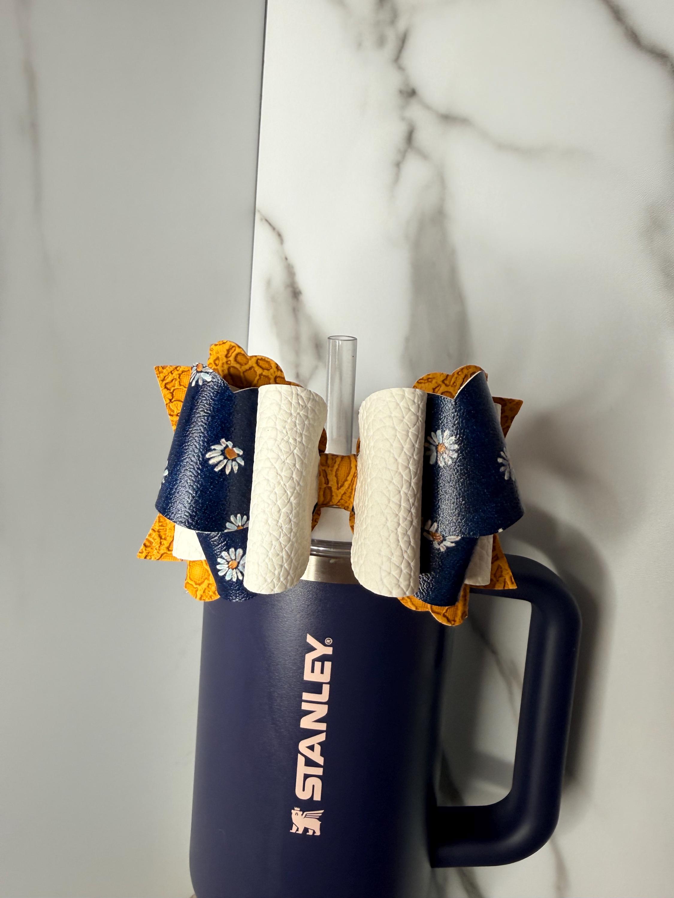 These bows are handmade, so some variations are to be expected. Each listing is for one bow and doesn’t include the cup or any additional accessories that may be seen in the photo. Cup bows are 4-5” in length and handle bows are 3.5-4”. Handle bows may also be used on the straw by removing the Velcro attachment.