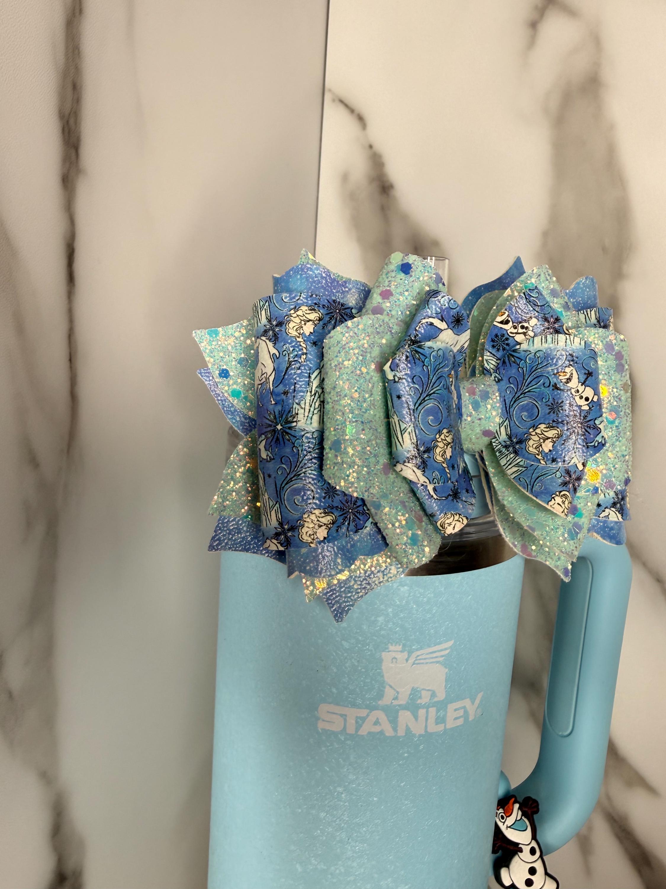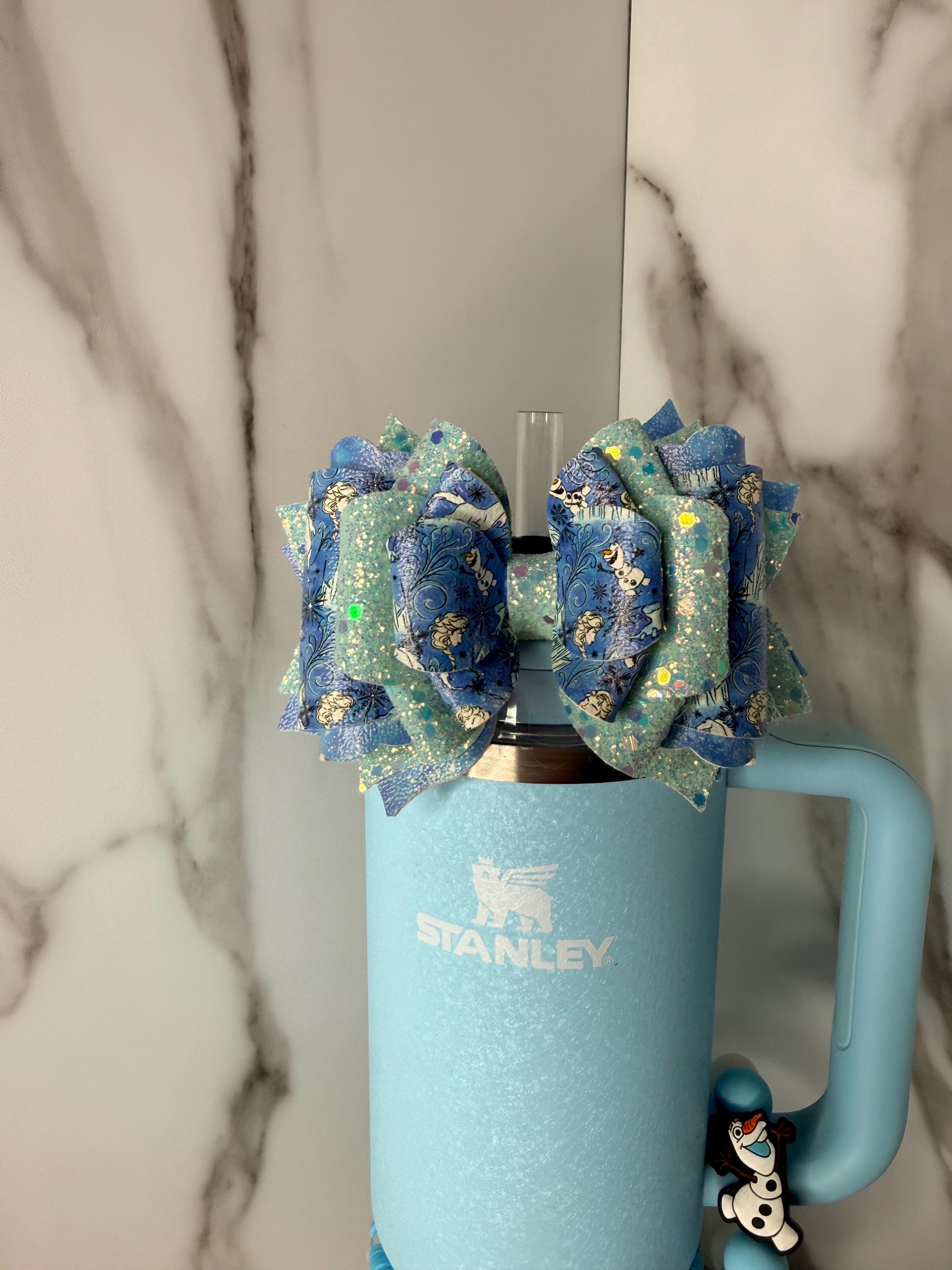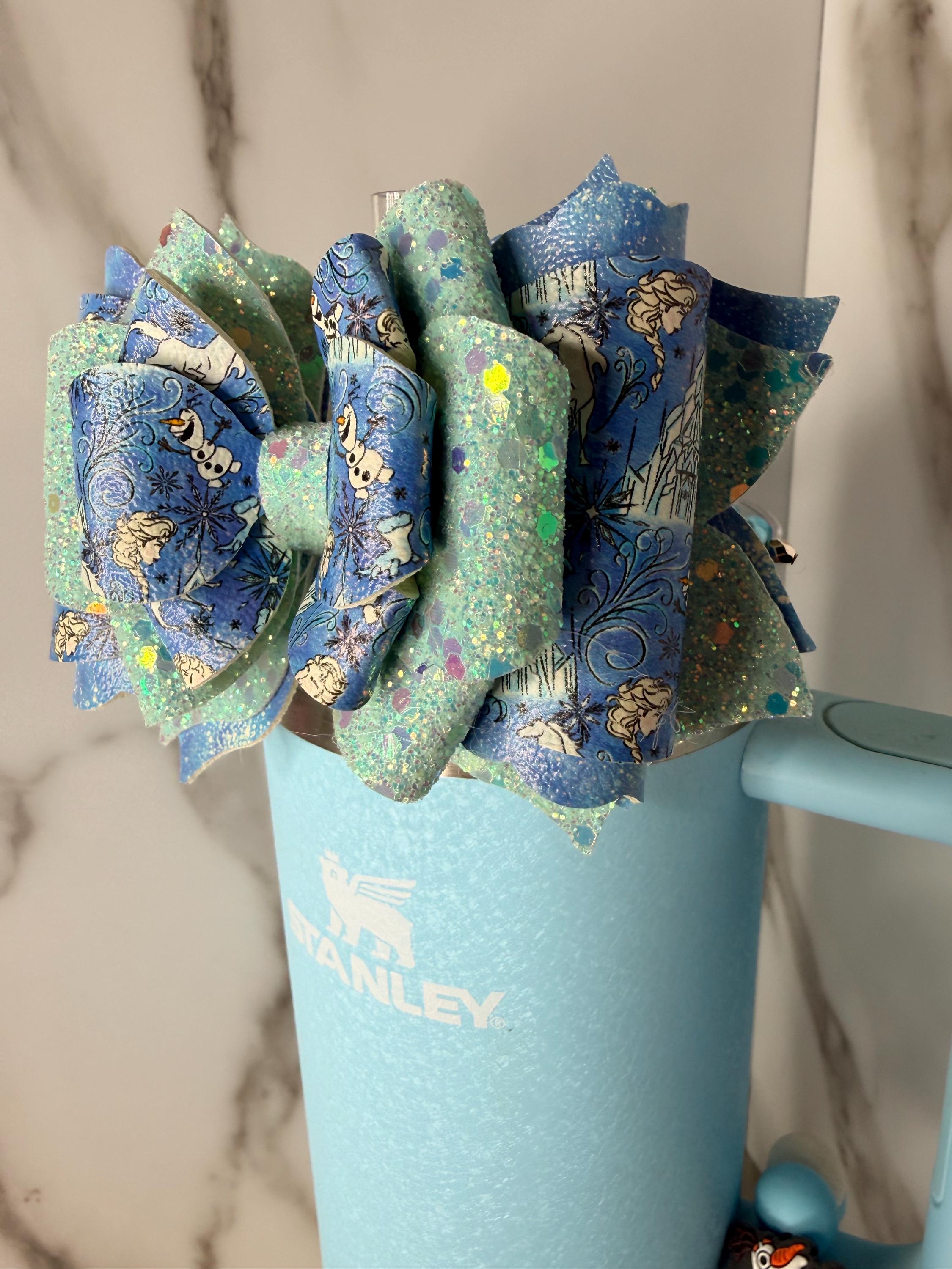 Description: This blue winter-inspired tumbler bow features icy glitter layers and whimsical winter character details. A perfect accessory for cold drinks, winter vibes, or fans of cool-toned aesthetics.