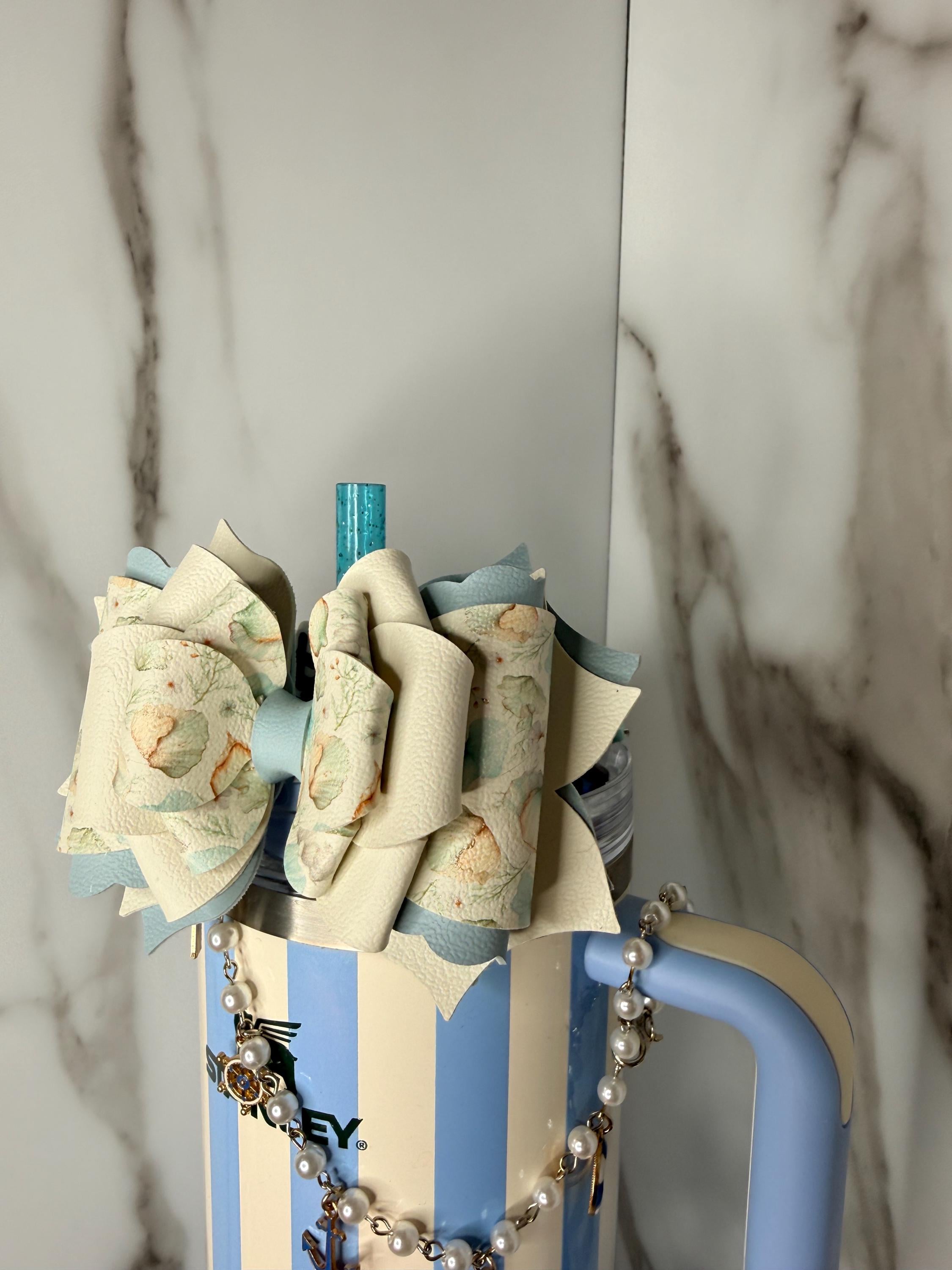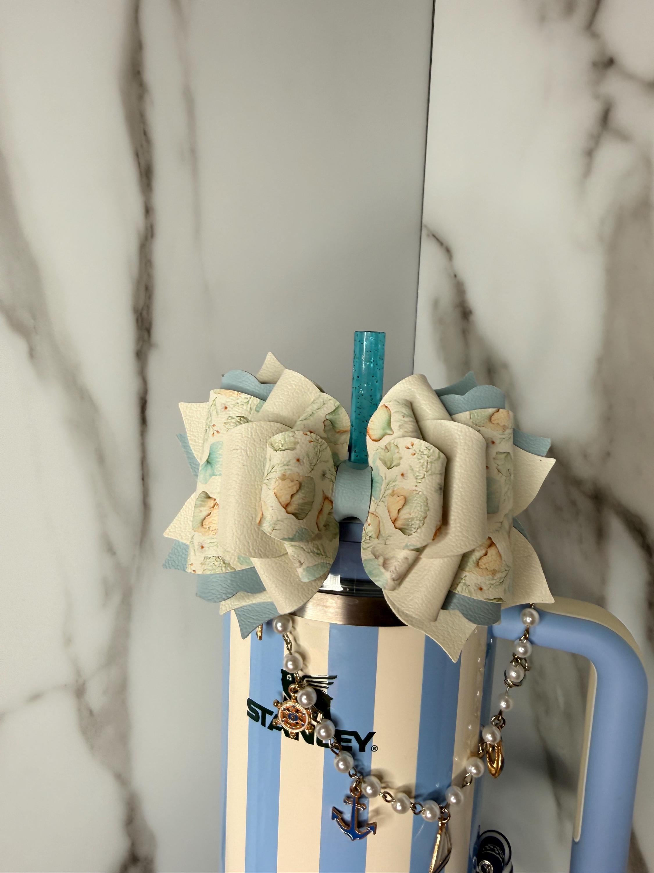 This coastal-inspired tumbler bow features soft seashell tones and beachy colors, perfect for summer drinks and ocean lovers.