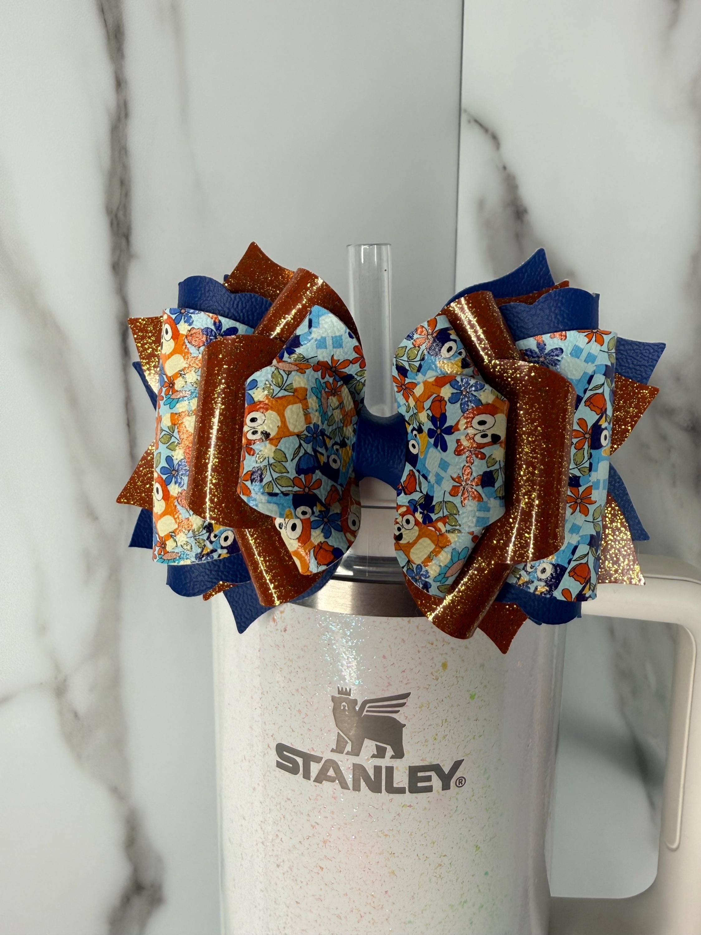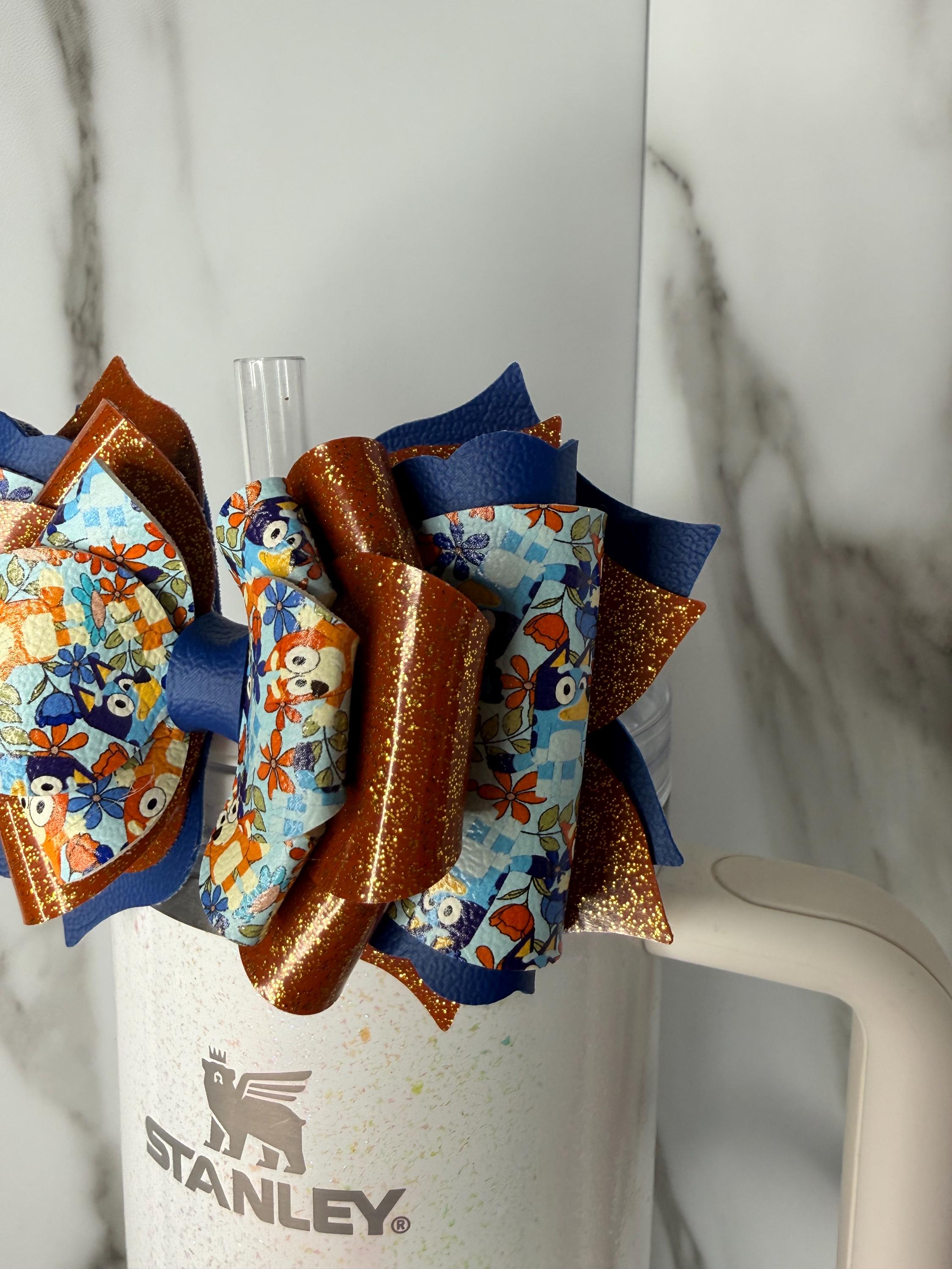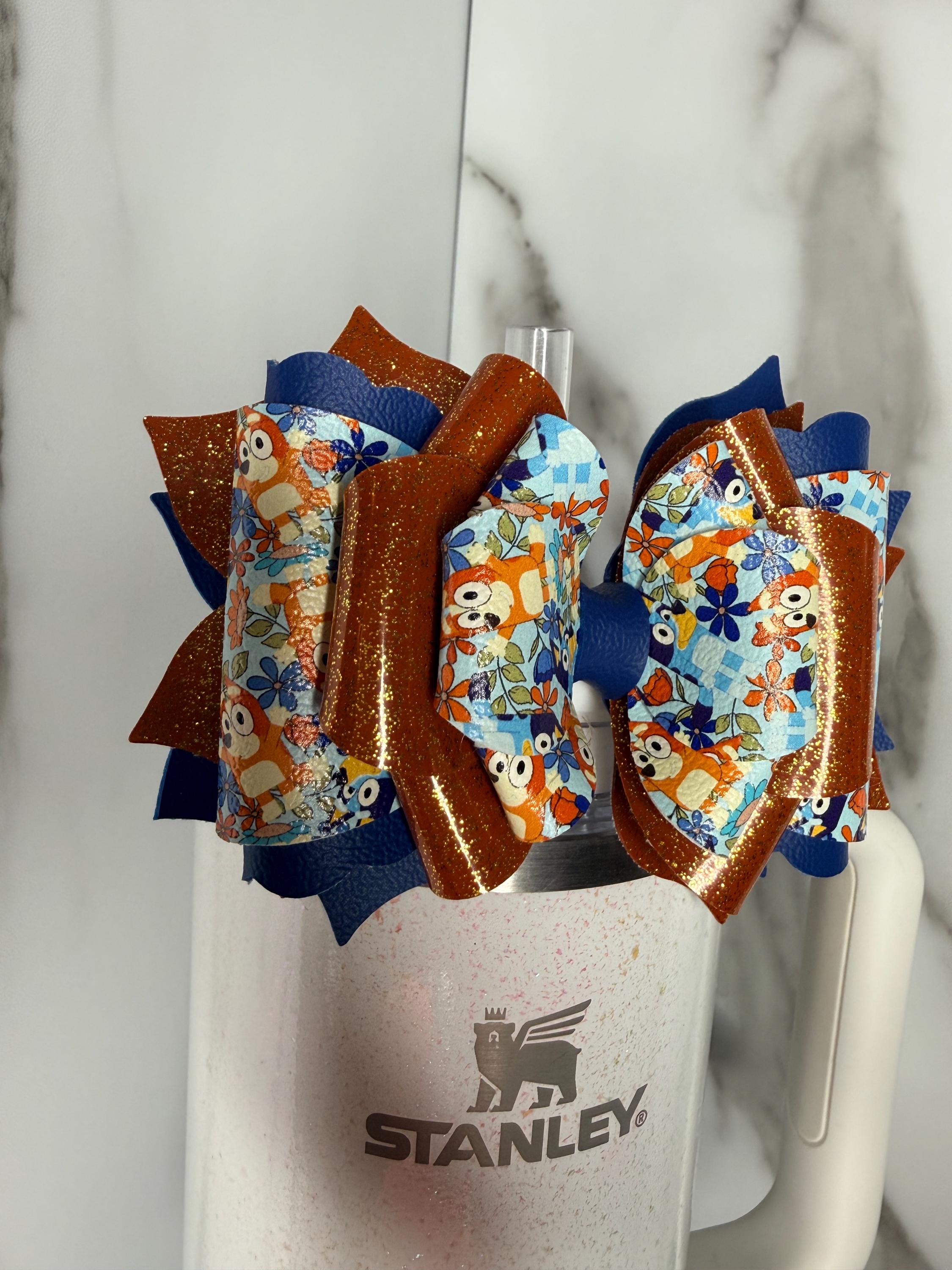 ✨ DETAILS: • Handmade tumbler bow • Blue cartoon dog character faux leather print • Iridescent and blue glitter accent layers • Fits most Stanley-style handles • Lightweight, durable, and eye-catching • Listing is for bow only, cup and straw not included. Ready to ship