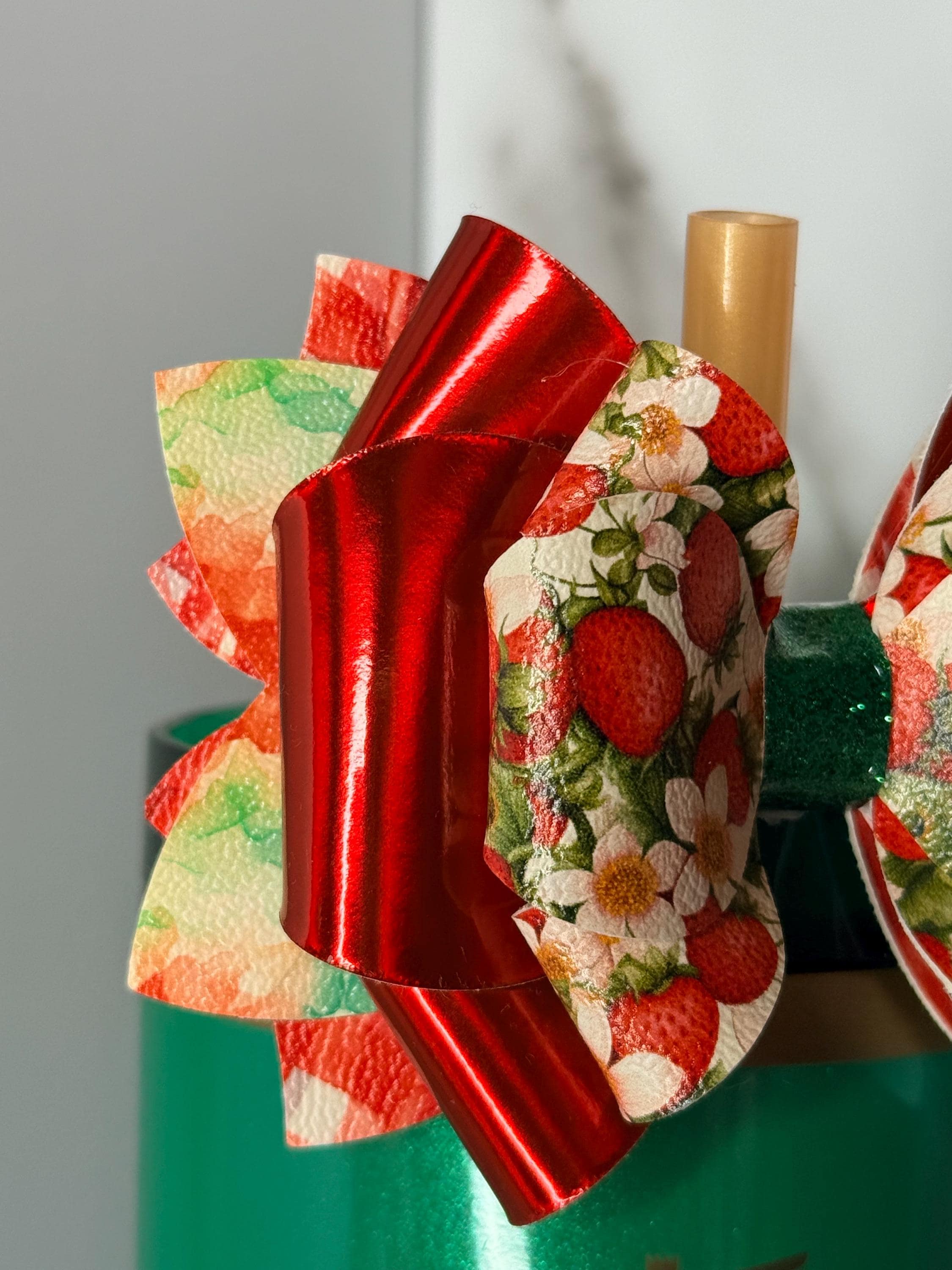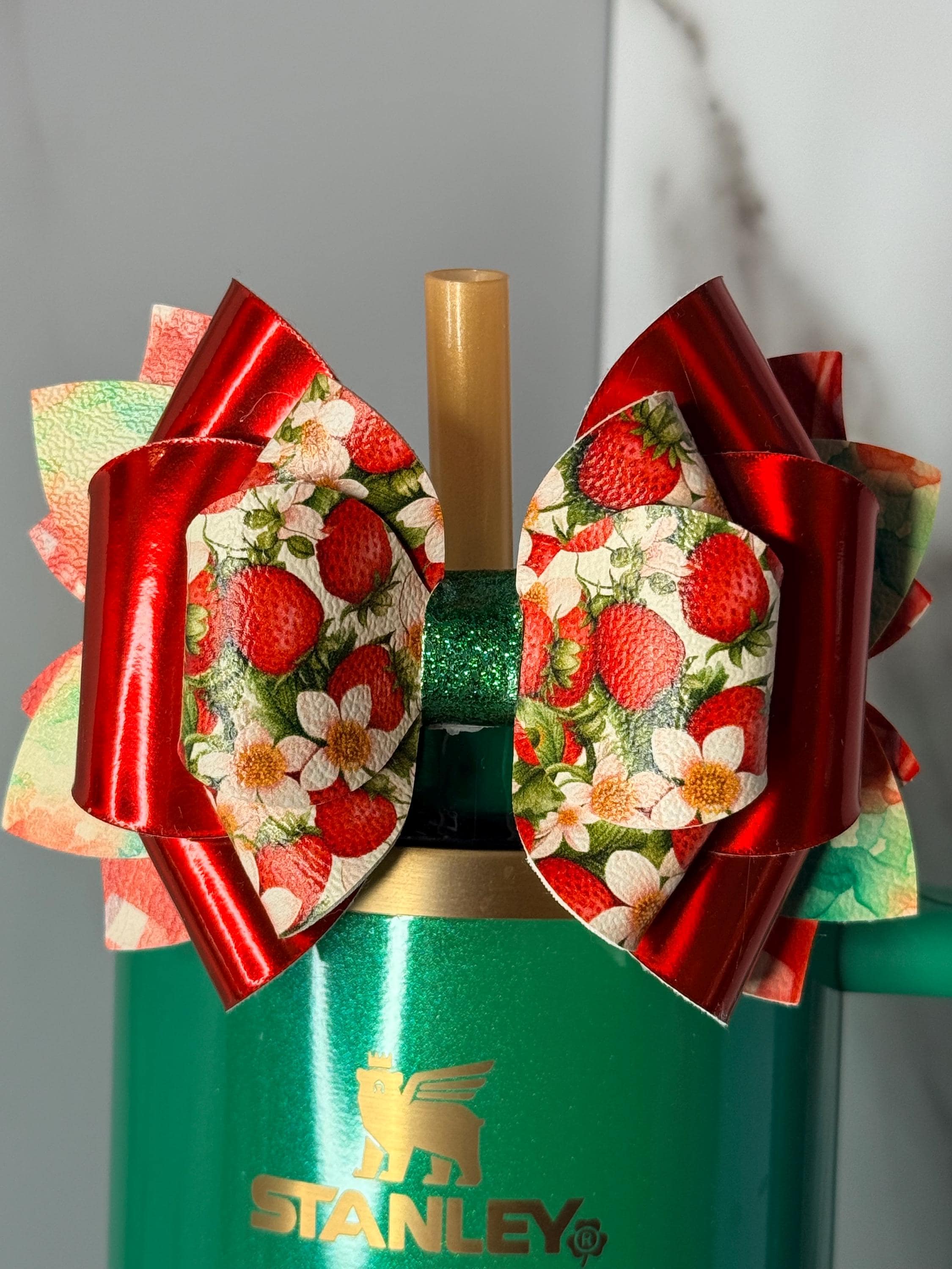 Brighten your drink with this strawberry-themed tumbler bow! Featuring glossy red vinyl, vibrant strawberry faux leather, and floral details — this bow is the perfect spring & summer accessory for your cup.