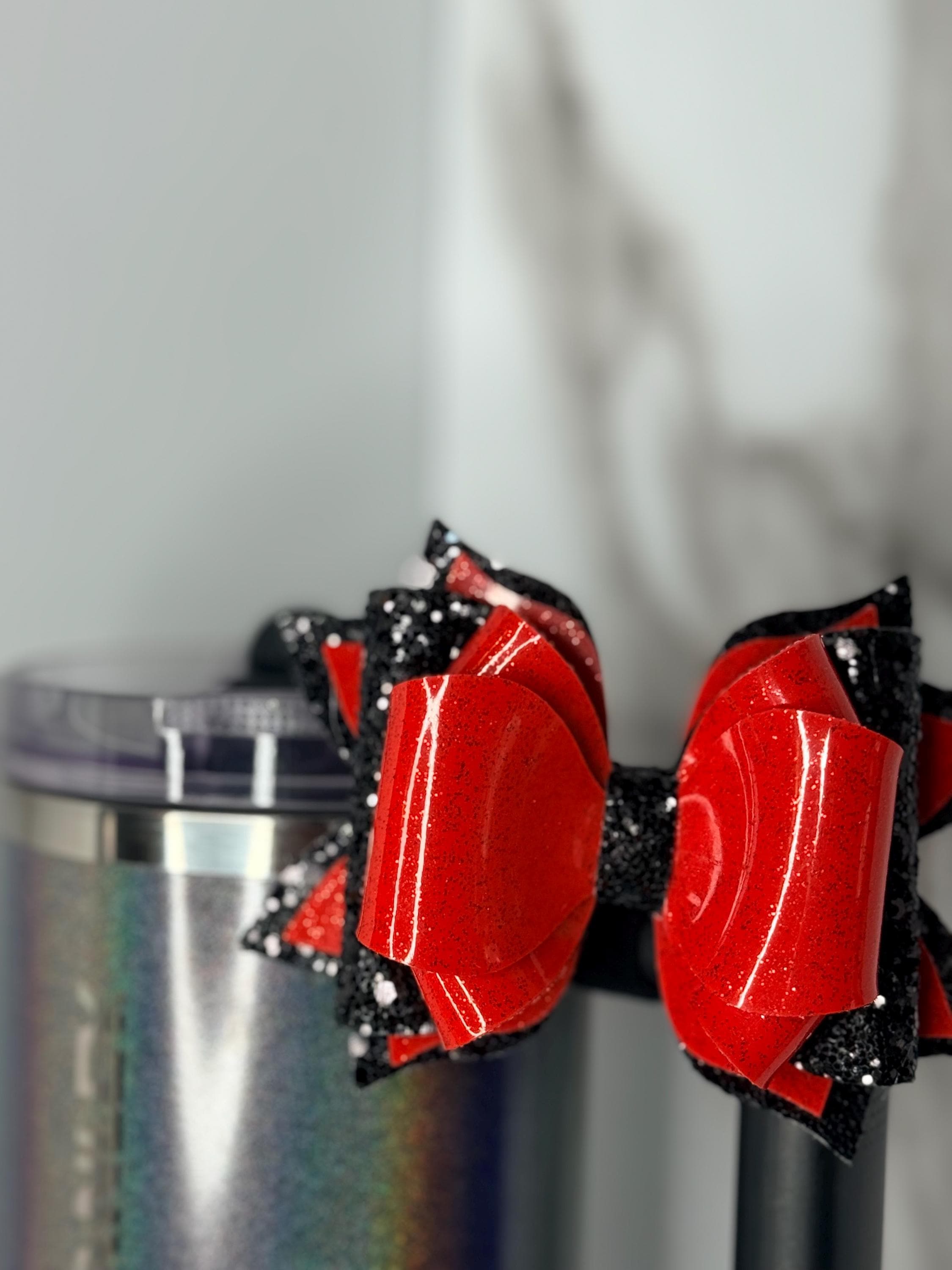 Bold, glittery, & eye-catching! This red and black glitter tumbler bow adds the perfect pop of color to your favorite cup. Featuring glossy red faux leather and black sparkle layers for a sleek Minnie-inspired or Valentine-ready look.