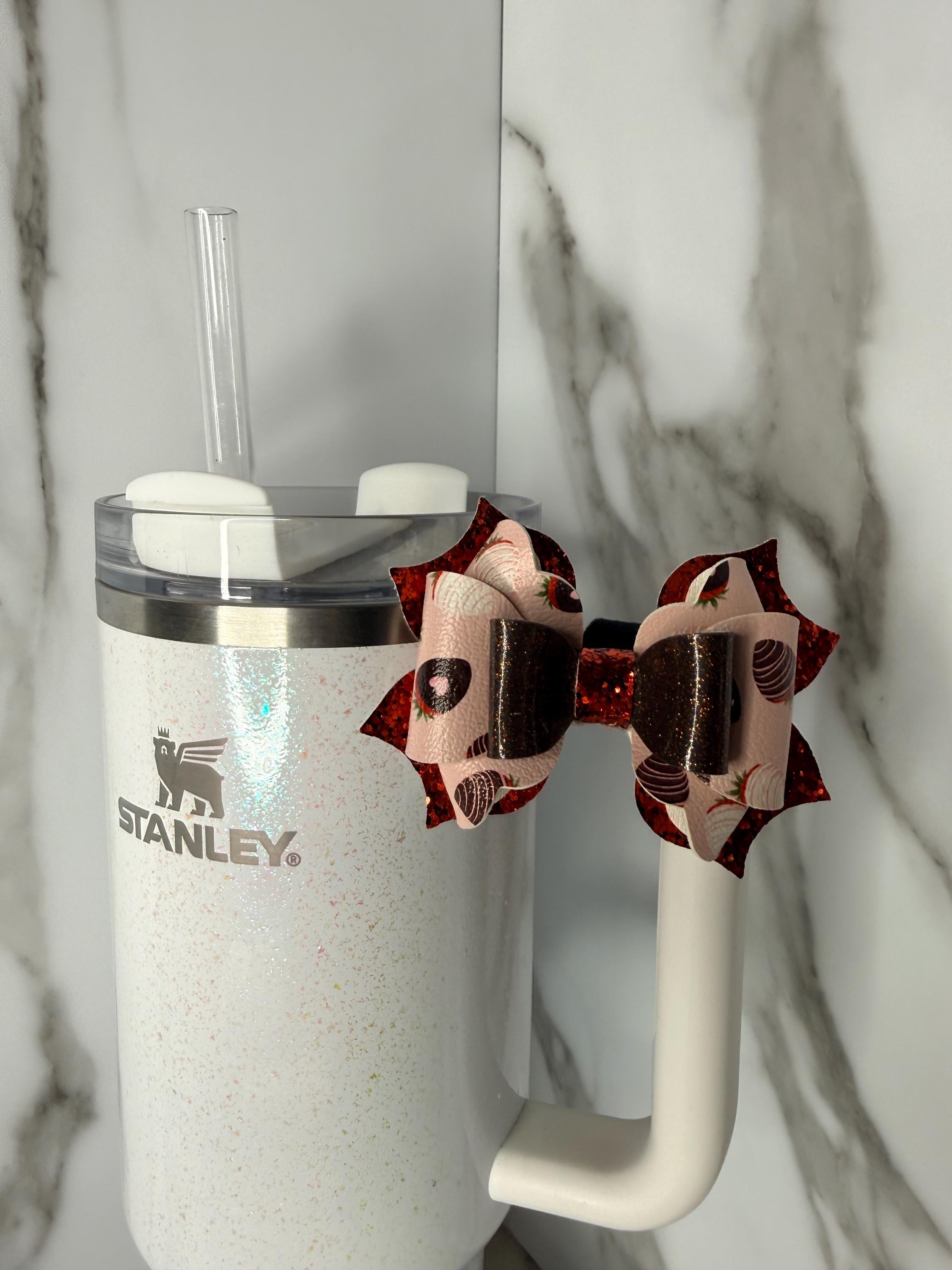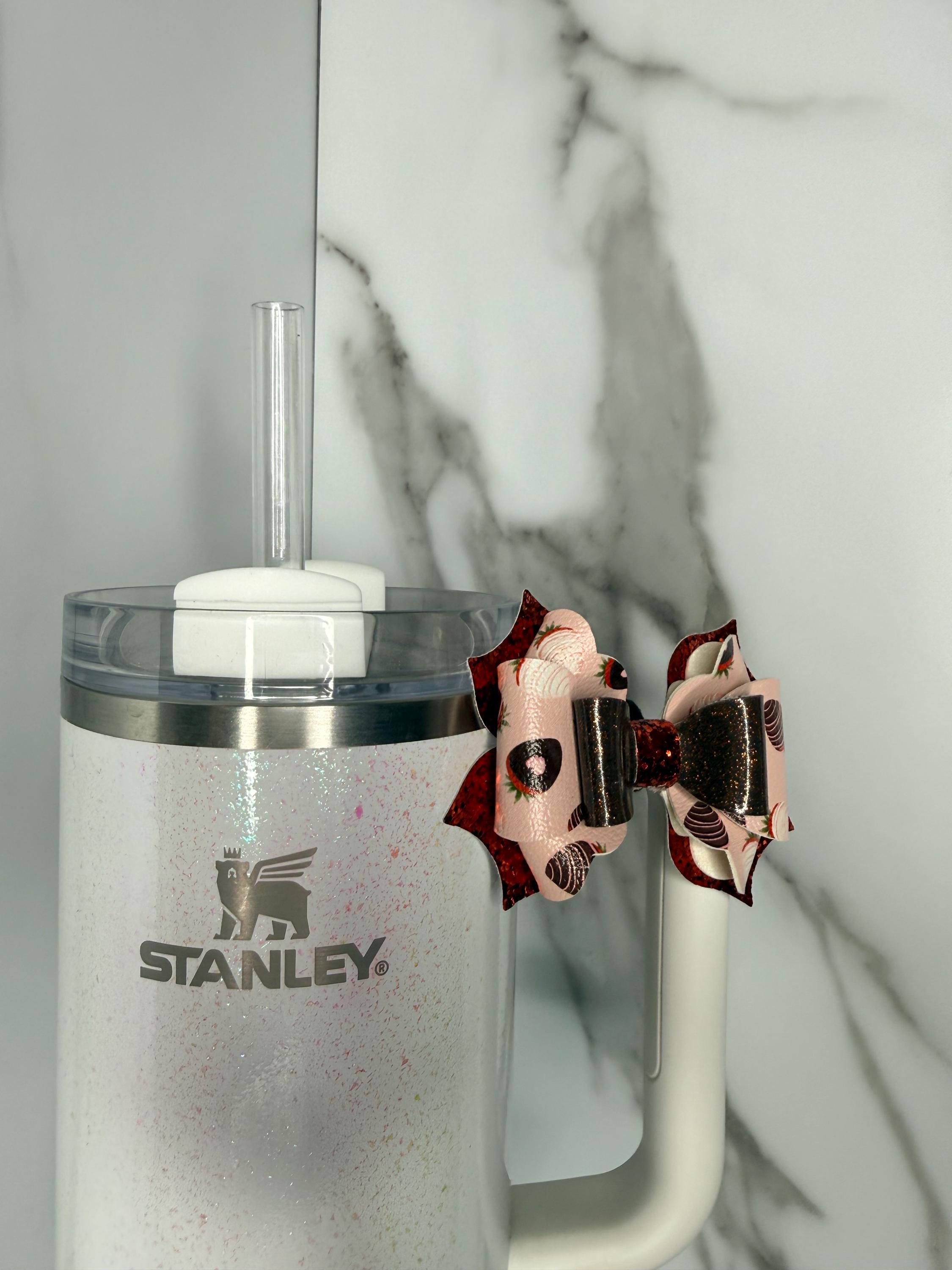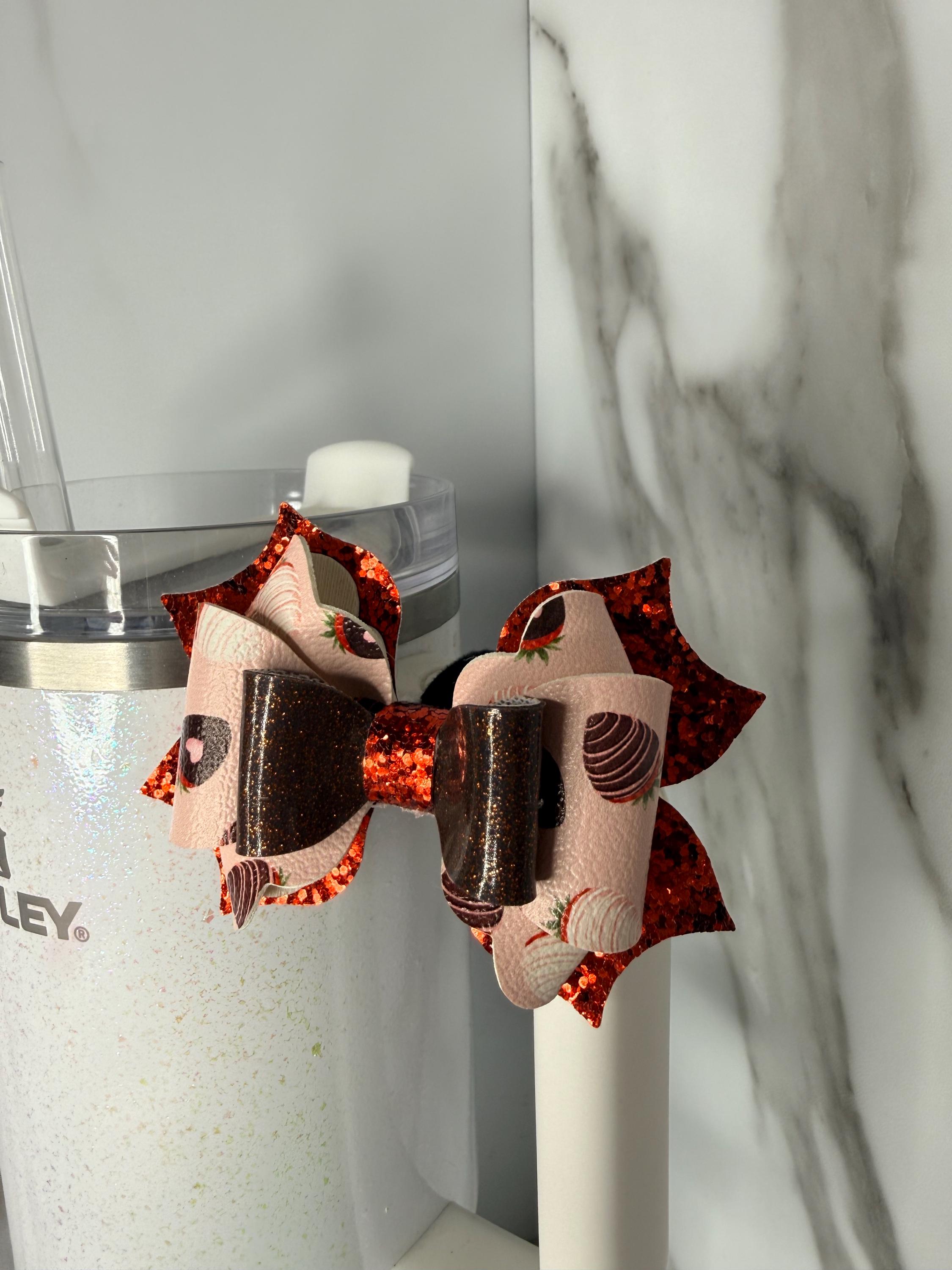 Sweeten up your cup with this chocolate dipped strawberry tumbler handle bow! Features glitter layers and dessert-themed faux leather for a fun and festive look.