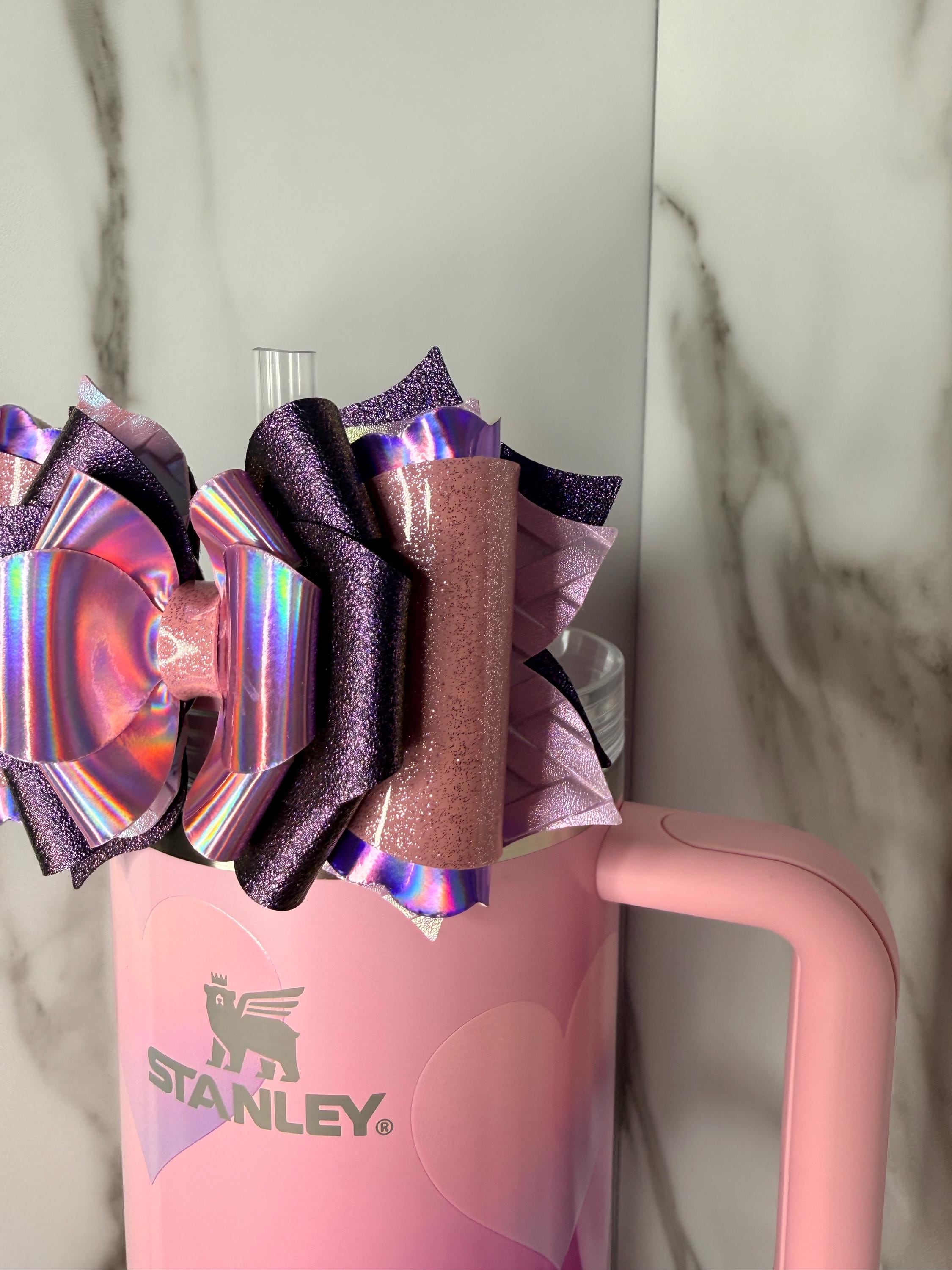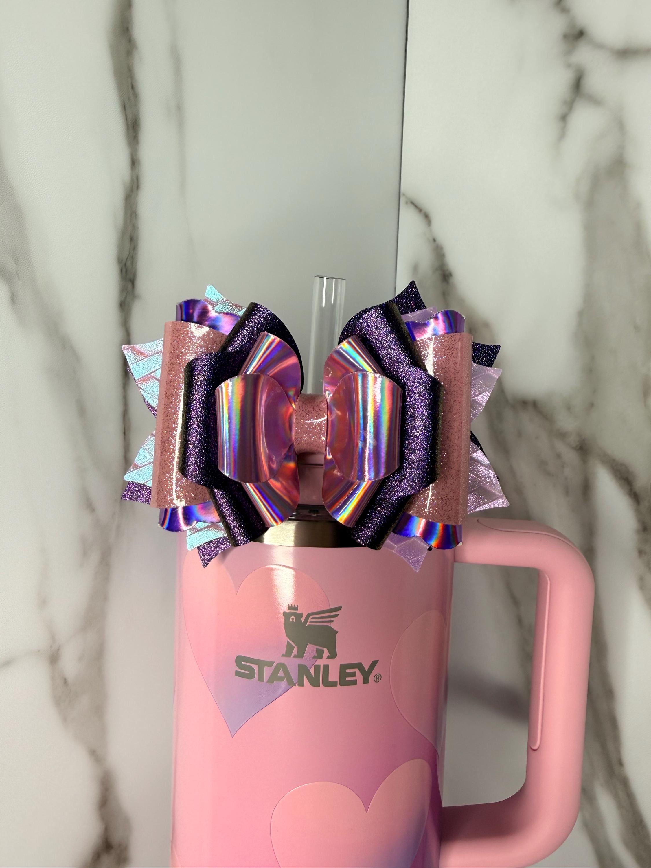 Stunning holographic galaxy colors collide in this purple and pink glitter tumbler bow! Fits most straw tumblers and adds a magical aesthetic sparkle wherever you go.