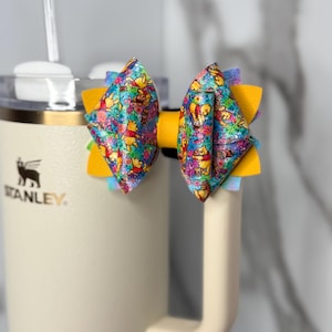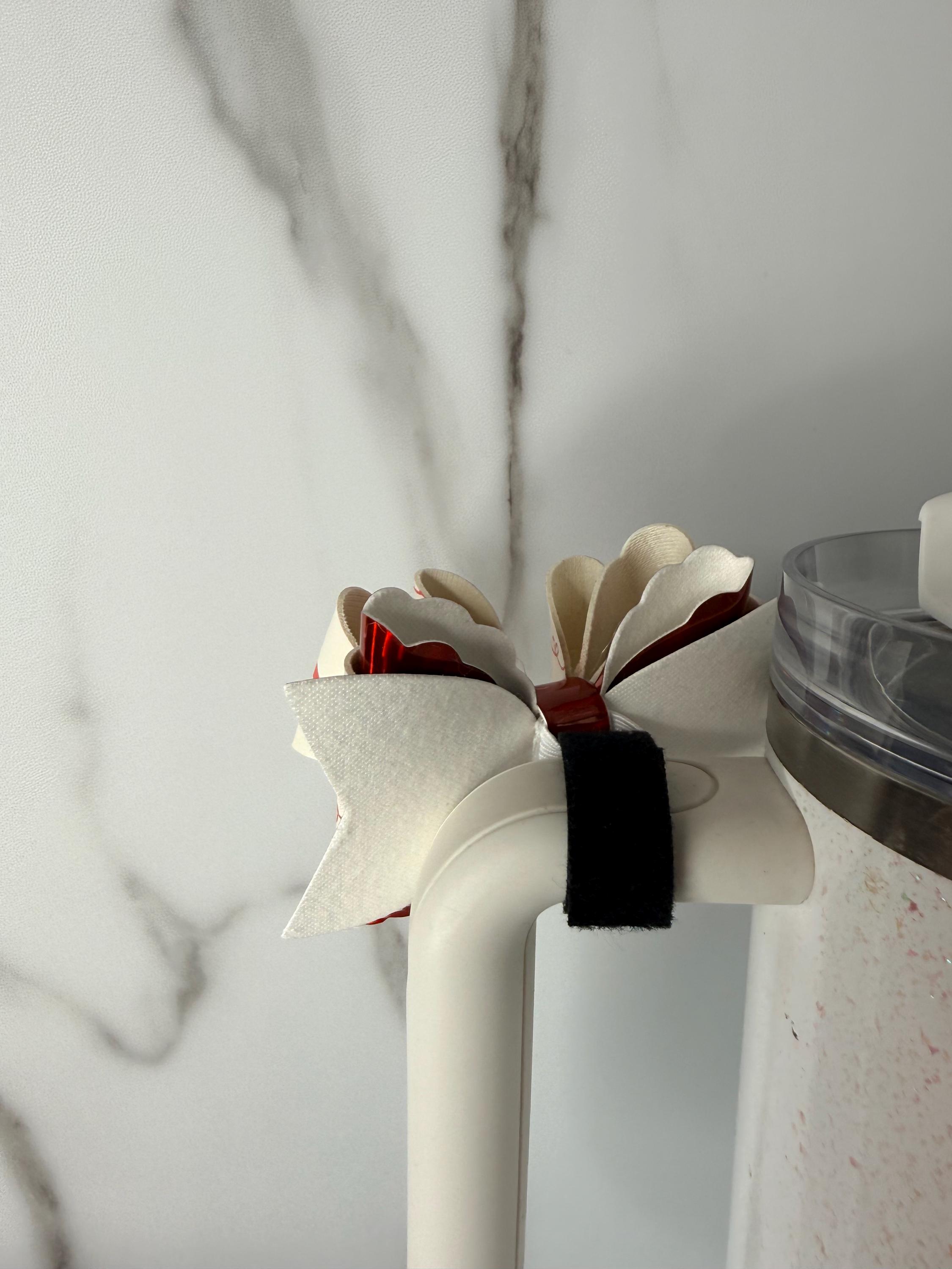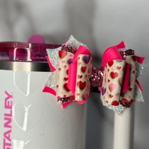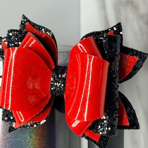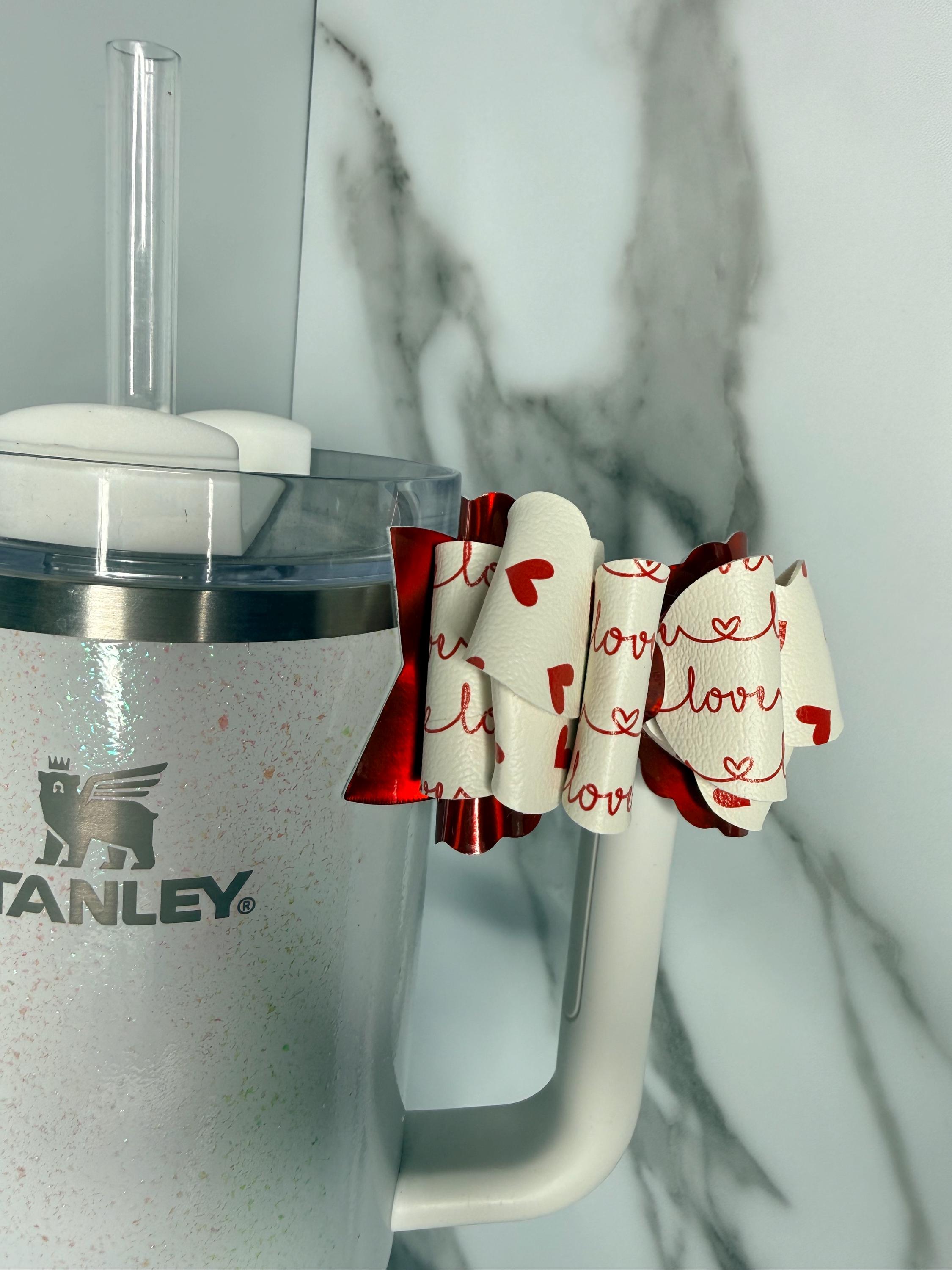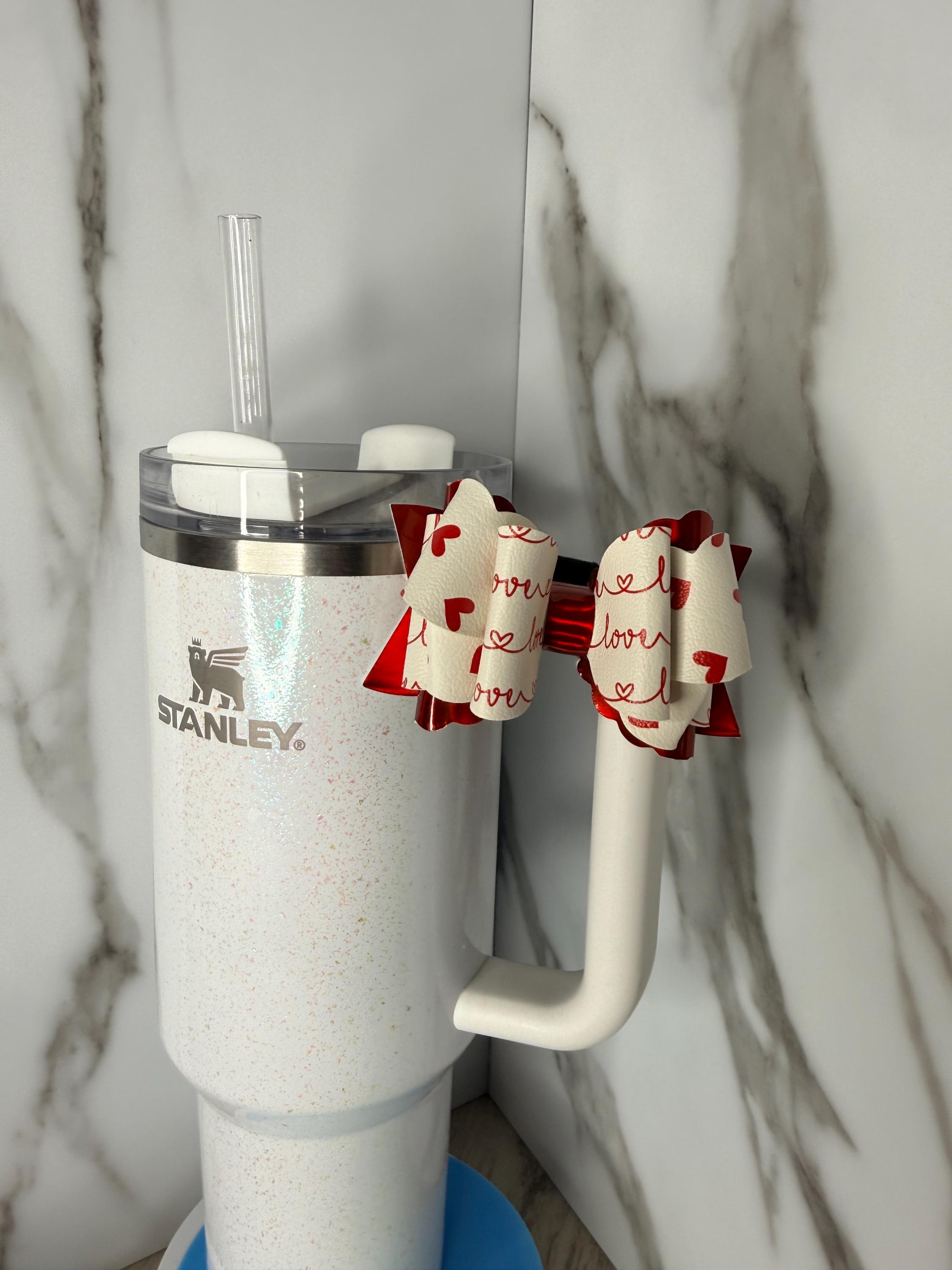 The perfect Valentine tumbler accessory! This red “Love” script handle bow features metallic red glitter accents and faux leather lettering — a cute and stylish way to personalize your daily cup.