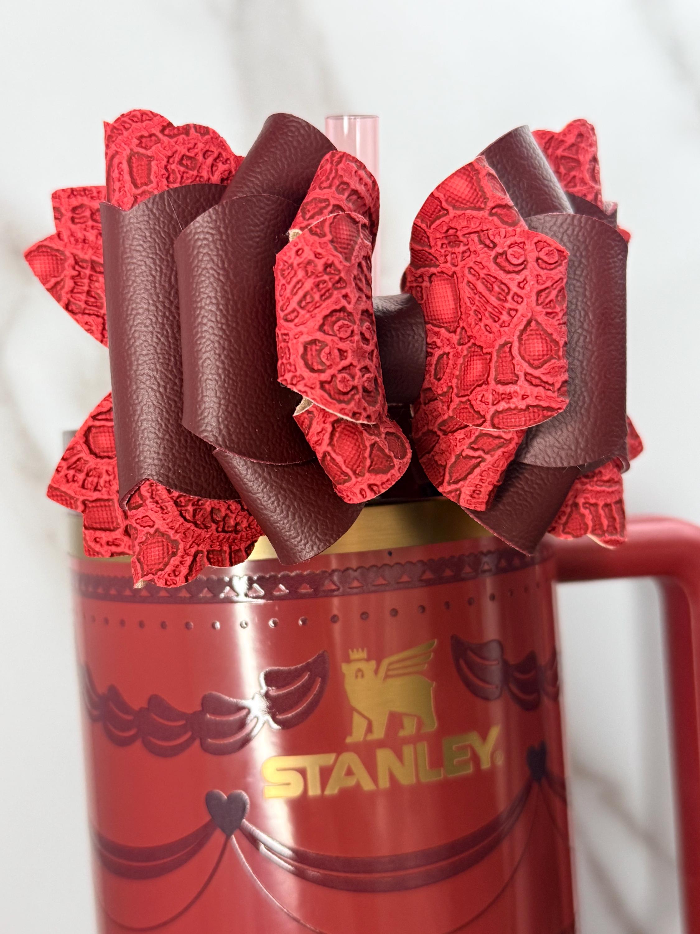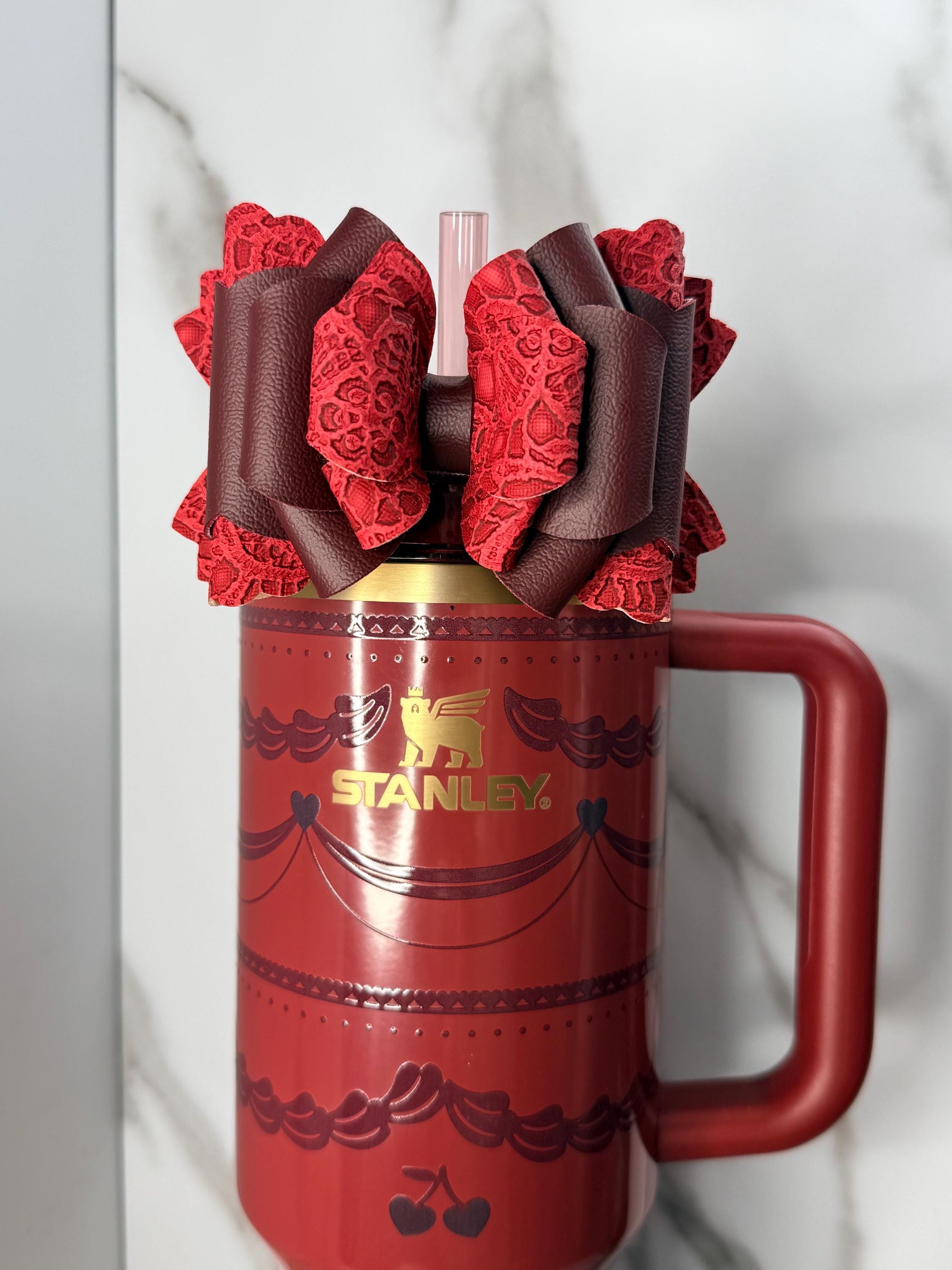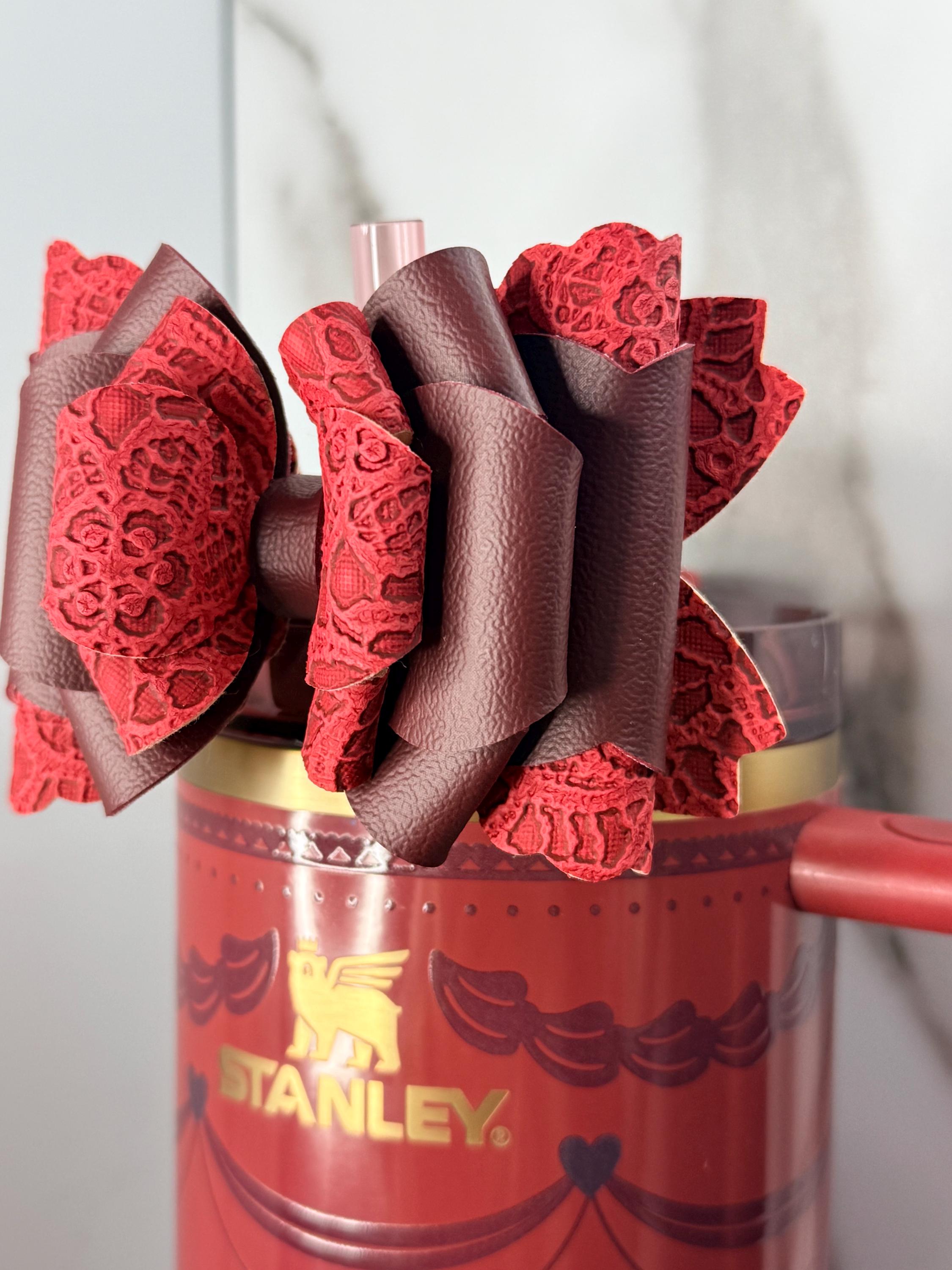 Add a touch of bold, romantic style to your favorite handled tumbler with this red lace & brown tumbler handle bow! Designed to fit Stanley cups and similar handled tumblers, this bow features durable faux leather paired with detailed lace texture for a unique & elevated look.