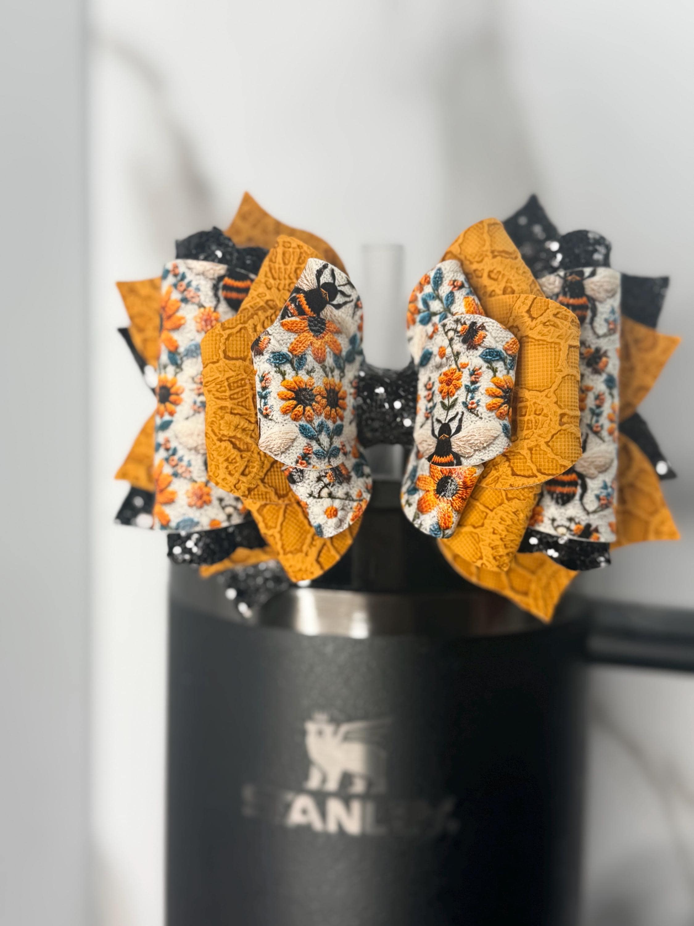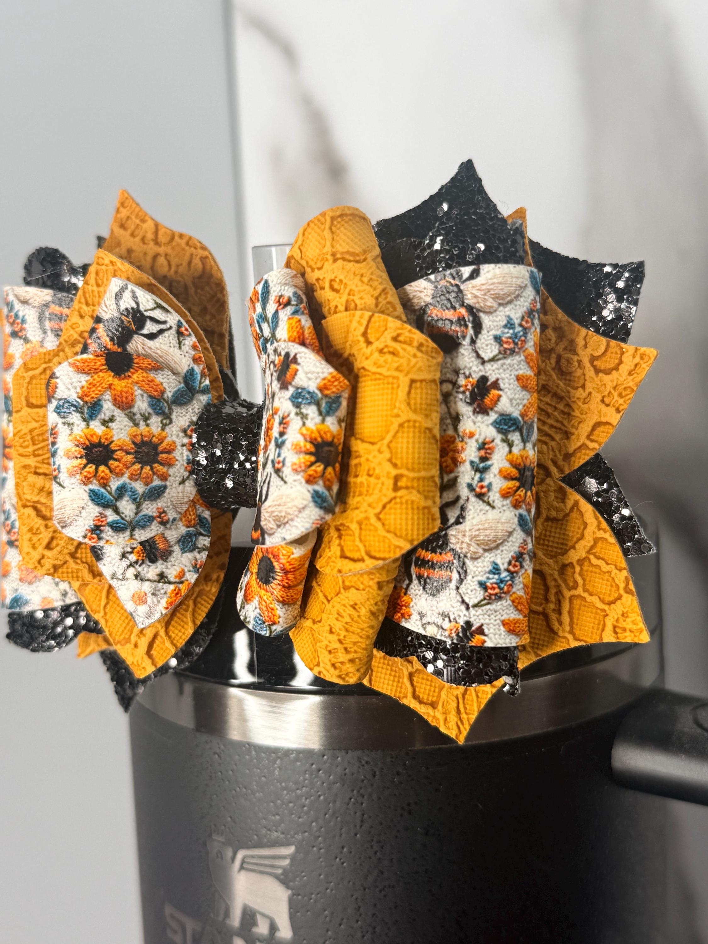 Add a touch of honeybee charm to your favorite tumbler! This gorgeous mustard sunflower and bee themed tumbler handle bow fits perfectly on Stanley style cups and other handled tumblers. Designed with layered textured faux leather and glitter accents for a bold, cute statement.