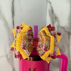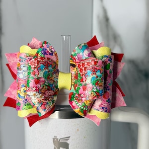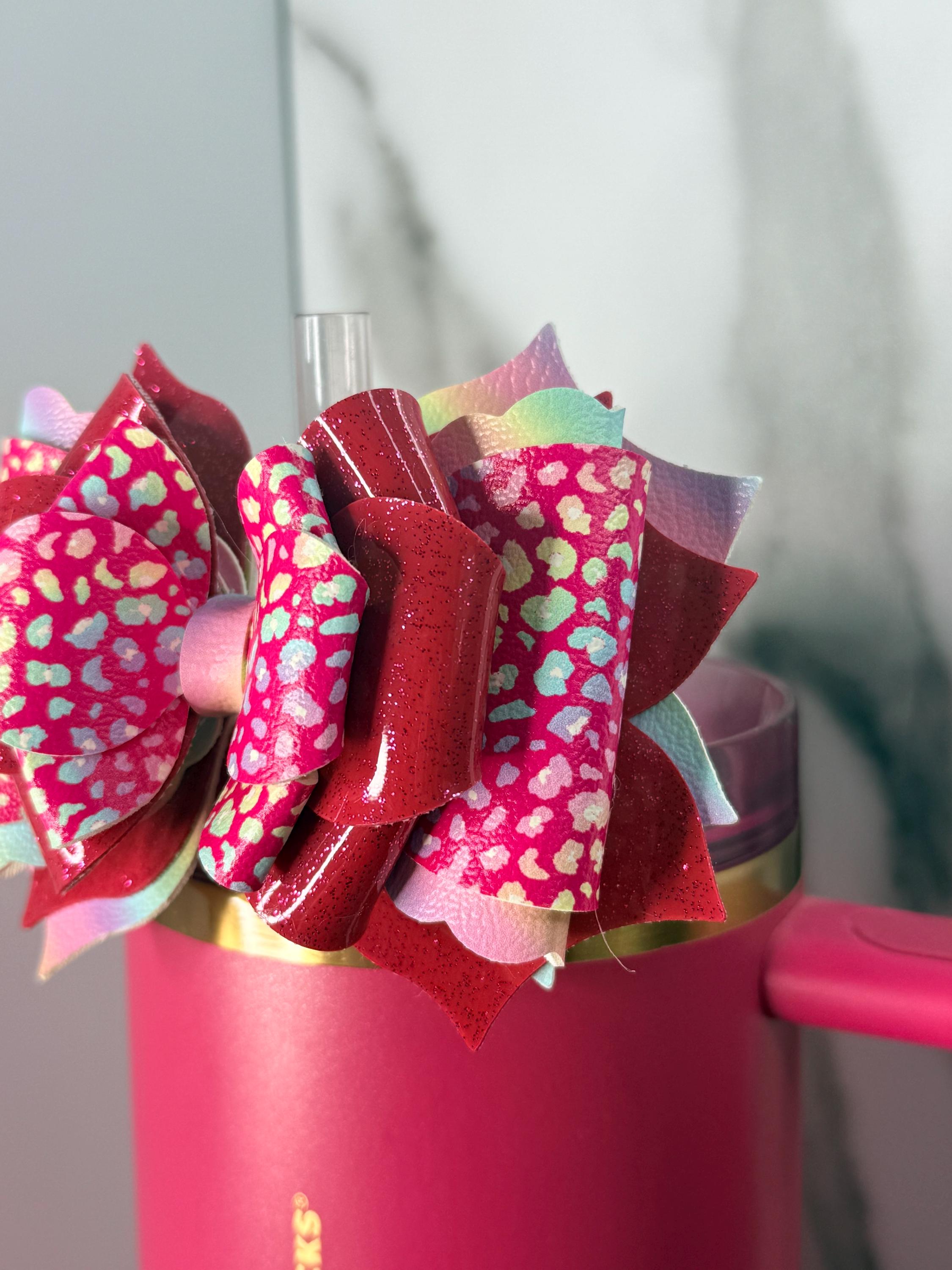 Bright, bold, and adorable! This neon rainbow heart tumbler bow instantly transforms your Stanley or favorite handled tumbler into a statement piece. Layered with faux leather and glitter for a fun, vibrant look.